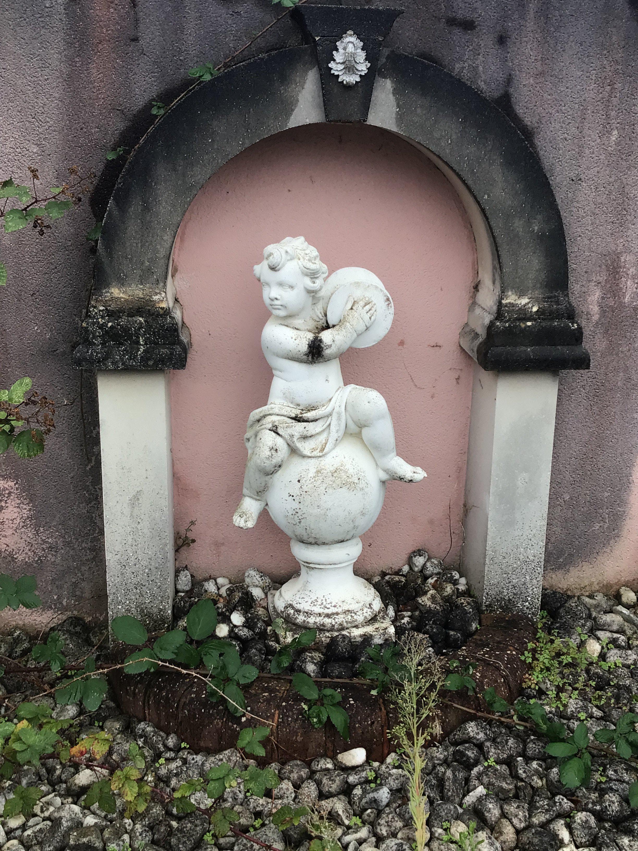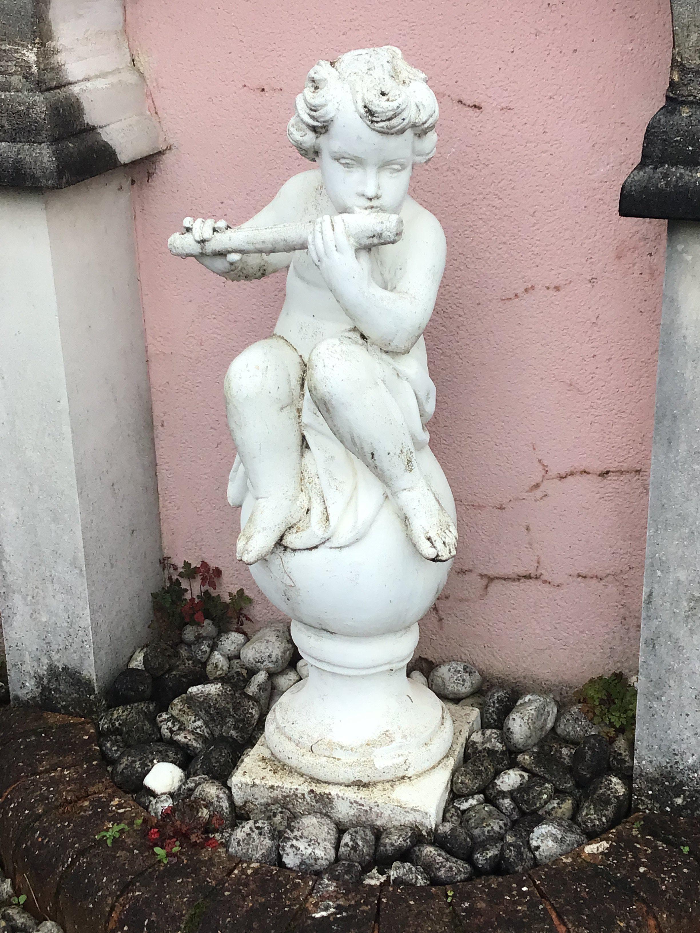 a set of four composition, concrete, neoclassical style garden ornaments in the form of putty, play musical instruments. Good condition sold in situ buyer to collect Height 94cm
