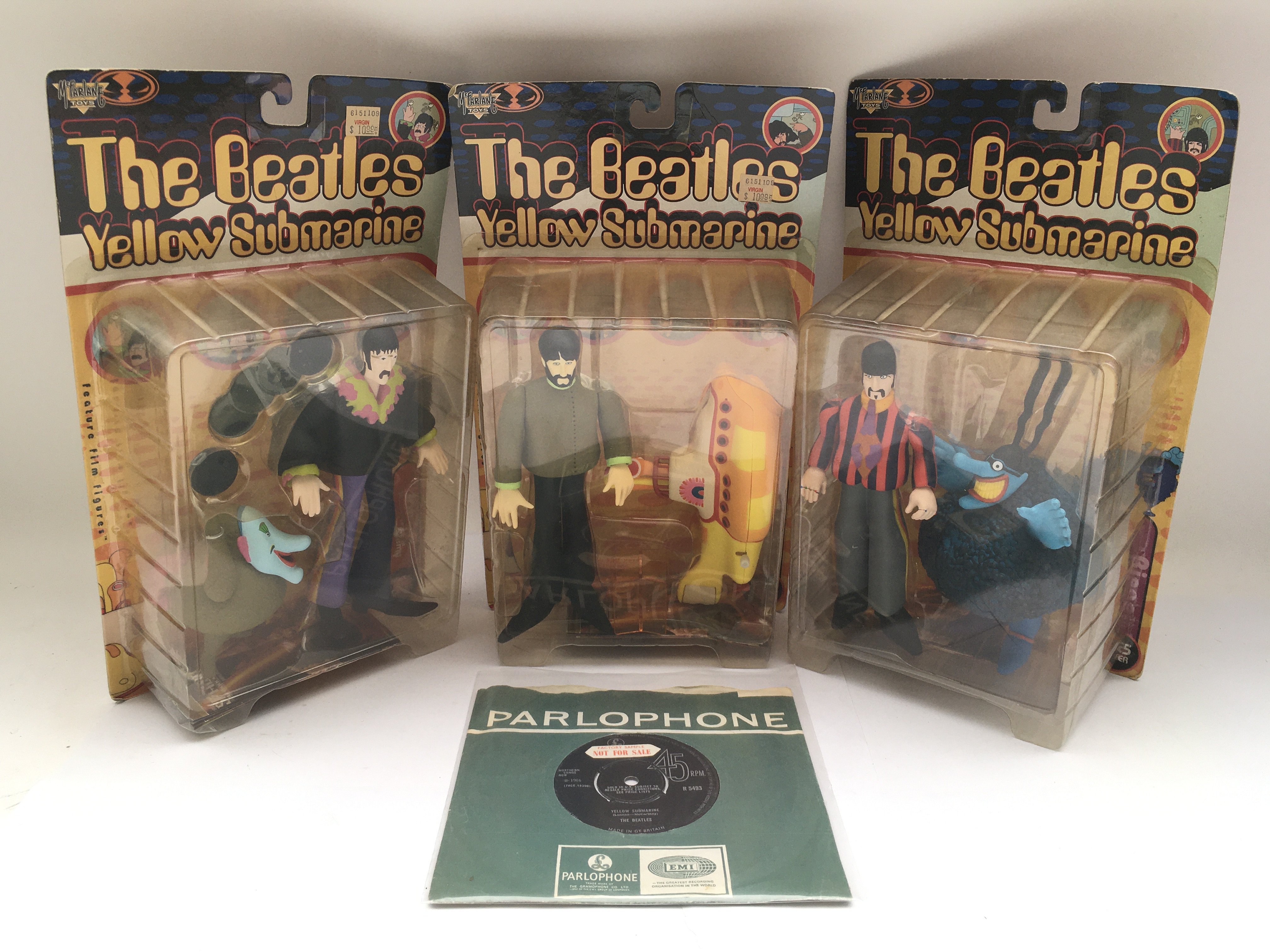 Three sealed McFarlane toys Beatles Yellow Submarine figures and a mint 'Yellow Submarine' 7" single.