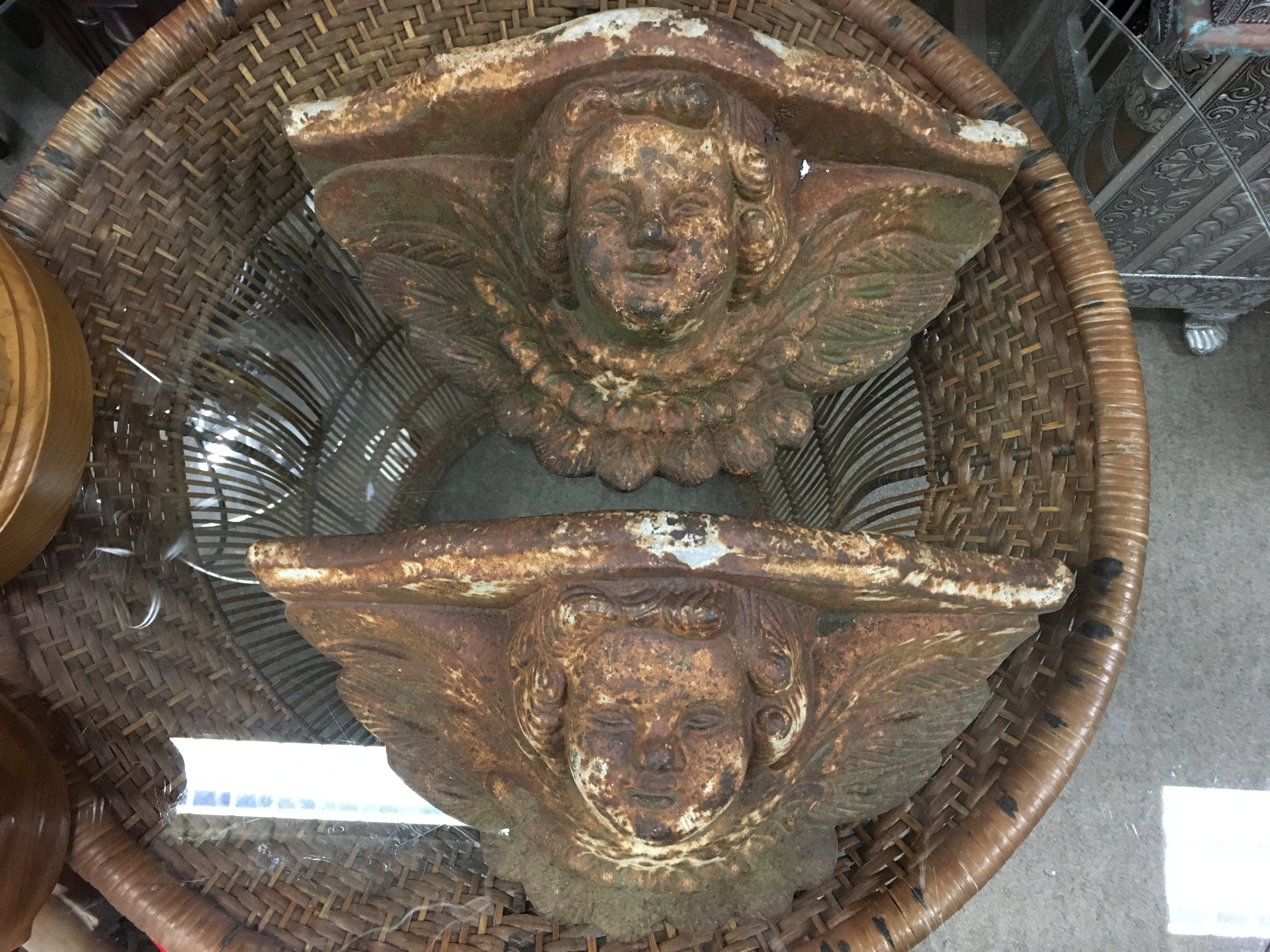 A pair of cherub cast iron wall planters, 34cm wide. This lot cannot be posted