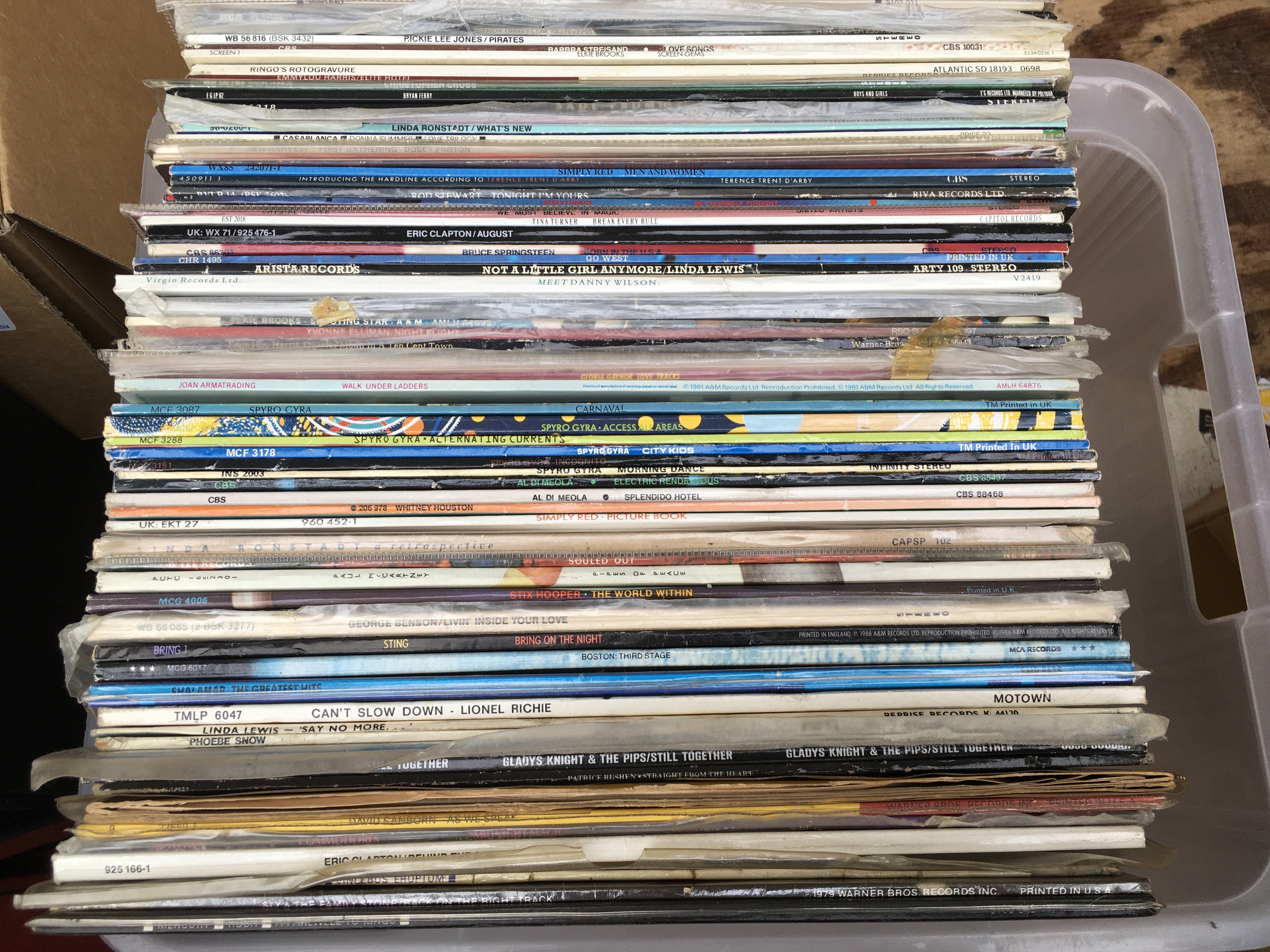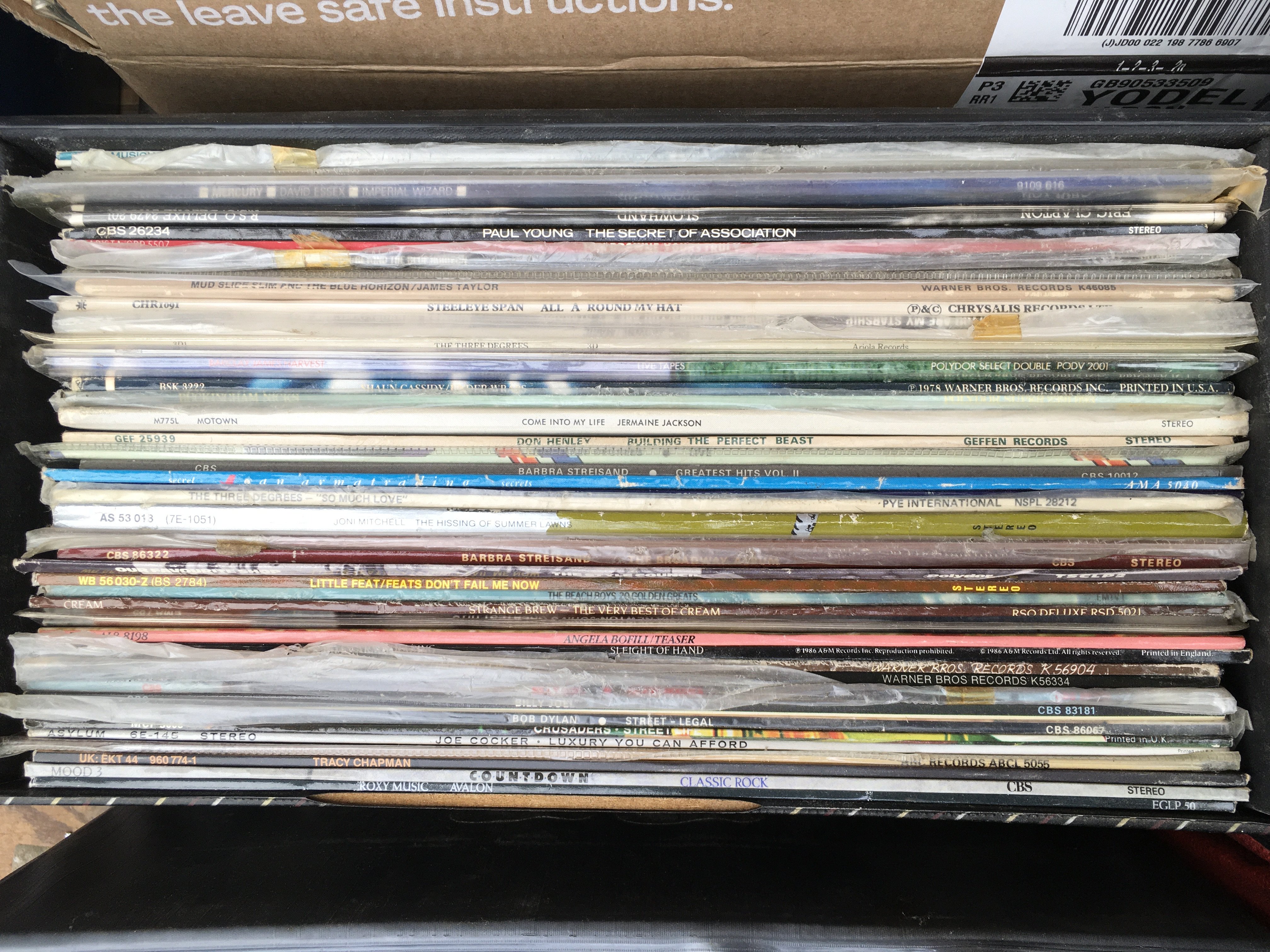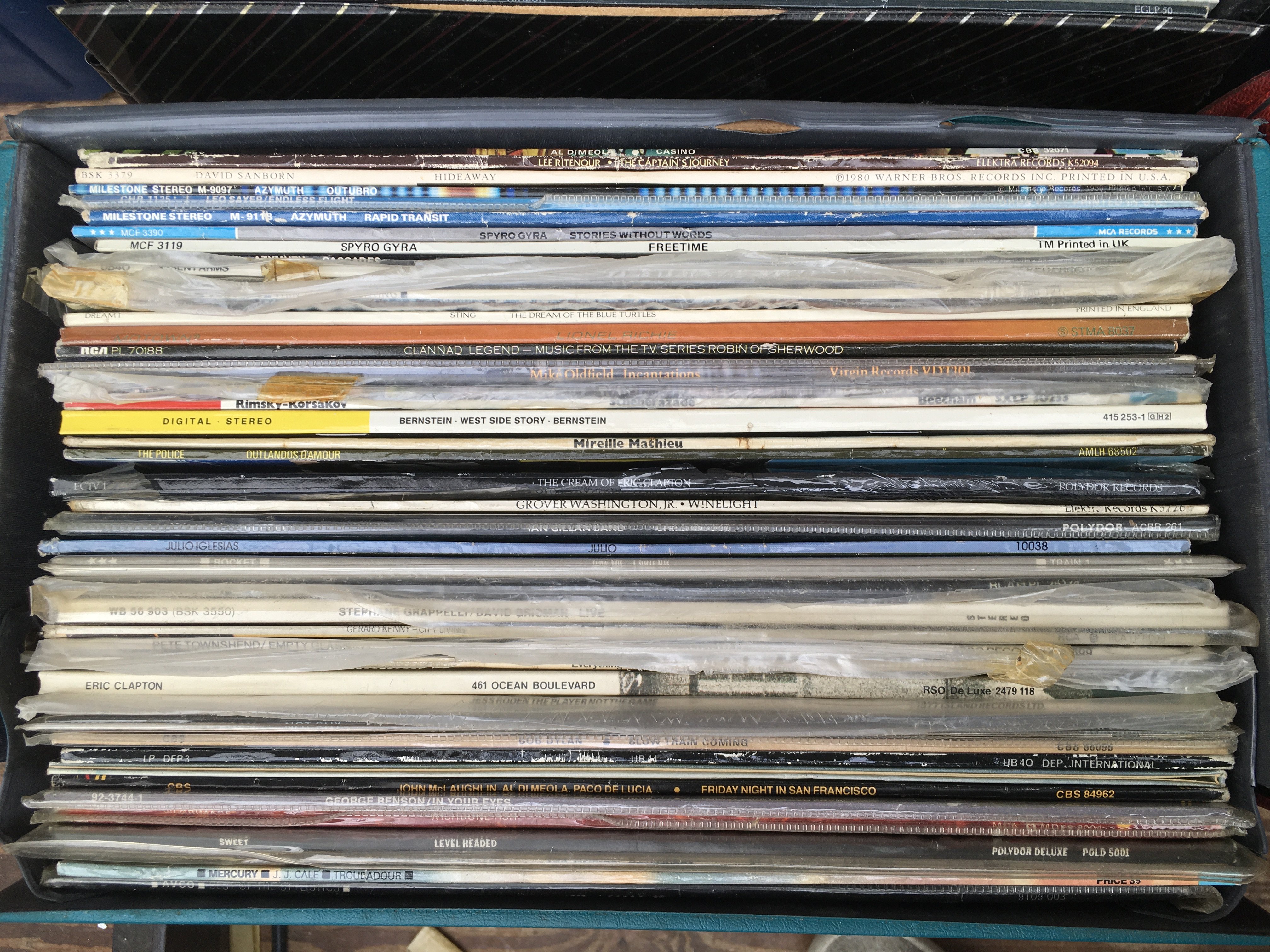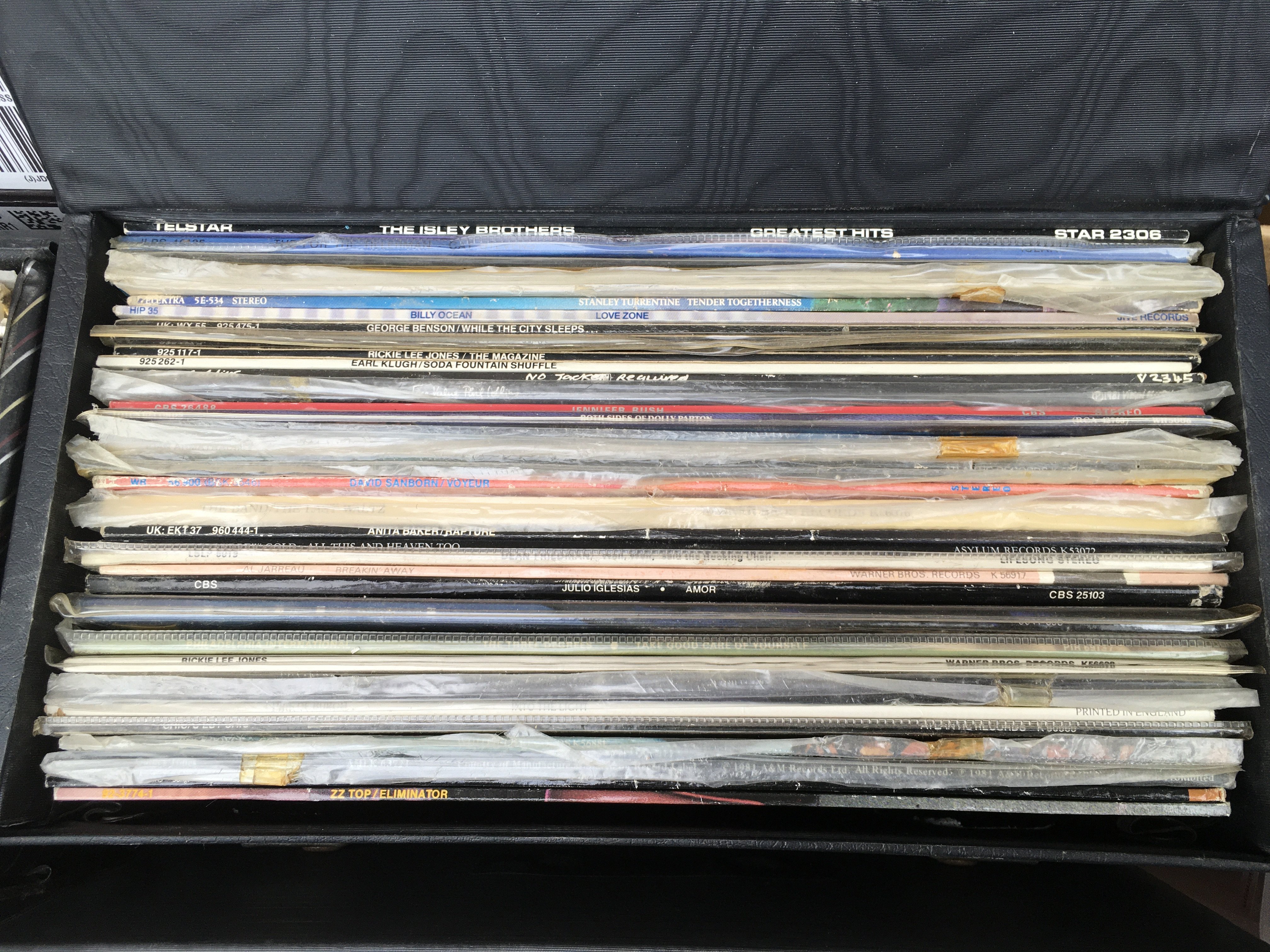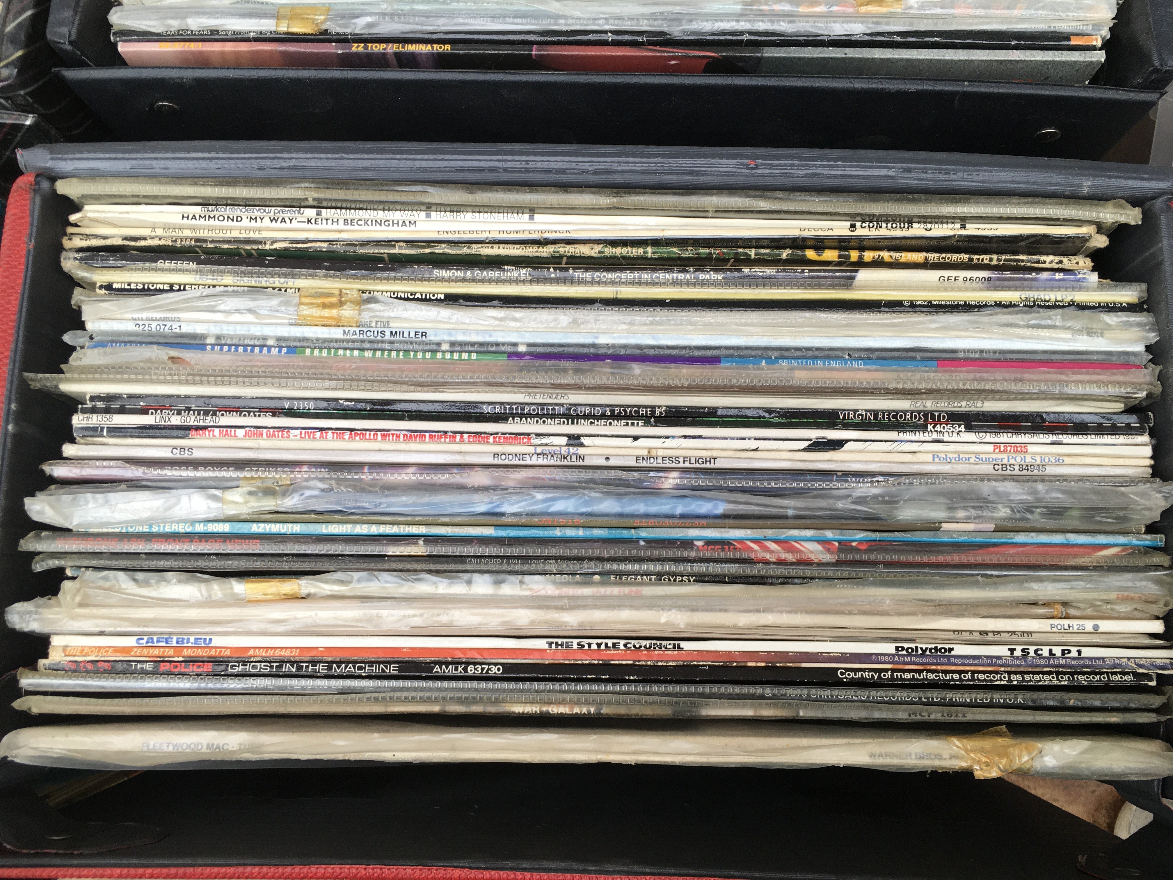 Four record cases and a box of LPs by various artists including Rush, War, a Little Feat, Bruce Springsteen and many more (5).