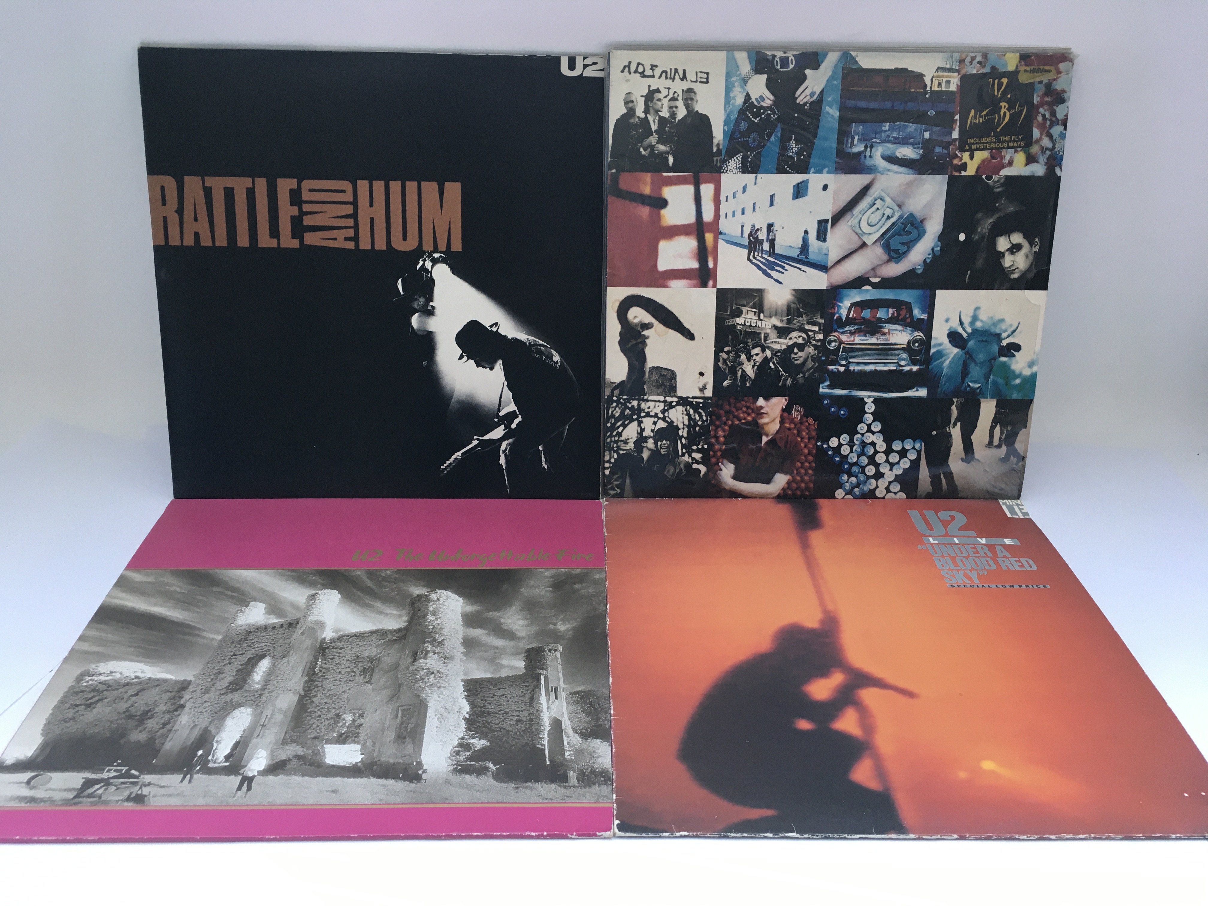 Four U2 LPs comprising 'Achtung Baby', 'Rattle And Hum', 'Under A Blood Red Sky' and The Unforgettable Fire'.