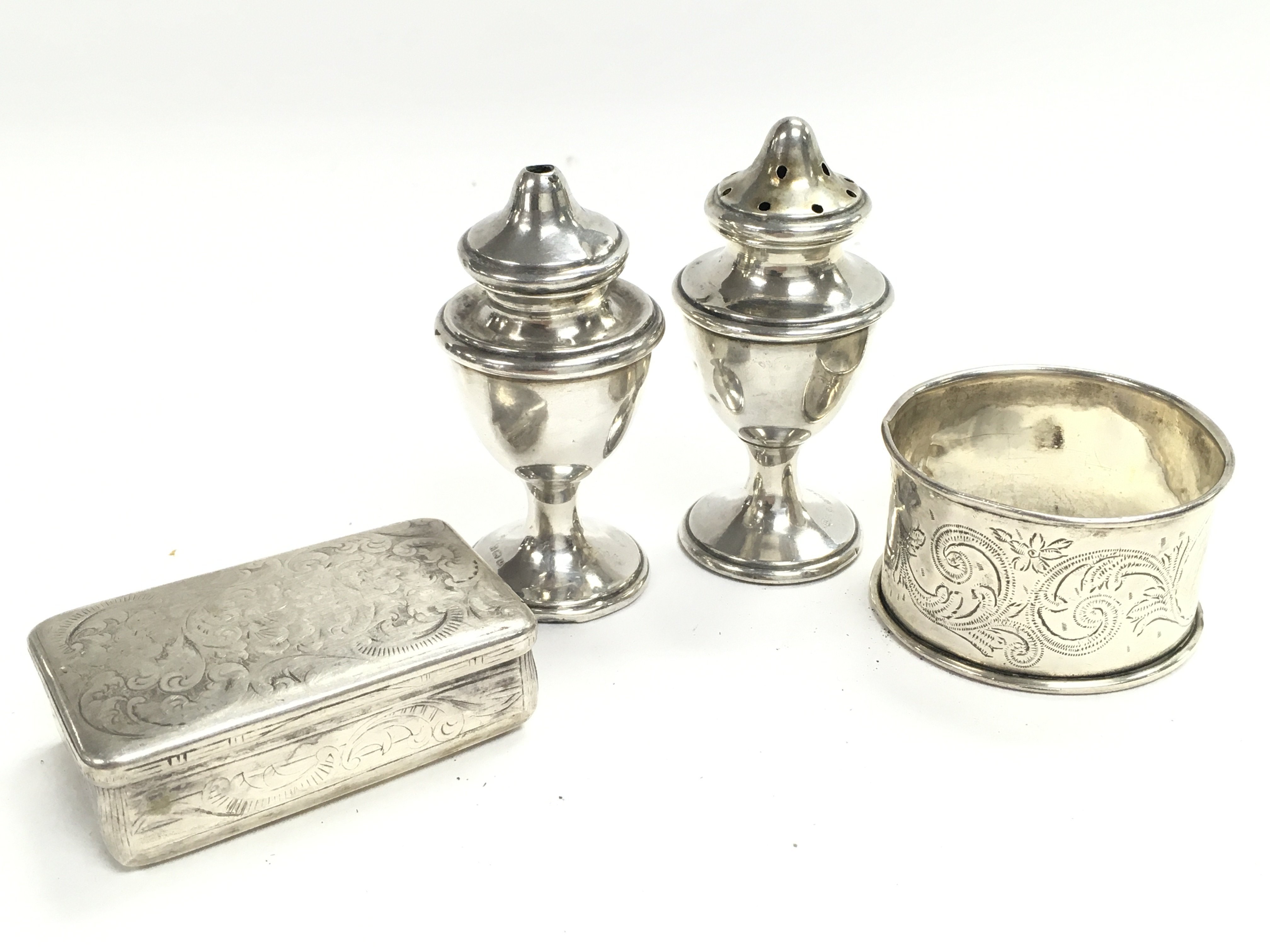 A Collection on silver items including a snuff box, napkin ring and shakers. Postage category A