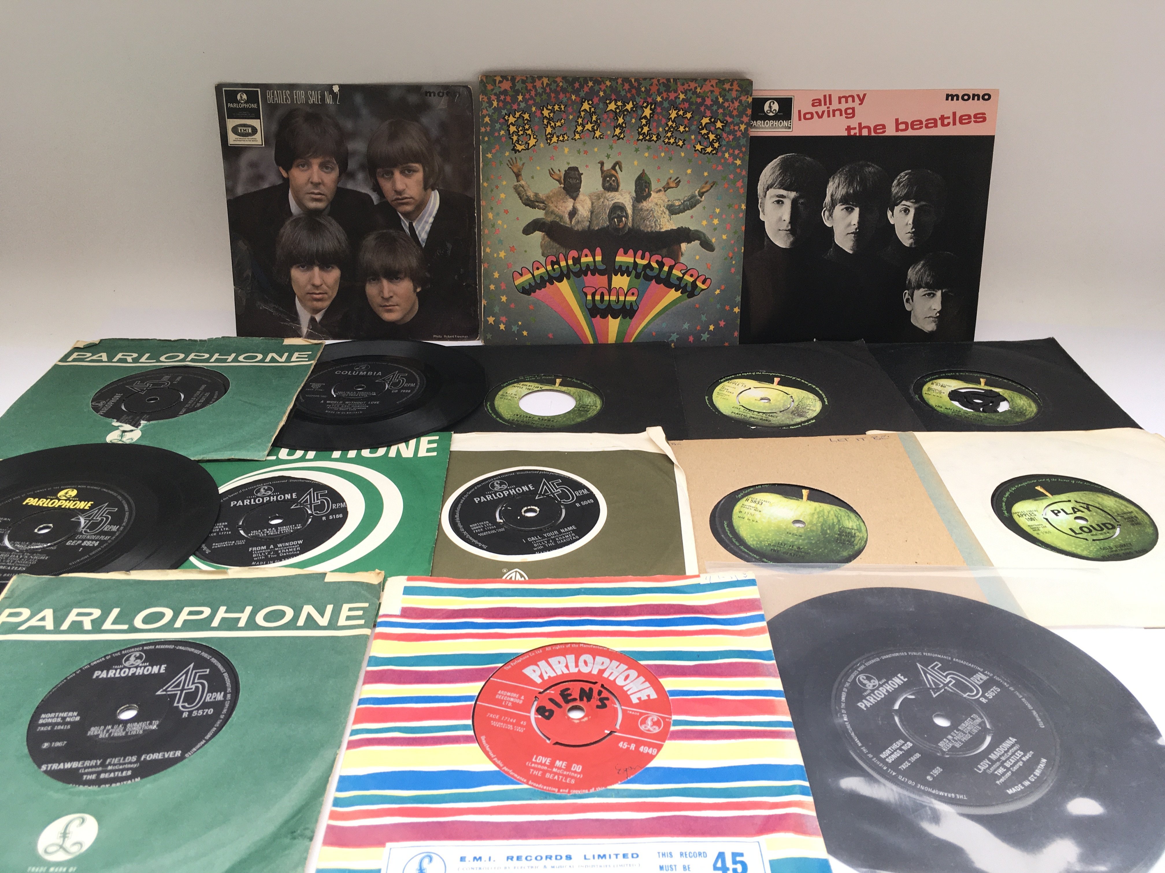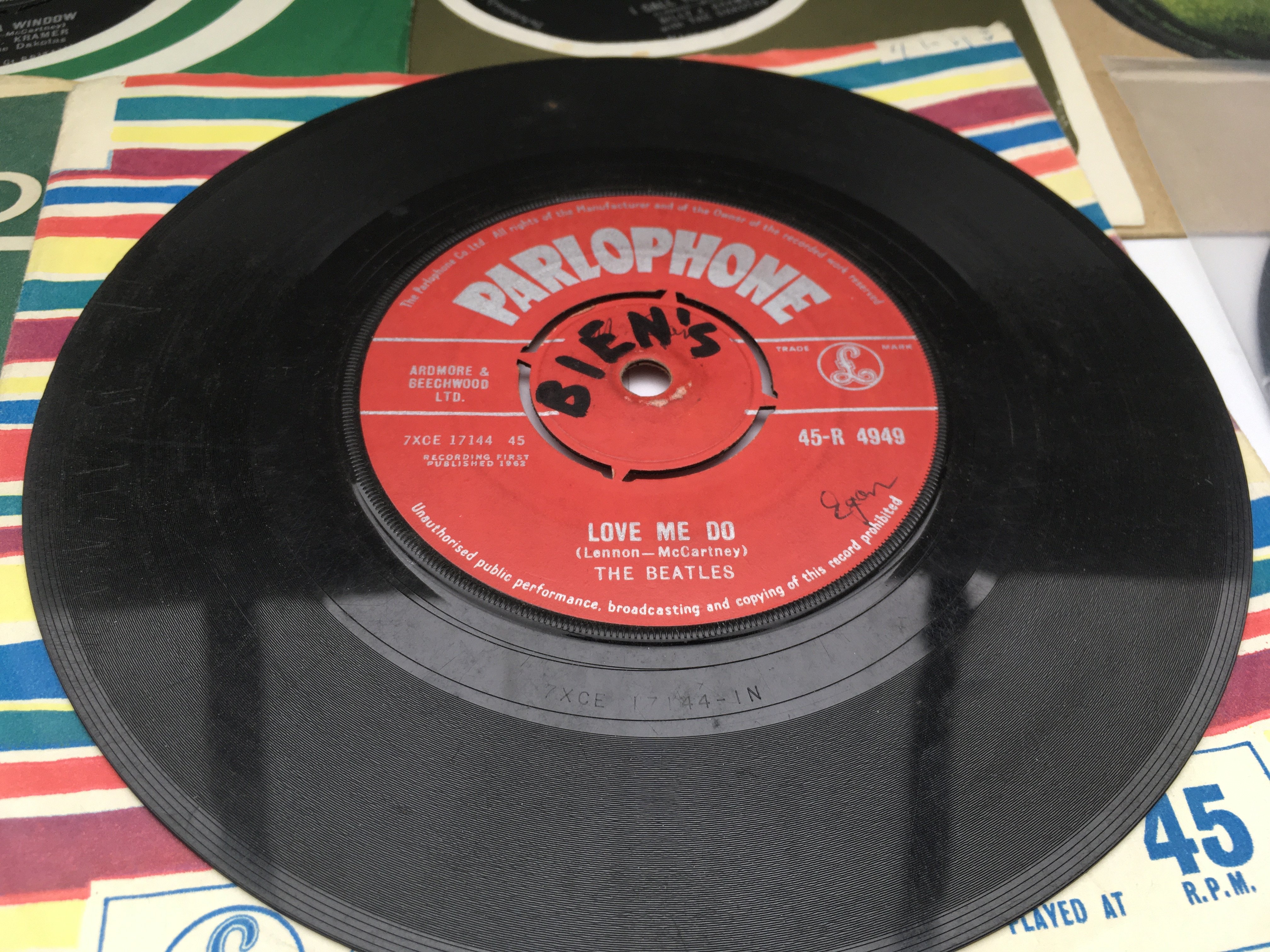 A collection of Beatles and related 7" singles and EPs including a first UK red label pressing of 'Love Me Do', 'Beatles For Sale No 2 EP', 'Instant Karma' French pressing and others.
