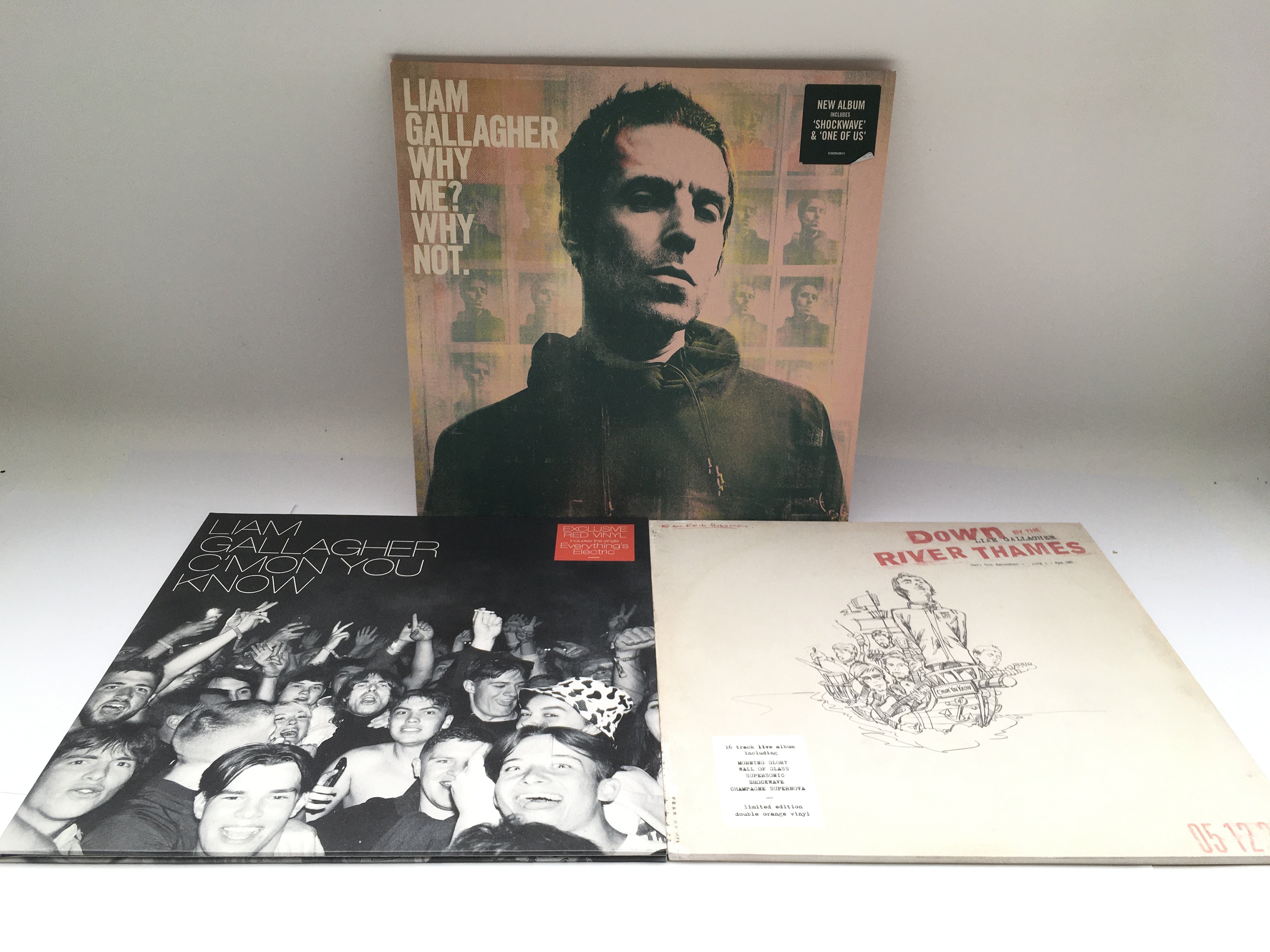 Three Liam Gallagher LPs comprising a red vinyl 'C'mon You Know', Why Me? Why Not' and 'Down By The River Thames' on limited edition orange vinyl.