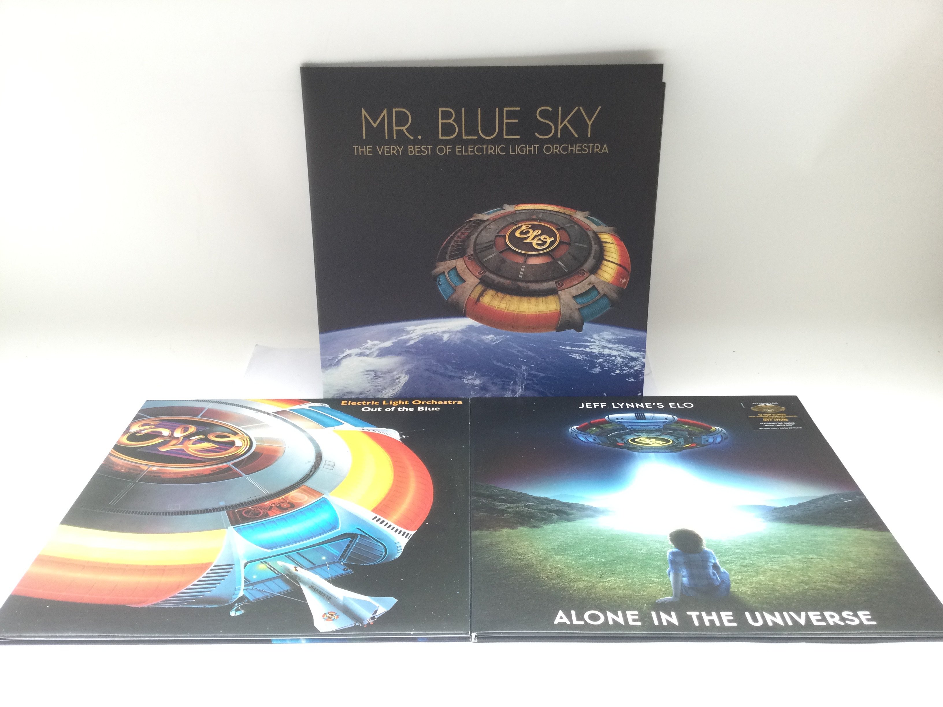 Three ELO LPs pressed on 180g vinyl comprising 'Mr Blue Sky - The Very Best Of ELO', 'Out Of The Blue' and 'Alone In The Universe'.