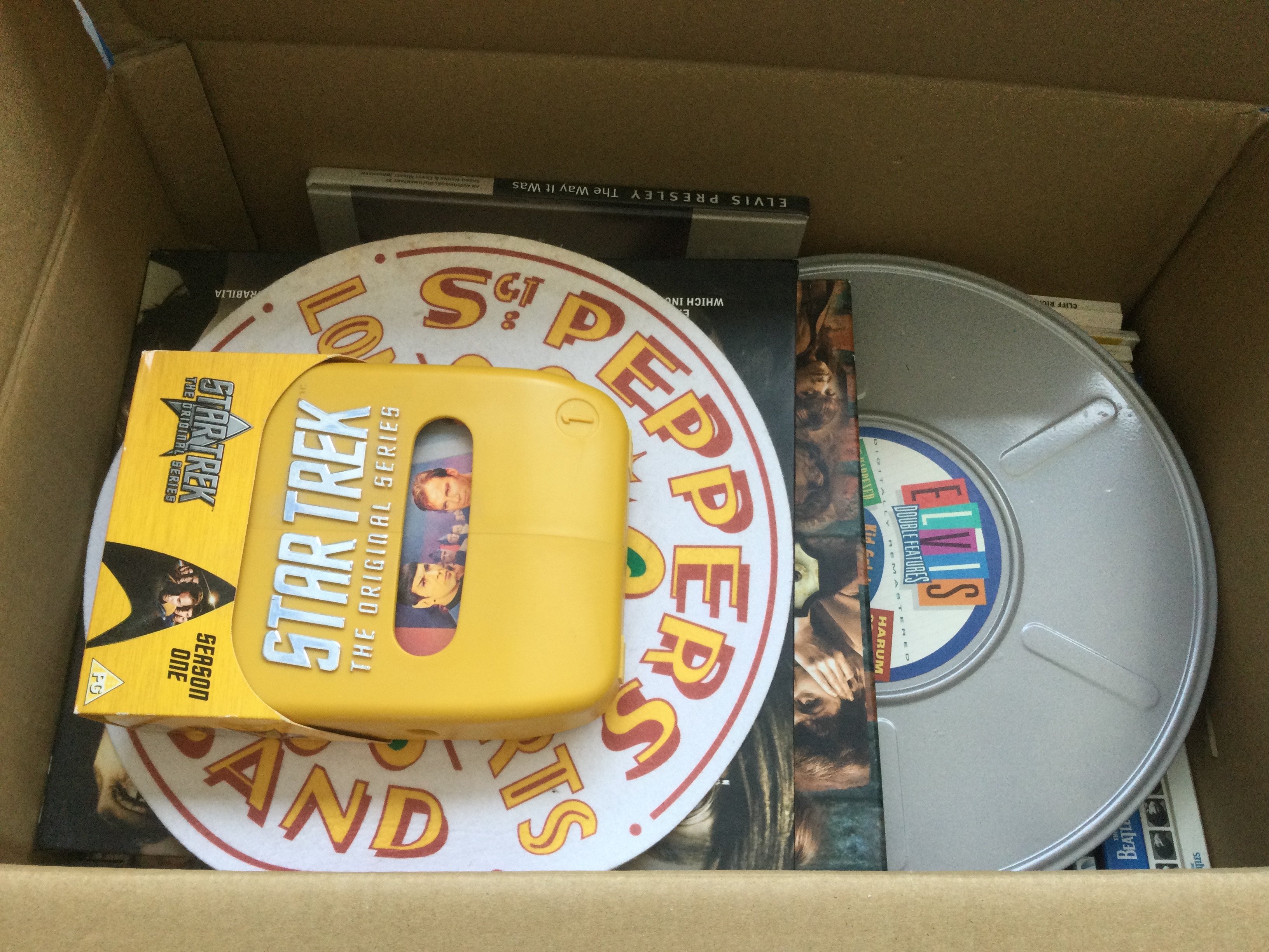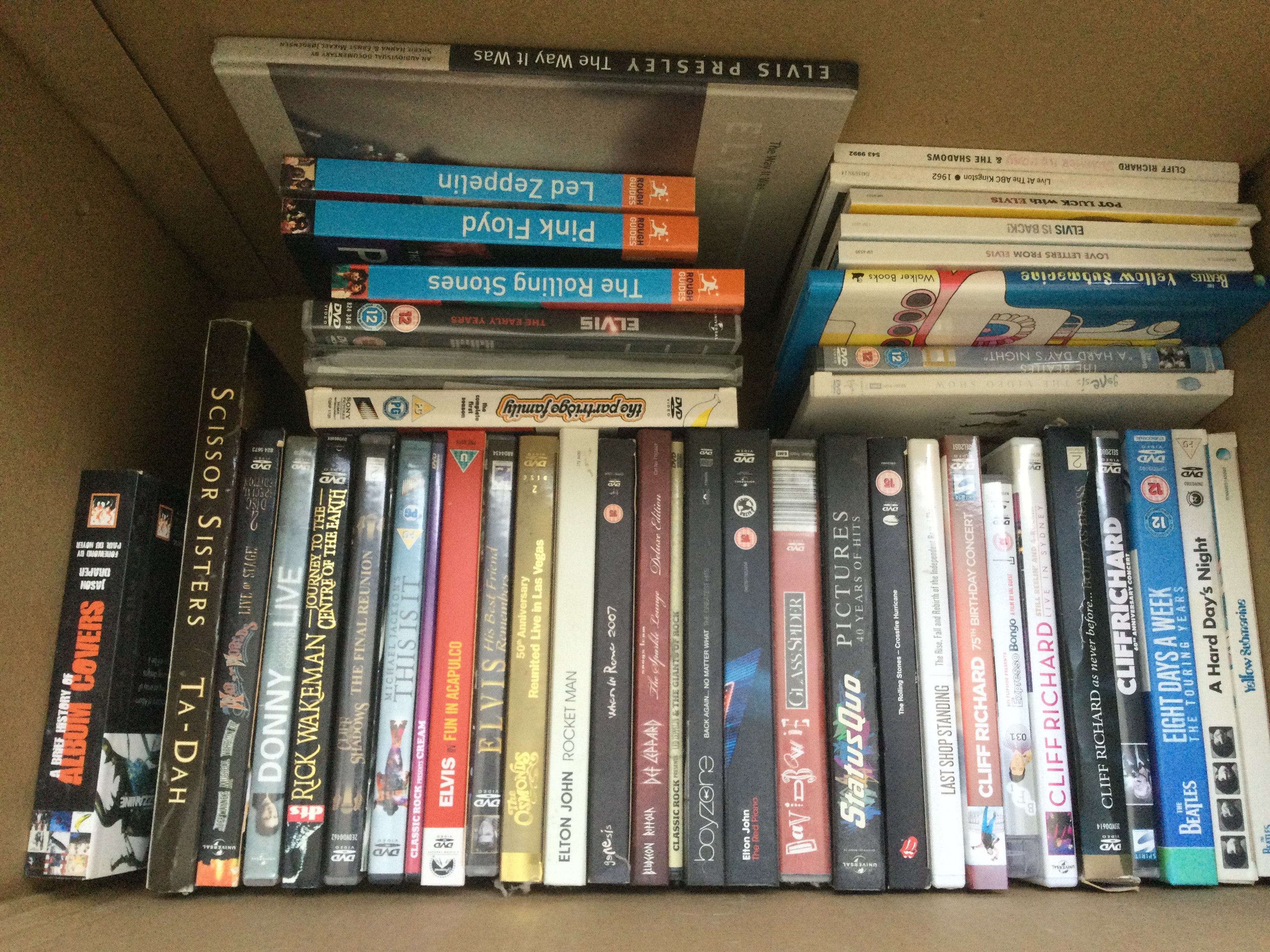 A box of music DVDs, CD box sets and books by various artists including The Beatles, Elvis Presley, Elton John and others.