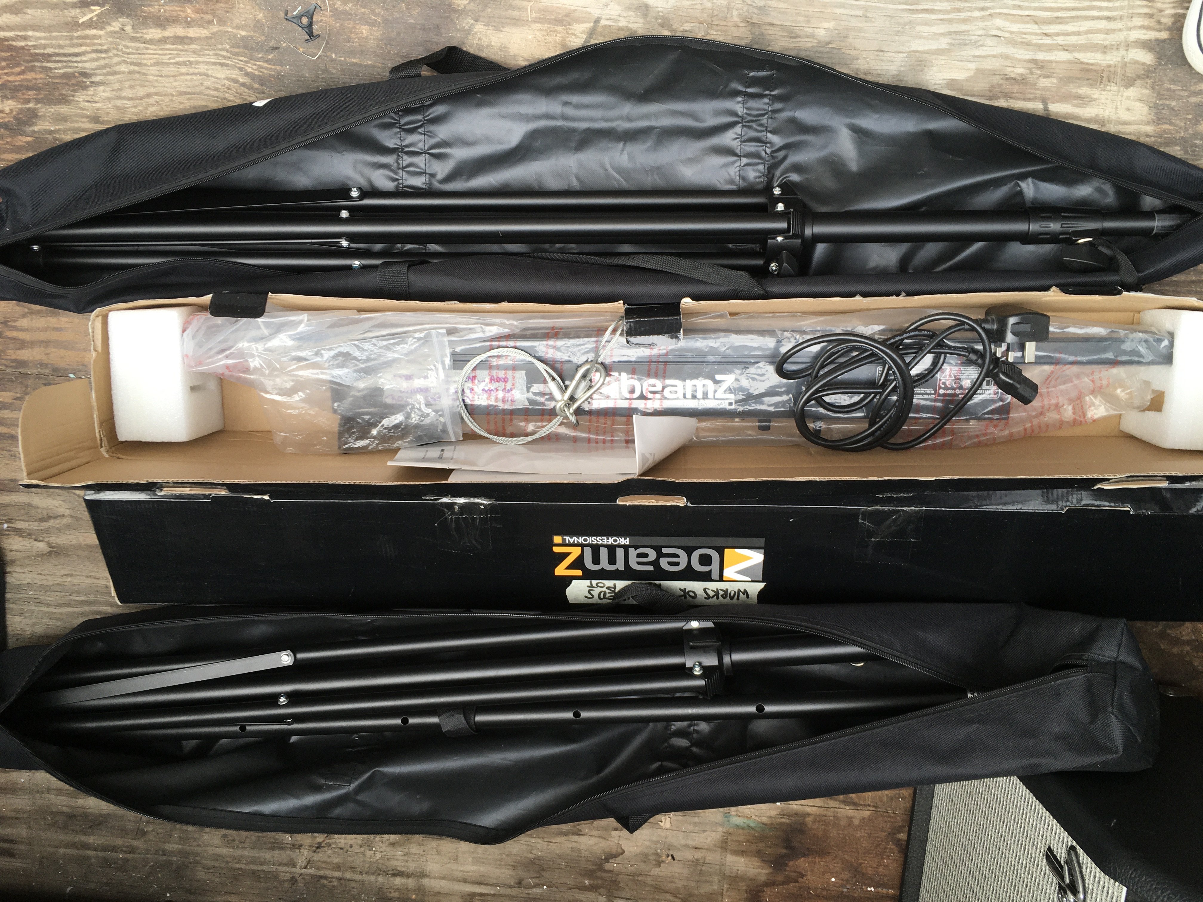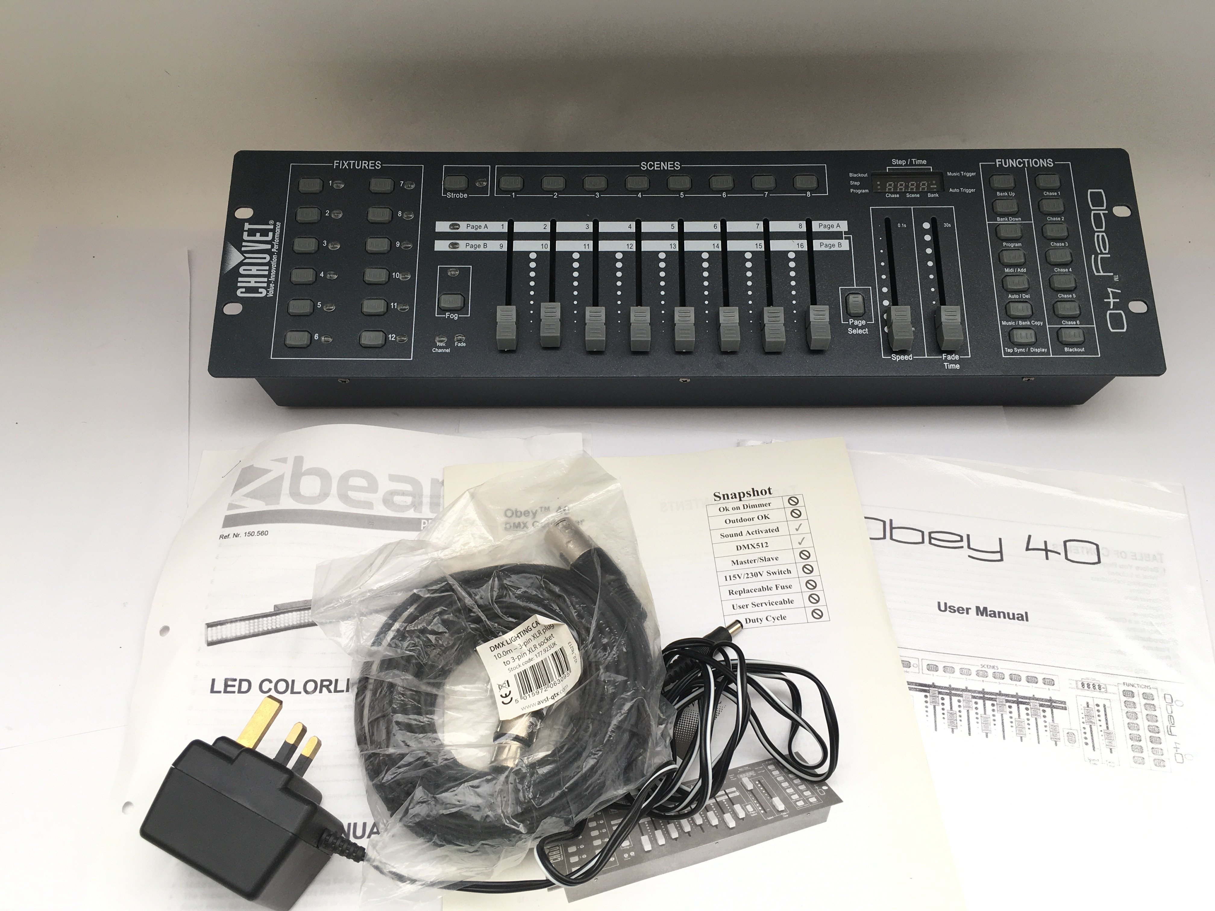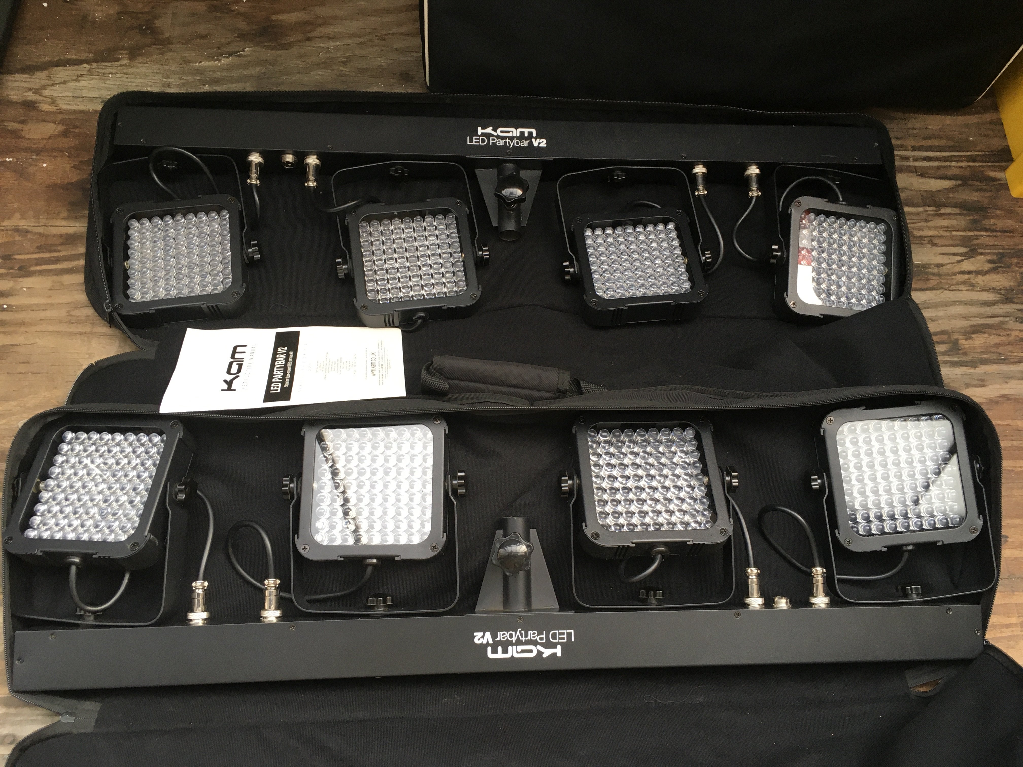 A collection of disco and stage lighting equipment comprising an Obey 40 DMX lighting controller, two KAM partybar V2 lighting units and two Beamz wall wash LED light bars (5).