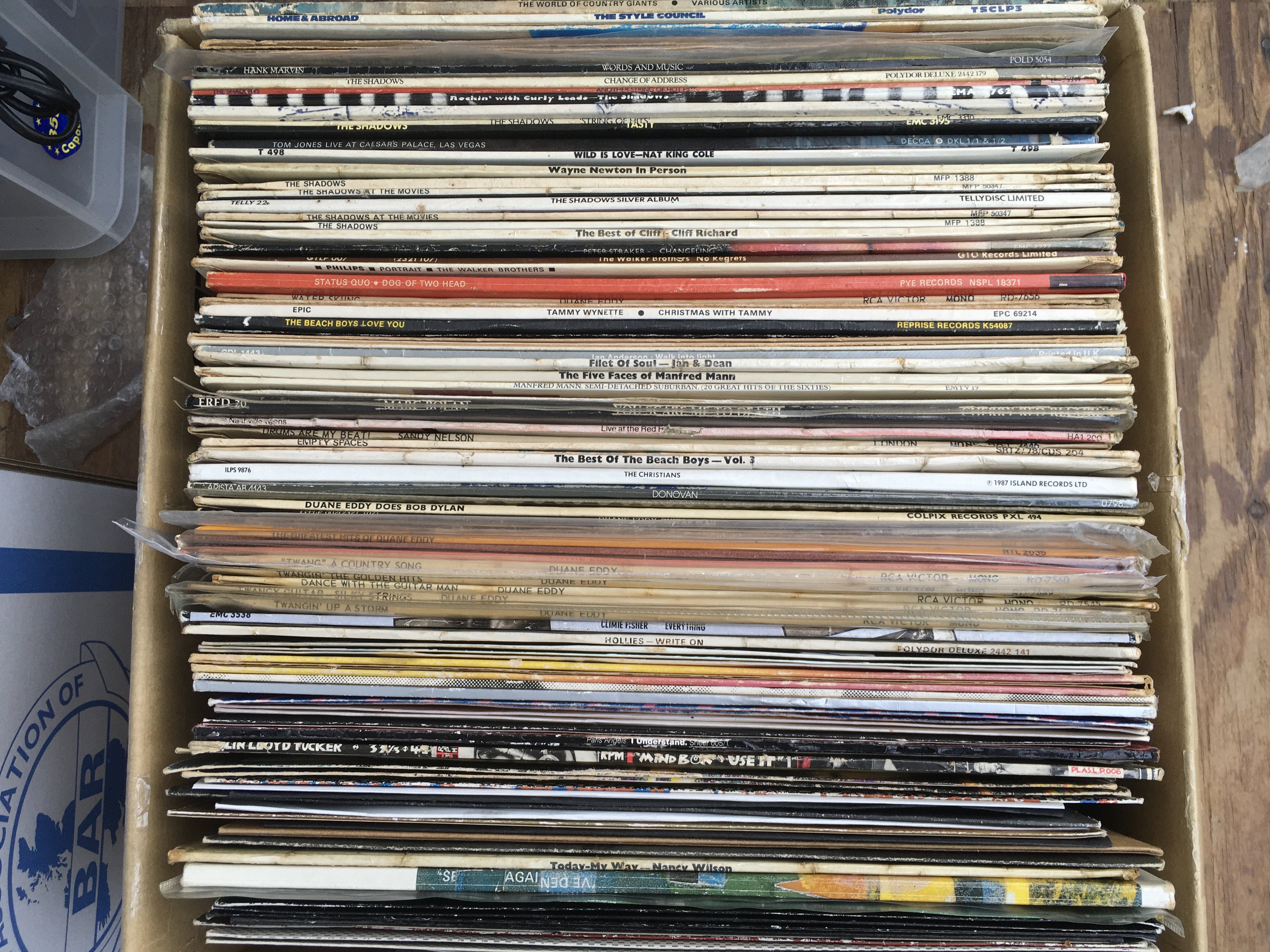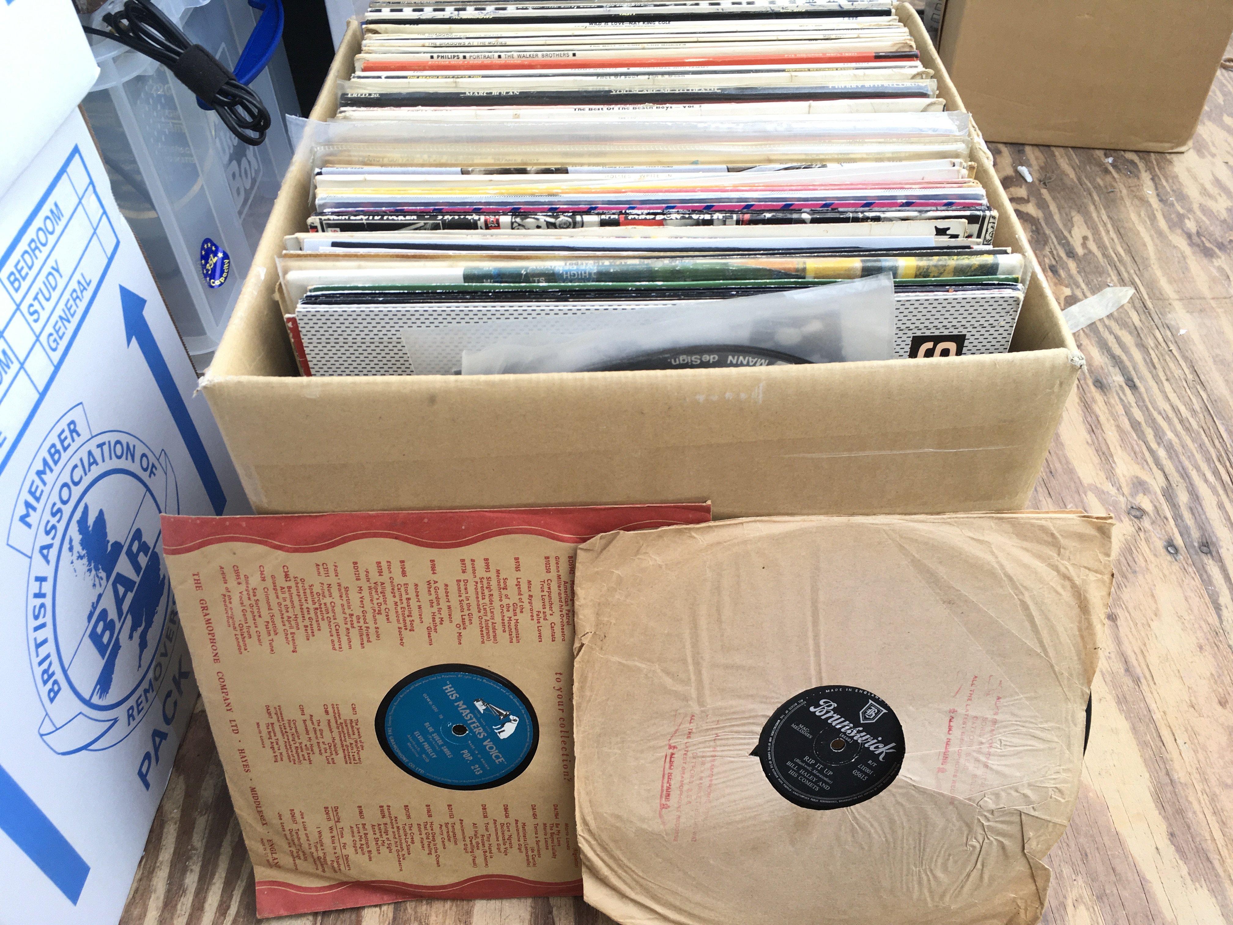 A box of LPs, 12" singles and 78s by various artists including Marc Bolan, Ian Anderson, Madonna and others.