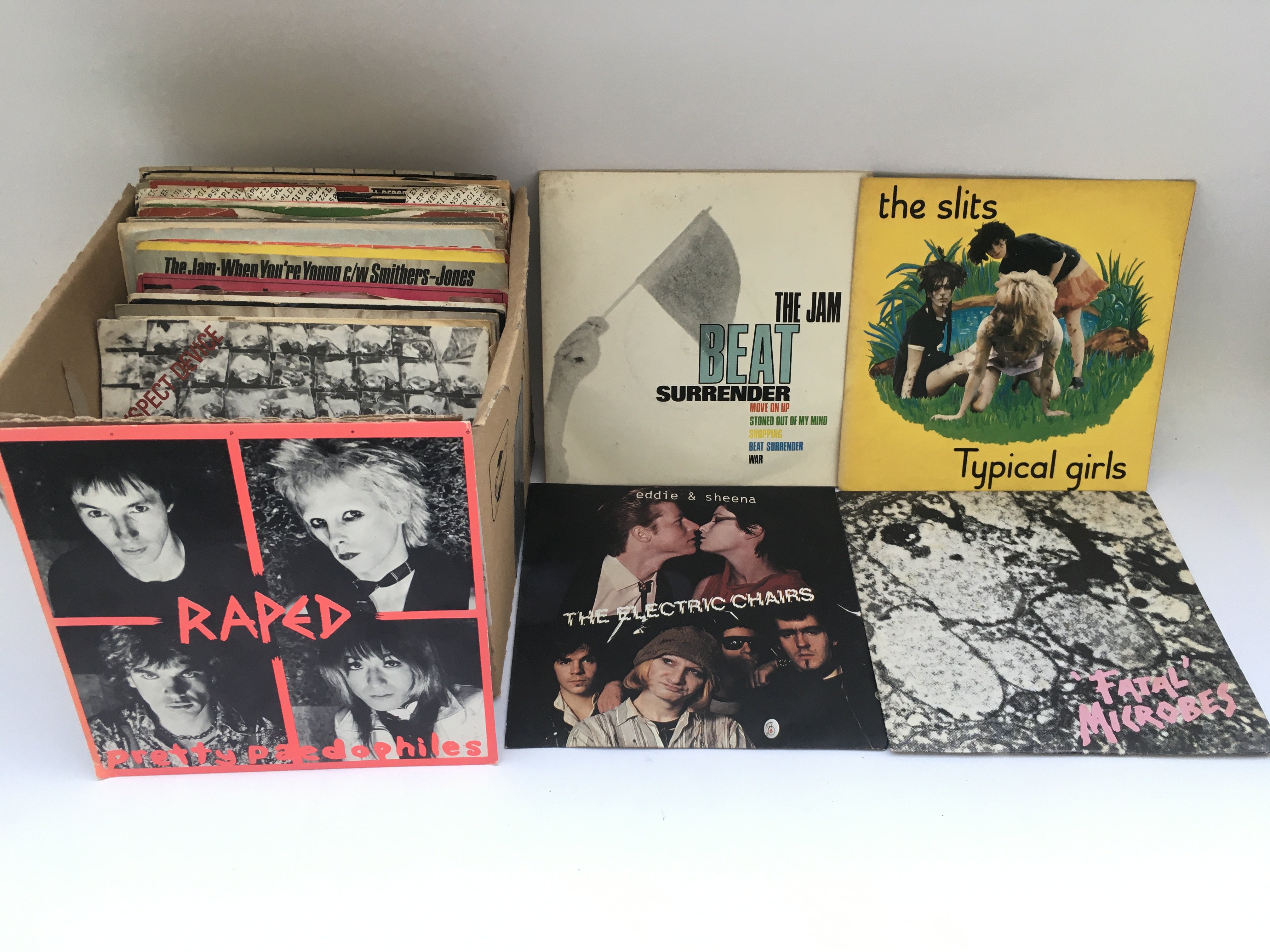 A collection of punk 7" singles by various artists including The Slits, Stiff Little Fingers, The Jam and others.