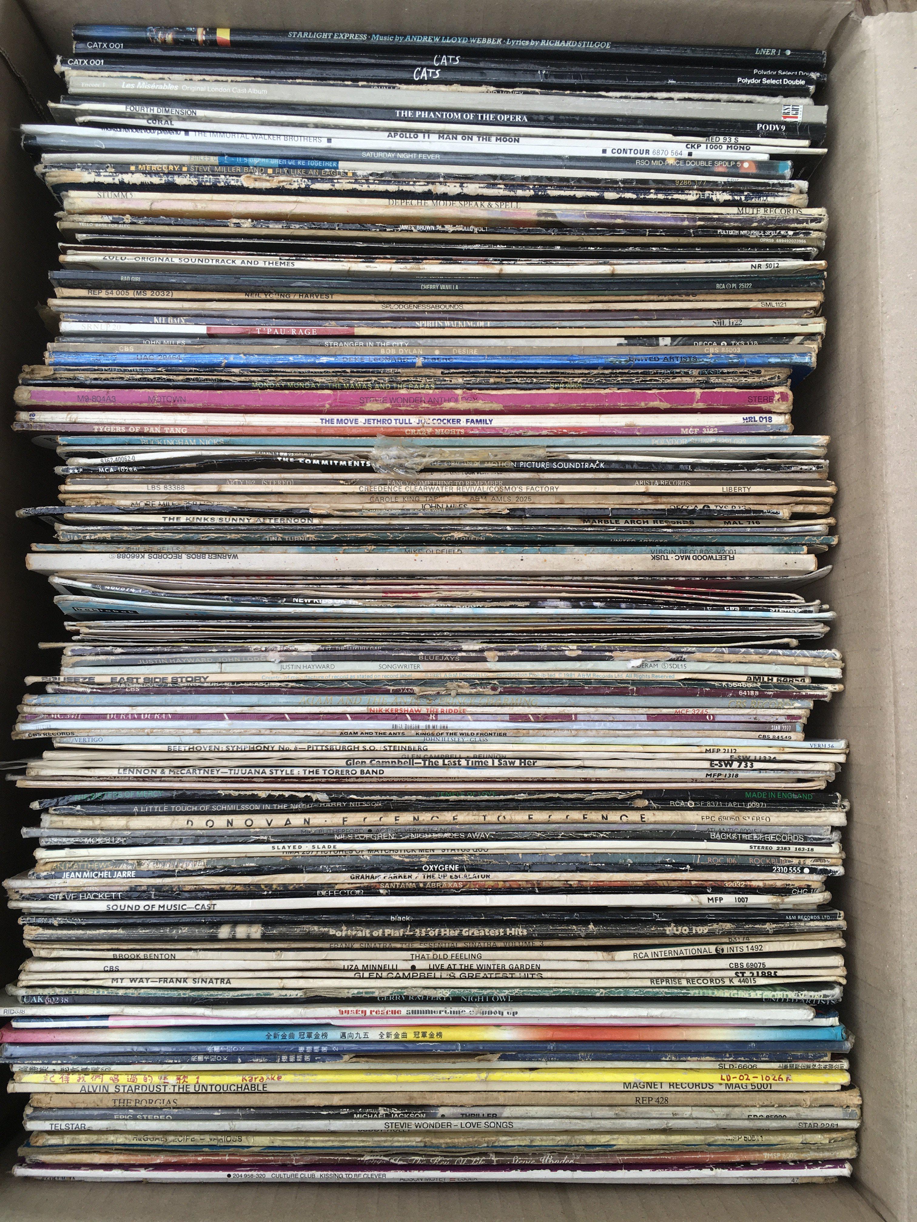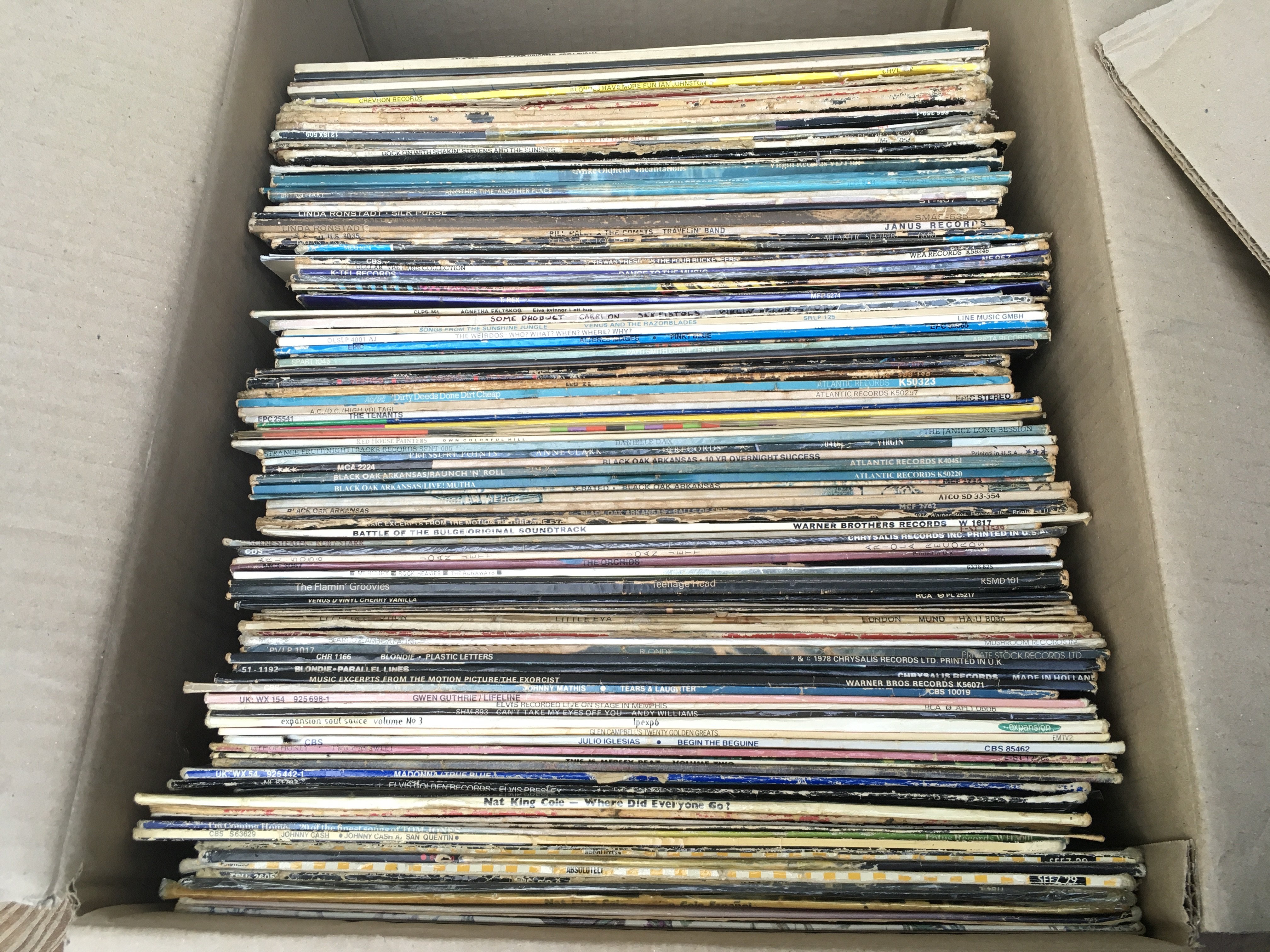 Two boxes of LPs and 12" singles by various artists including Led Zeppelin, Black Sabbath, The Flaming Groovies and many more.
