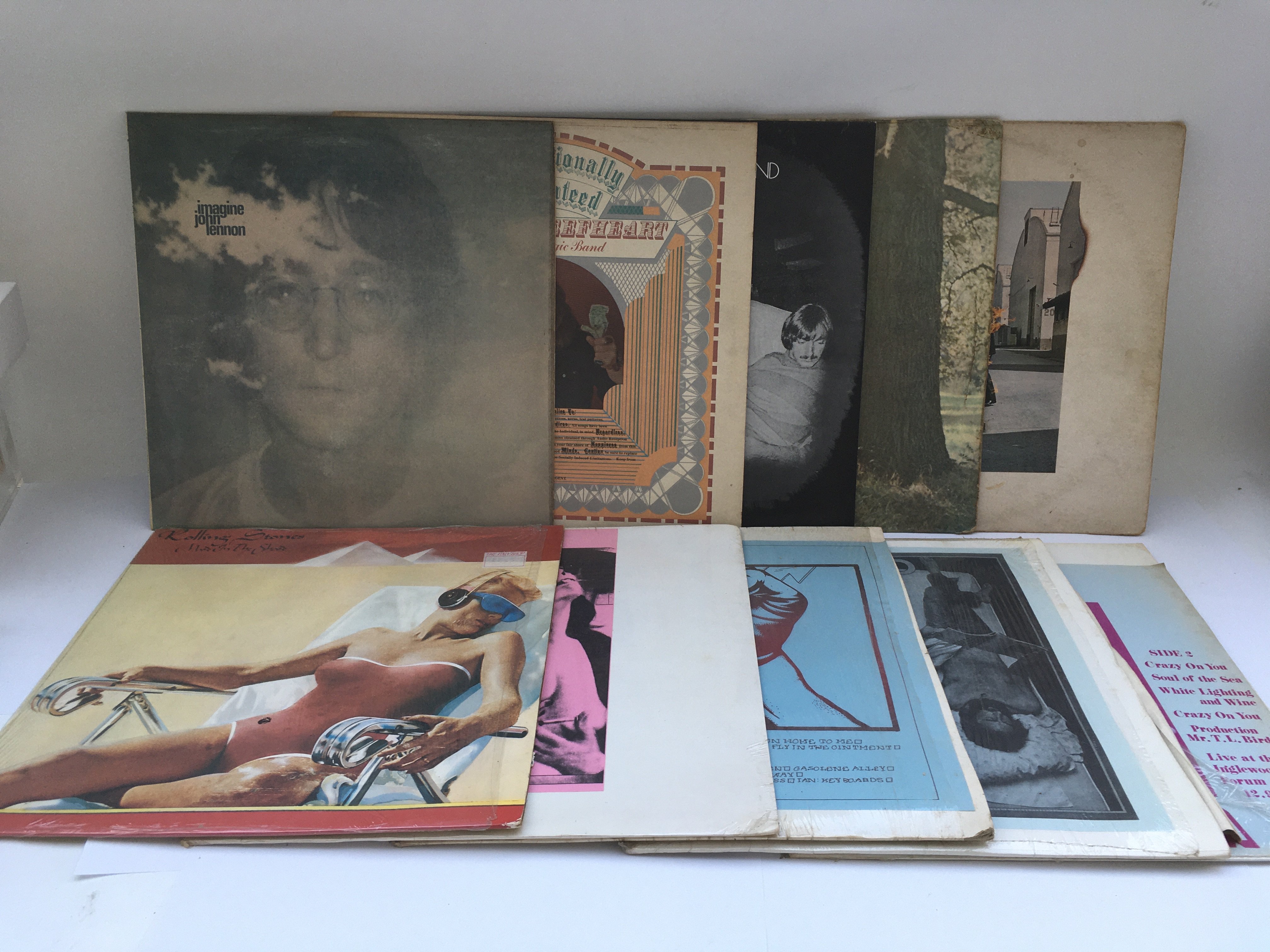 Two bags containing 20 rock LPs by various artists including David Bowie, Jeff Beck, Frank Zappa, Tom Waits and others.