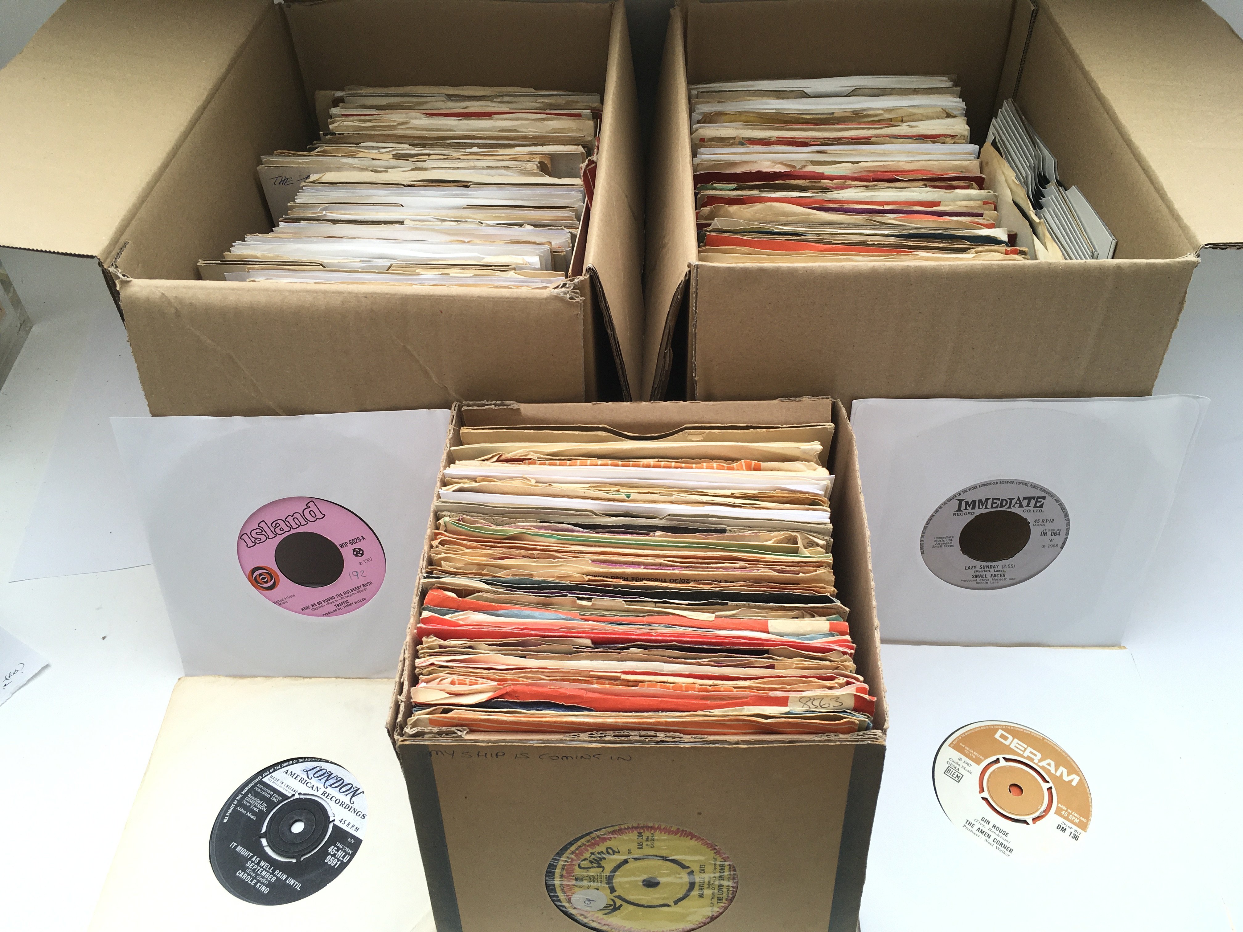 Three small boxes of 7" singles and EPs by various artists from the 1960s comprising Small Faces, Traffic and many more,
