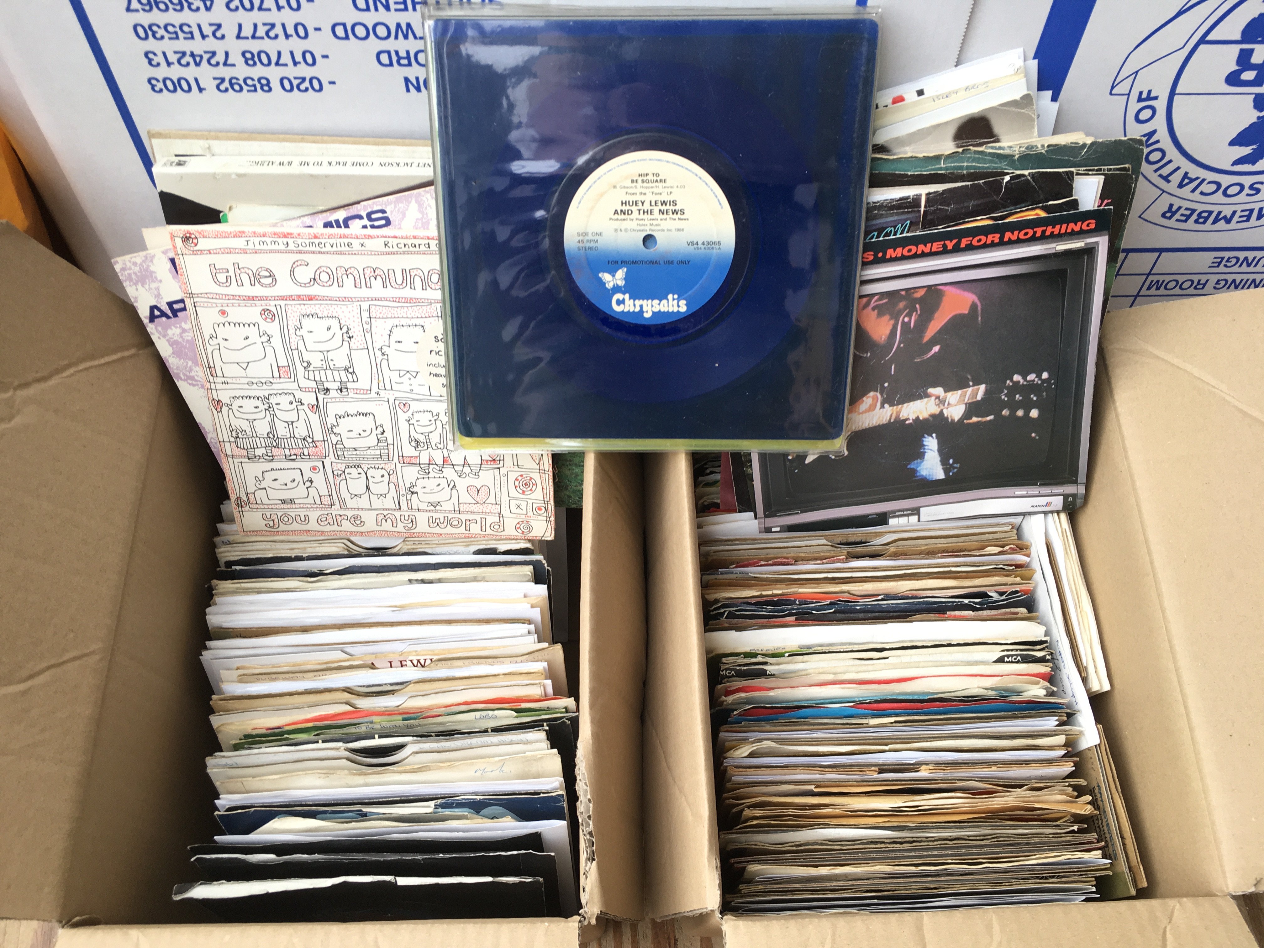 Four small boxes of 7" singles by various artists from the 1980s onwards.