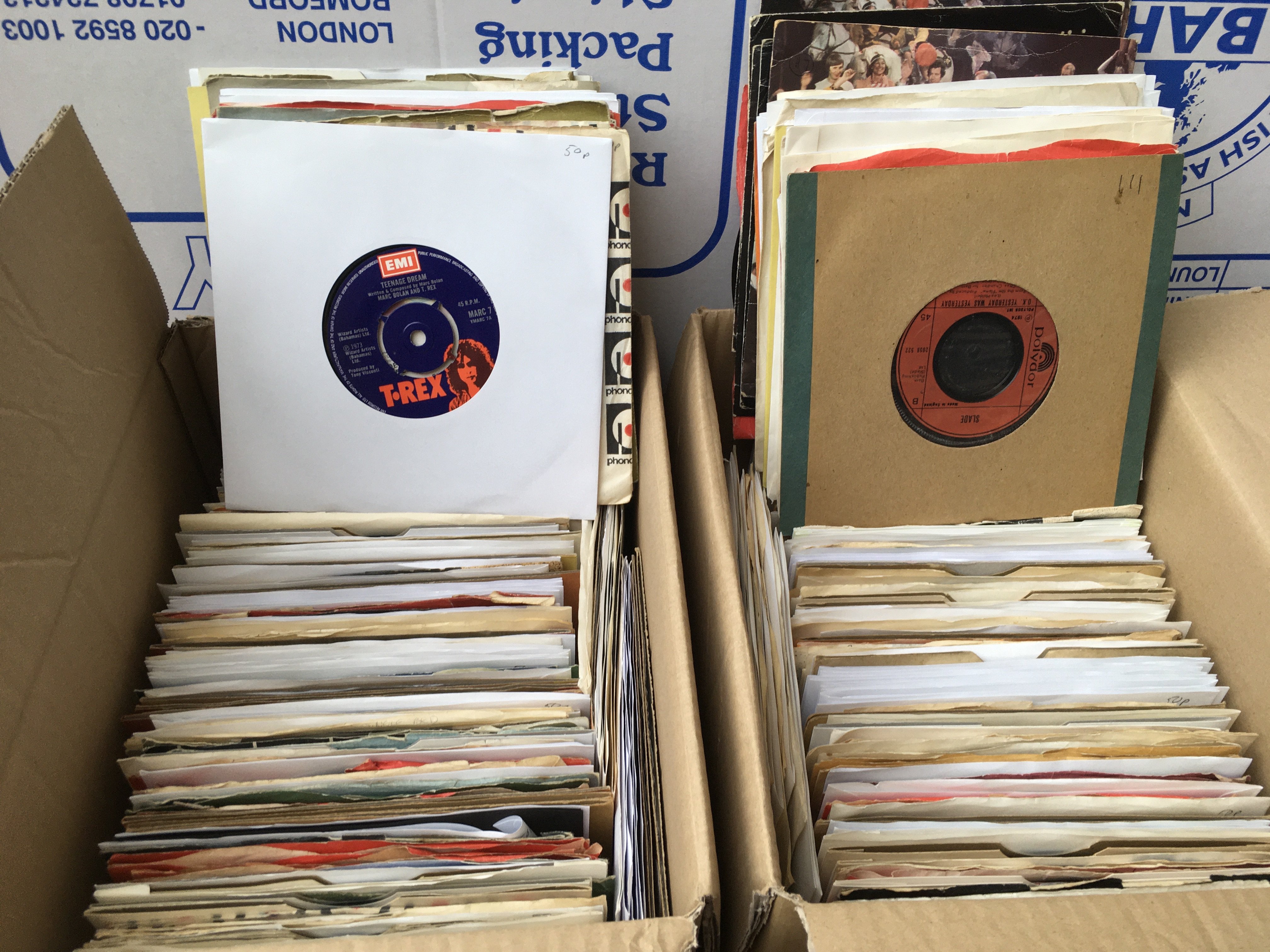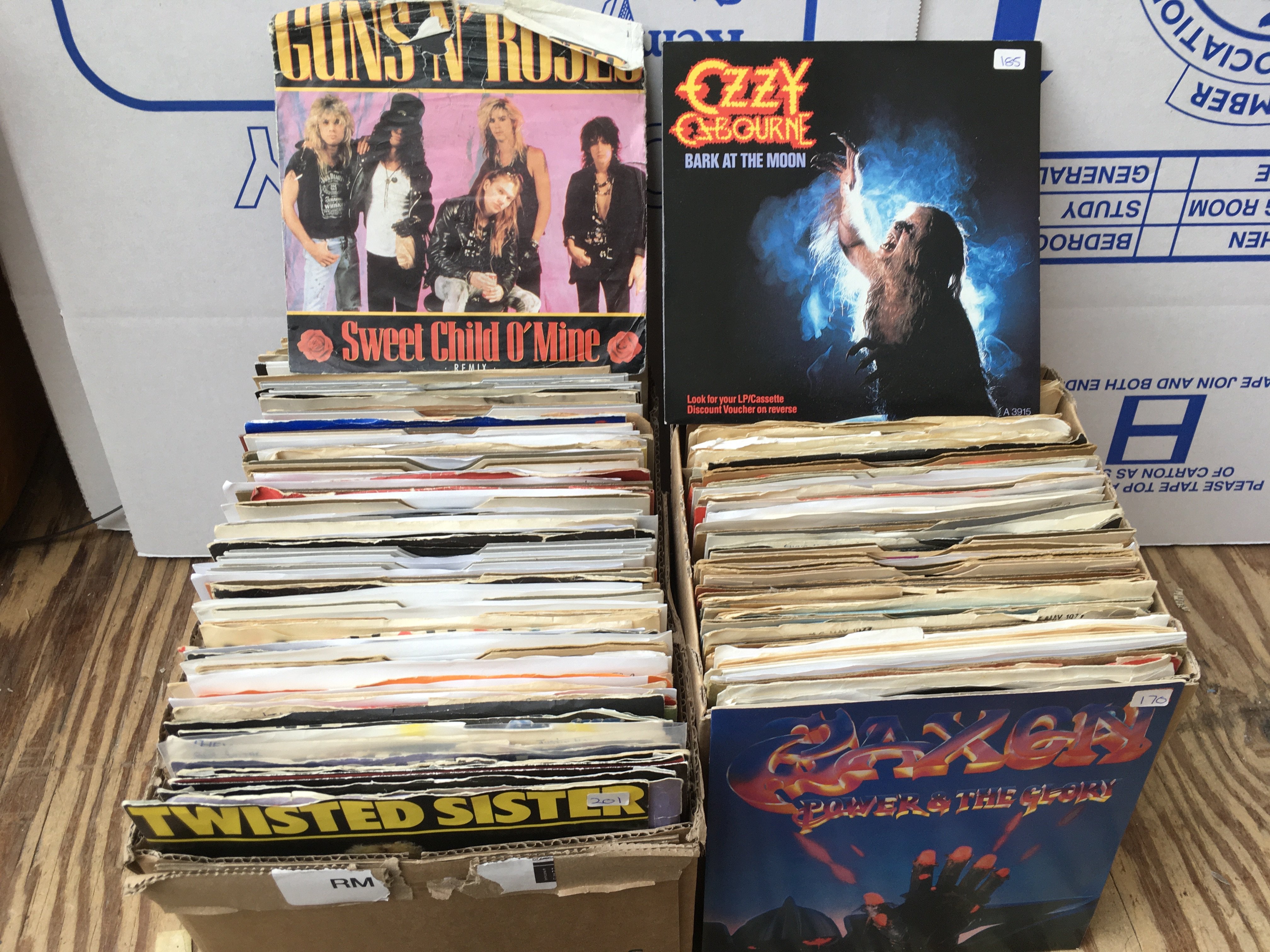 Four small boxes of 7" singles by various artists including Guns n Roses, Queen, Slade, ABBA and many more.