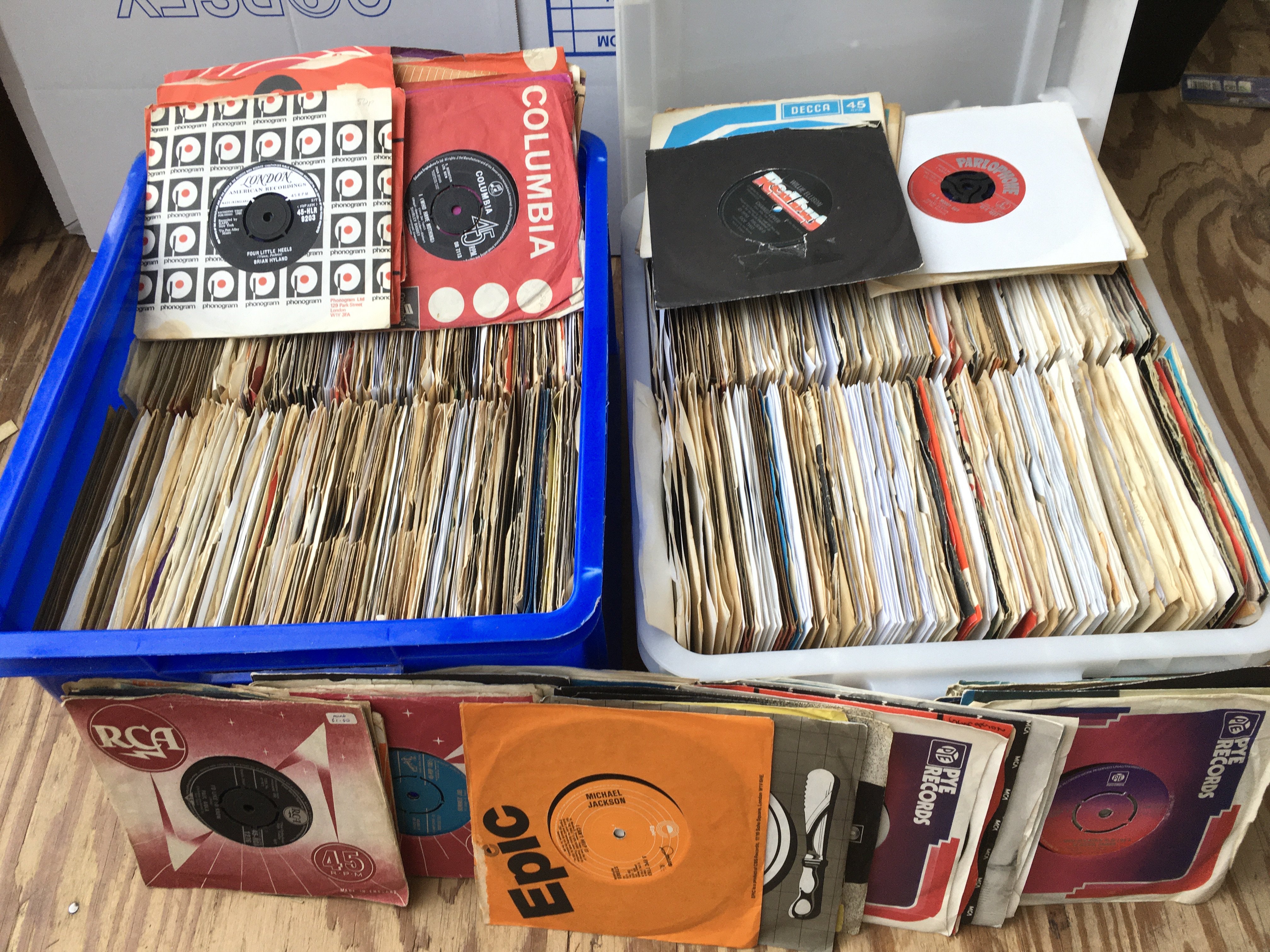 Two boxes of 7" singles by various artists from the 1960s onwards.