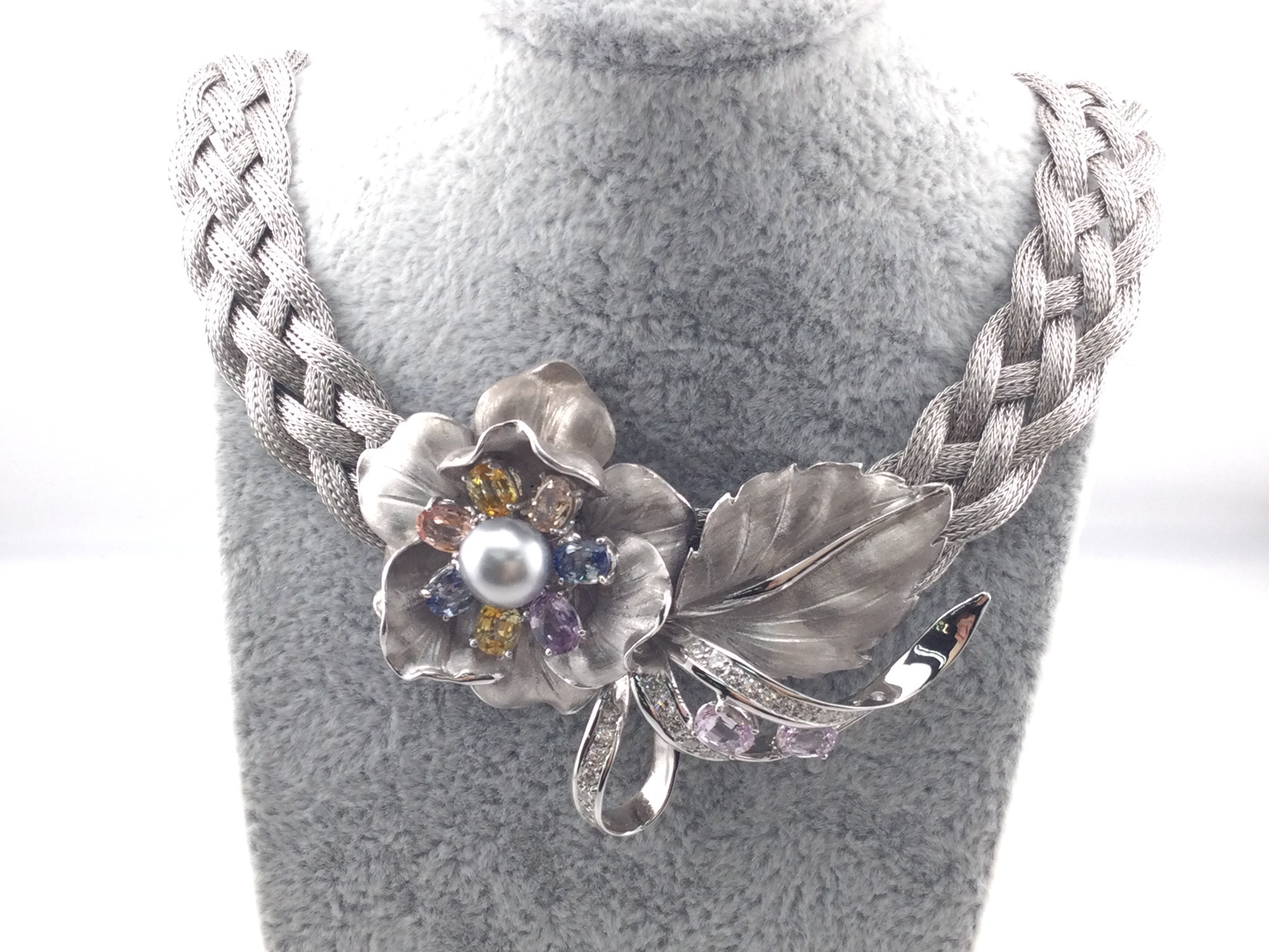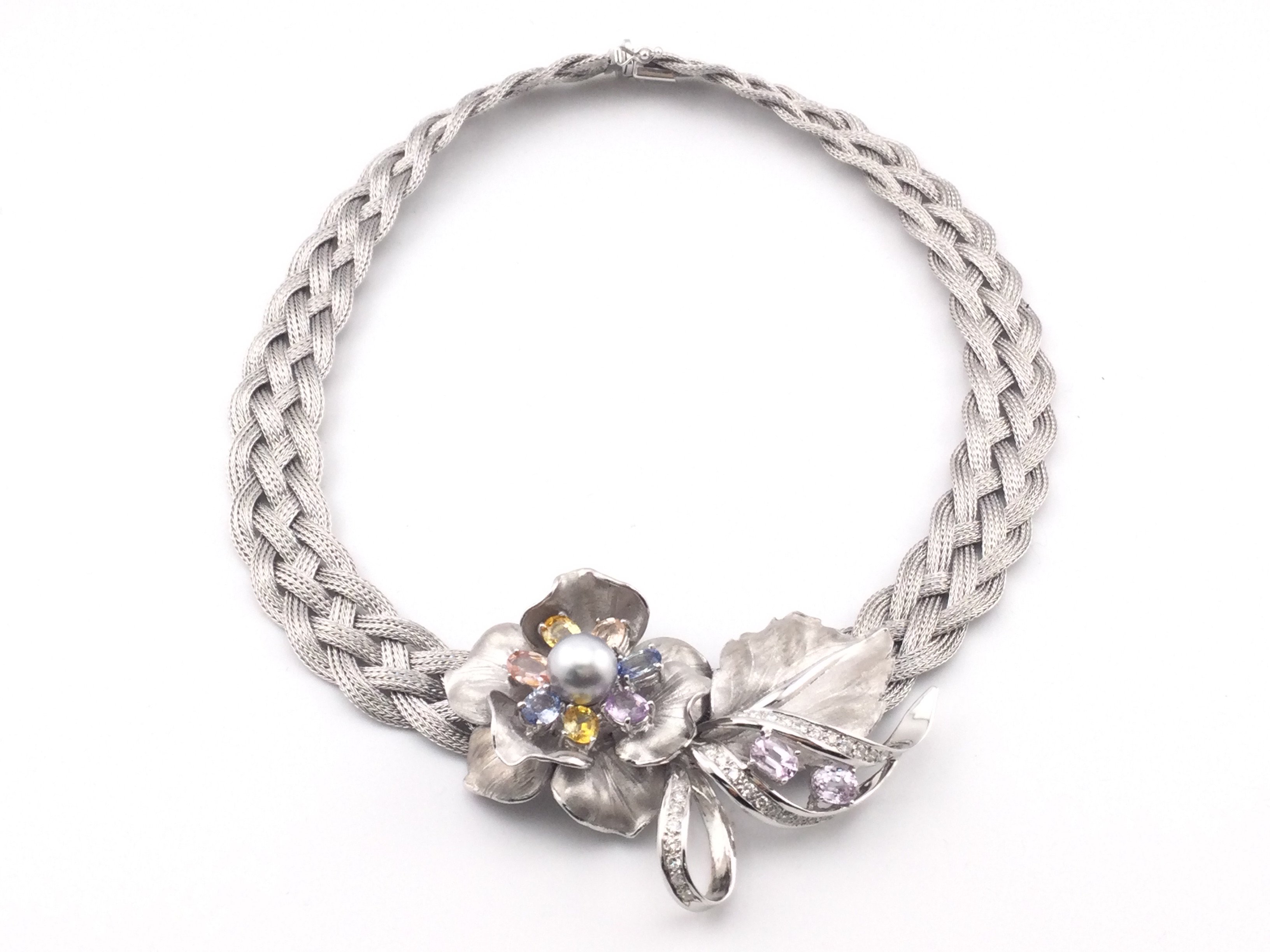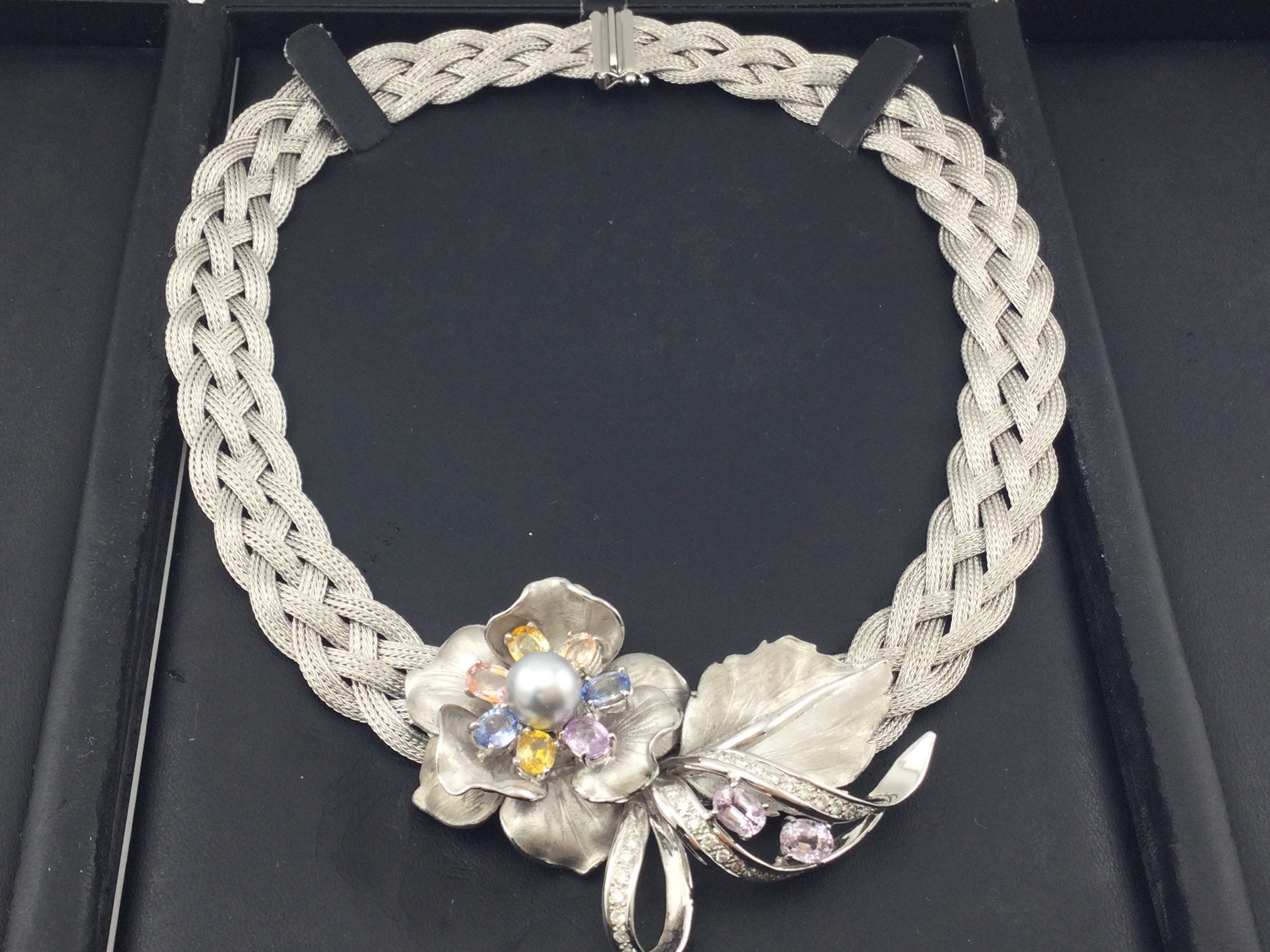 An 18k white gold necklace set with mixed sapphires and diamonds. Total weight is approximately 115g and diameter 6inches.Postage B