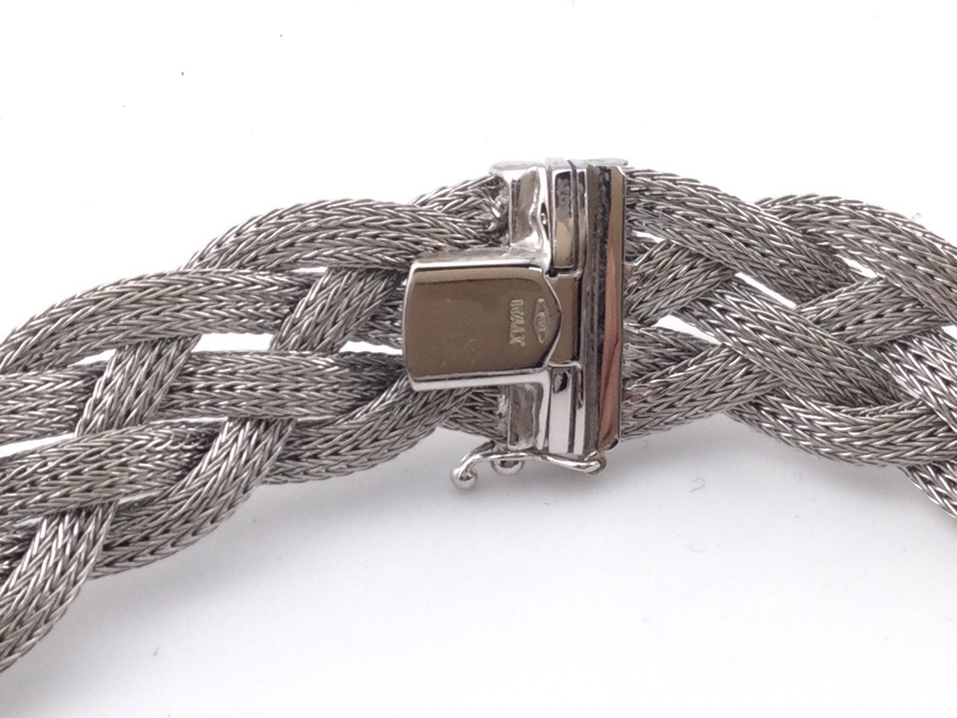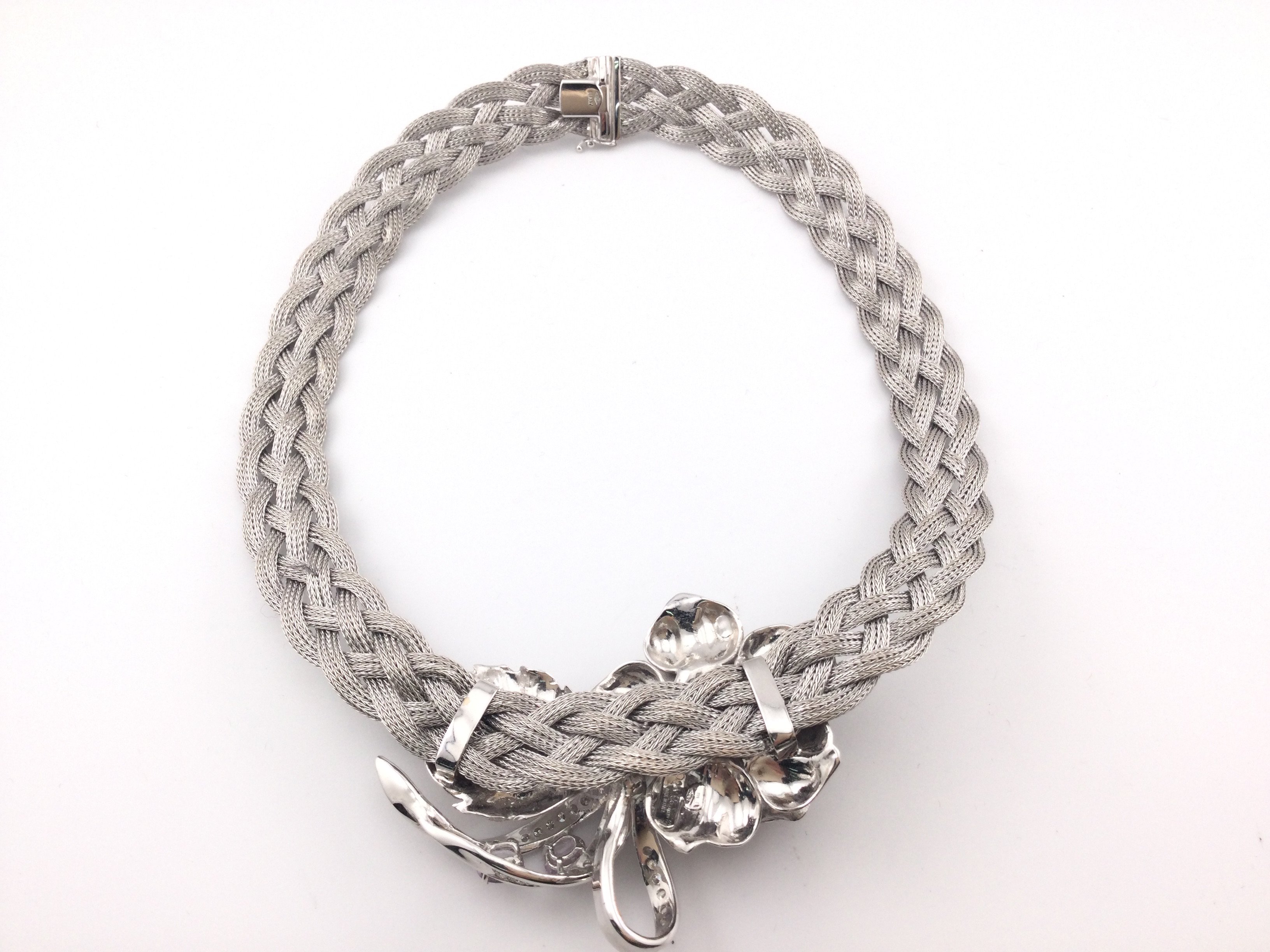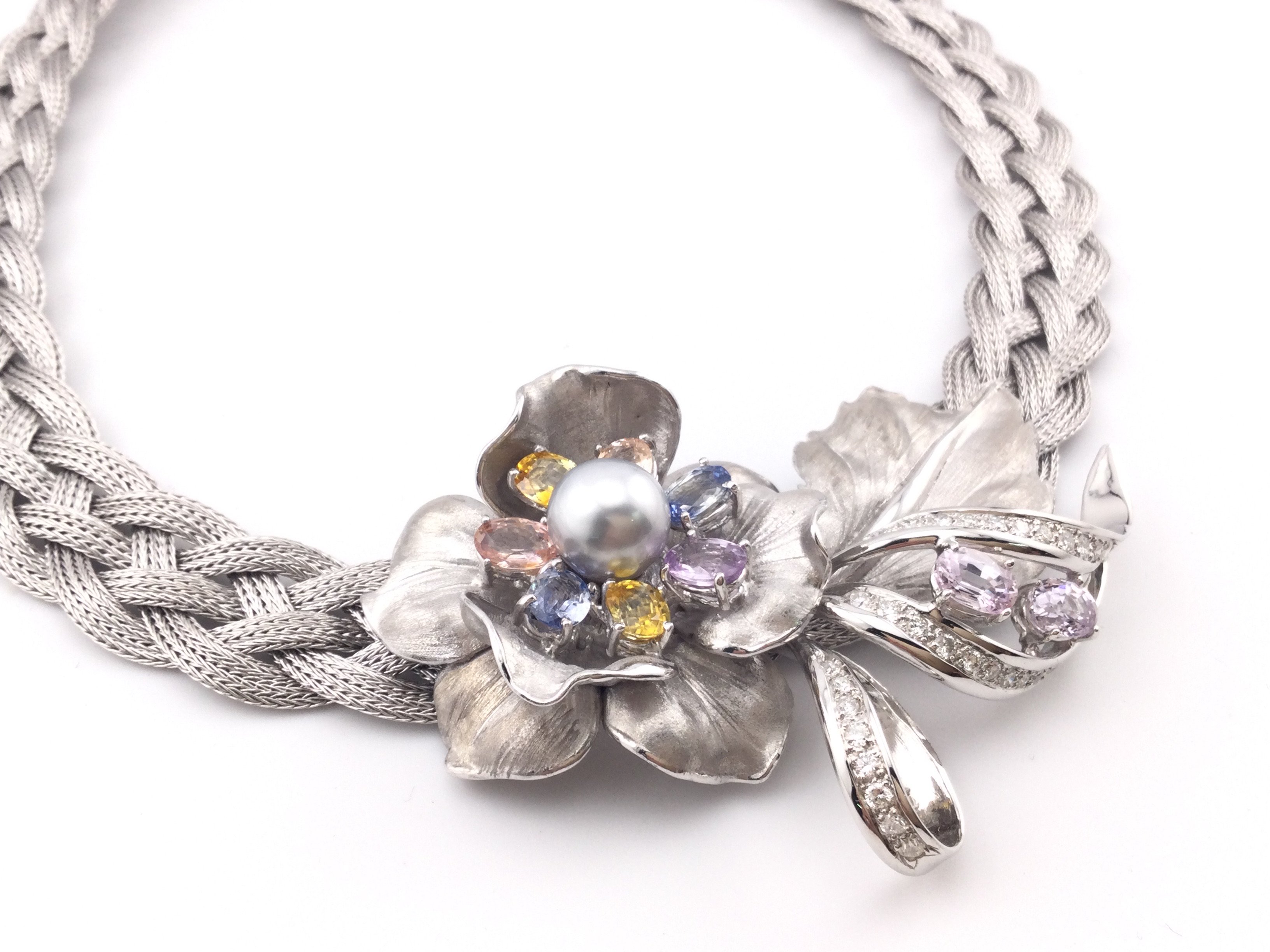 An 18k white gold necklace set with mixed sapphires and diamonds. Total weight is approximately 115g and diameter 6inches.Postage B