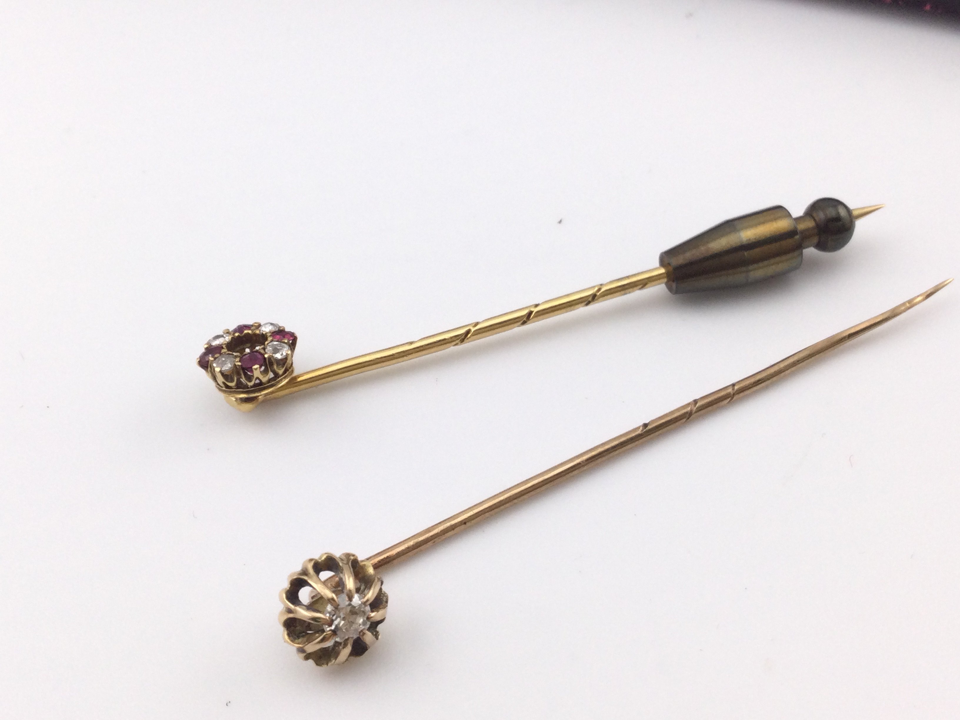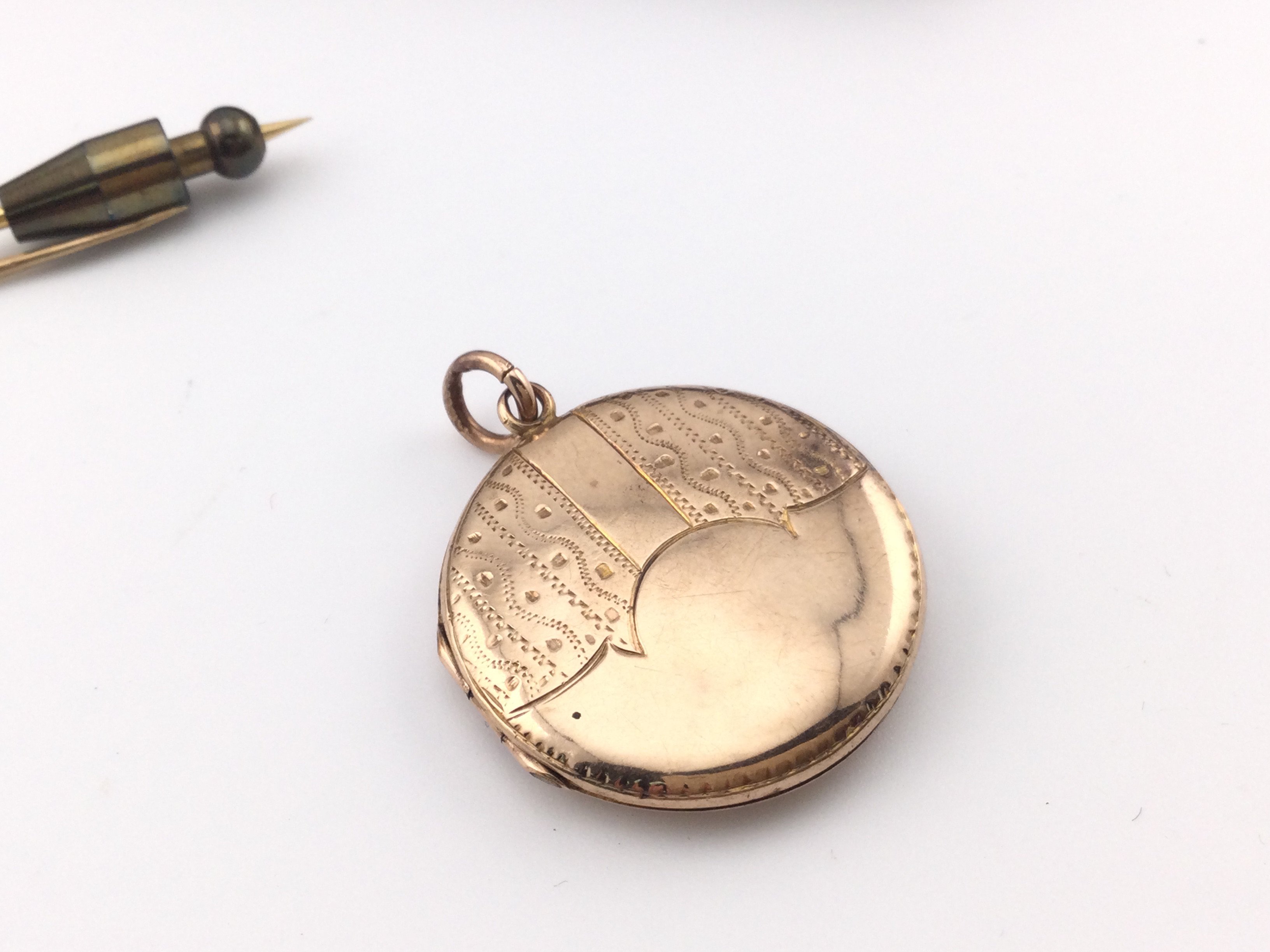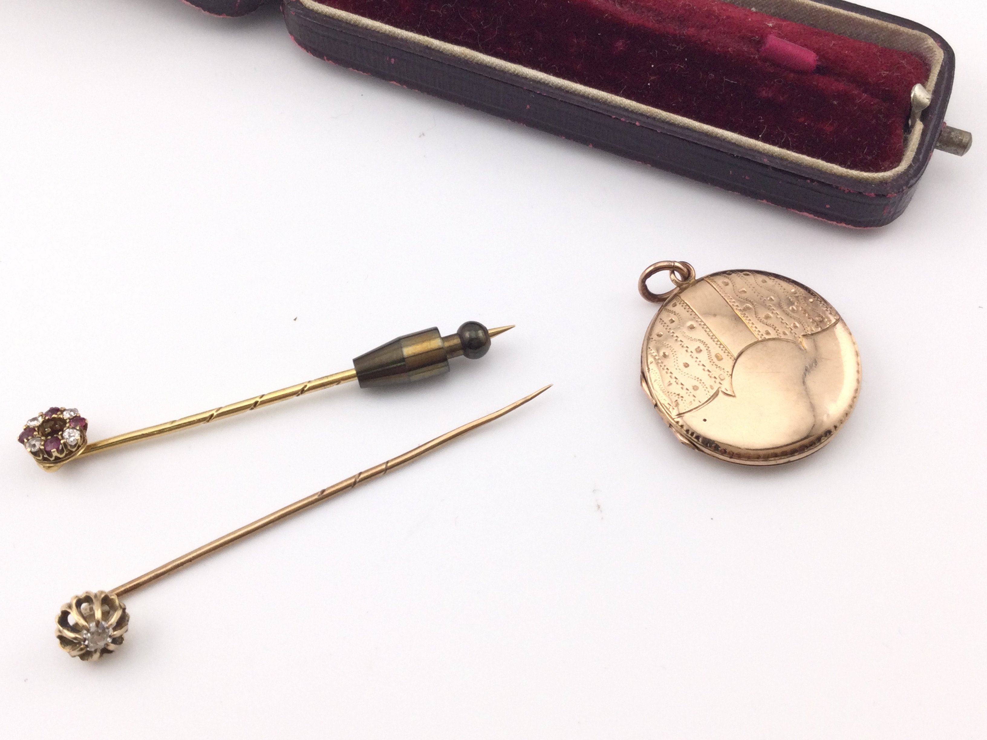 Two Edwardian stick pins and a 9ct gold locket 3.42 Postage B