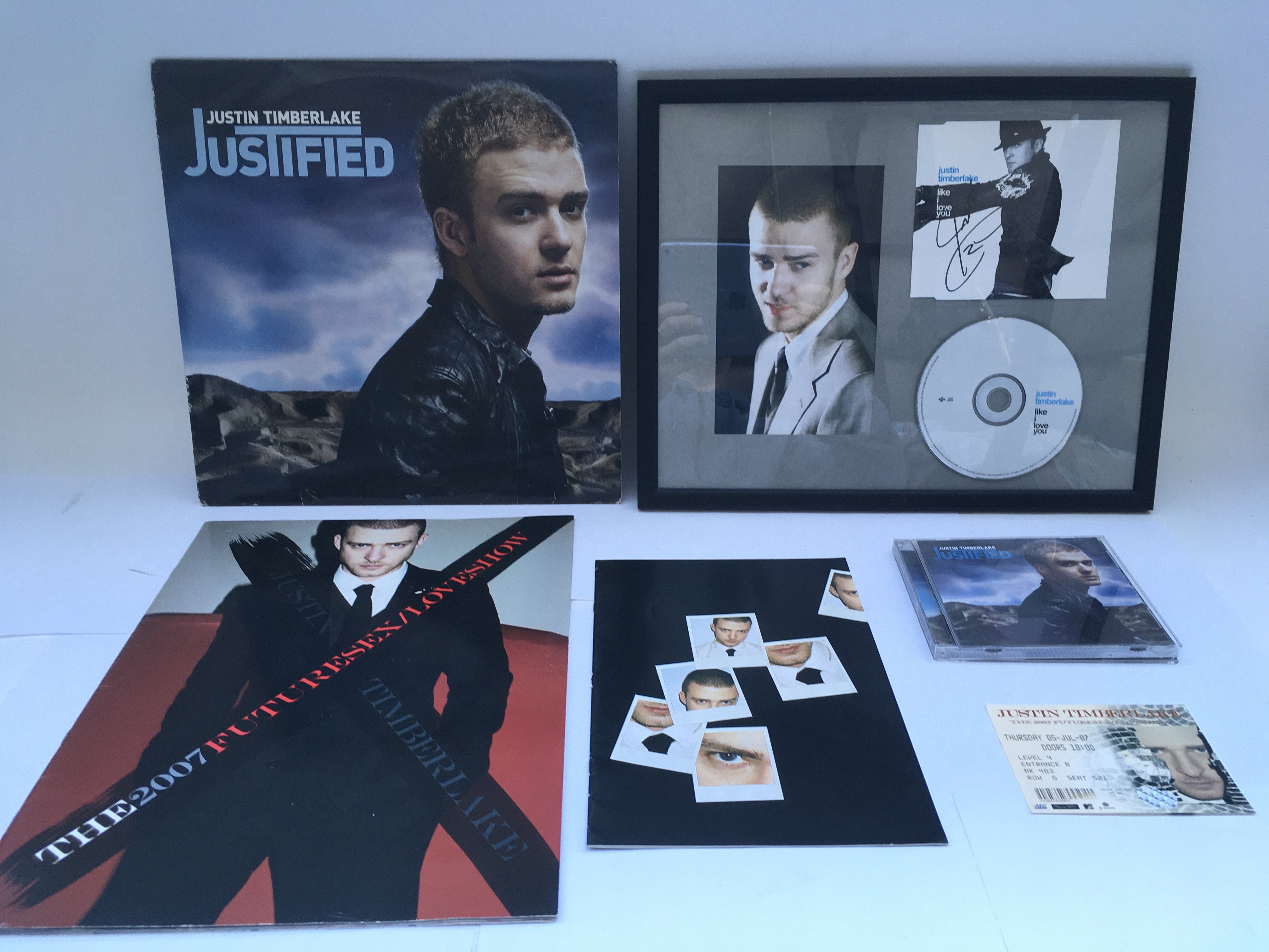 A collection of Justin Timberlake items comprising a signed CD cover, concert program, ticket stub, 'Justified' 2LP etc.