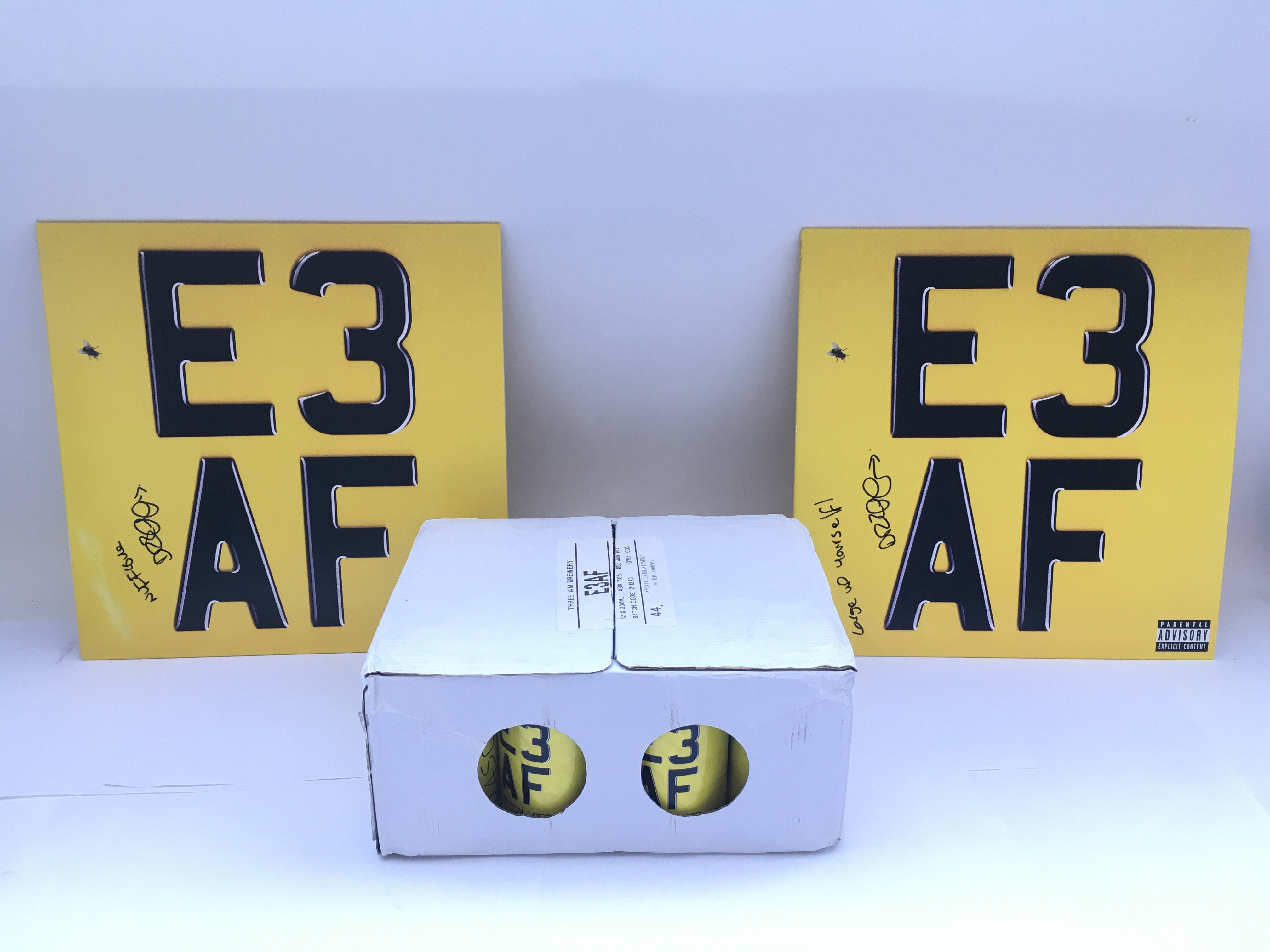 Two signed Dizzee Rascal yellow vinyl LPs and a case of exclusive promotional 'E3AF' tropical beer.