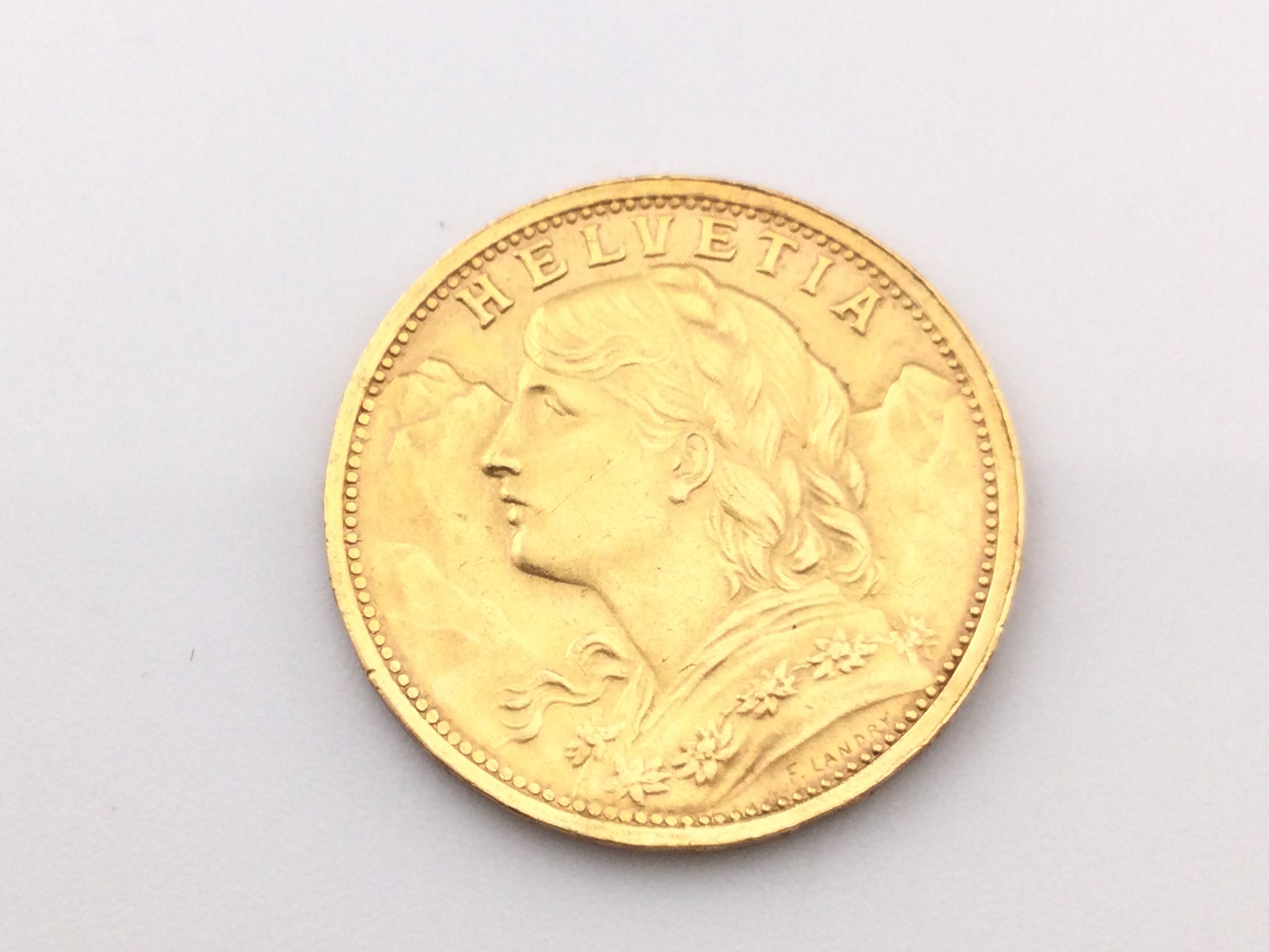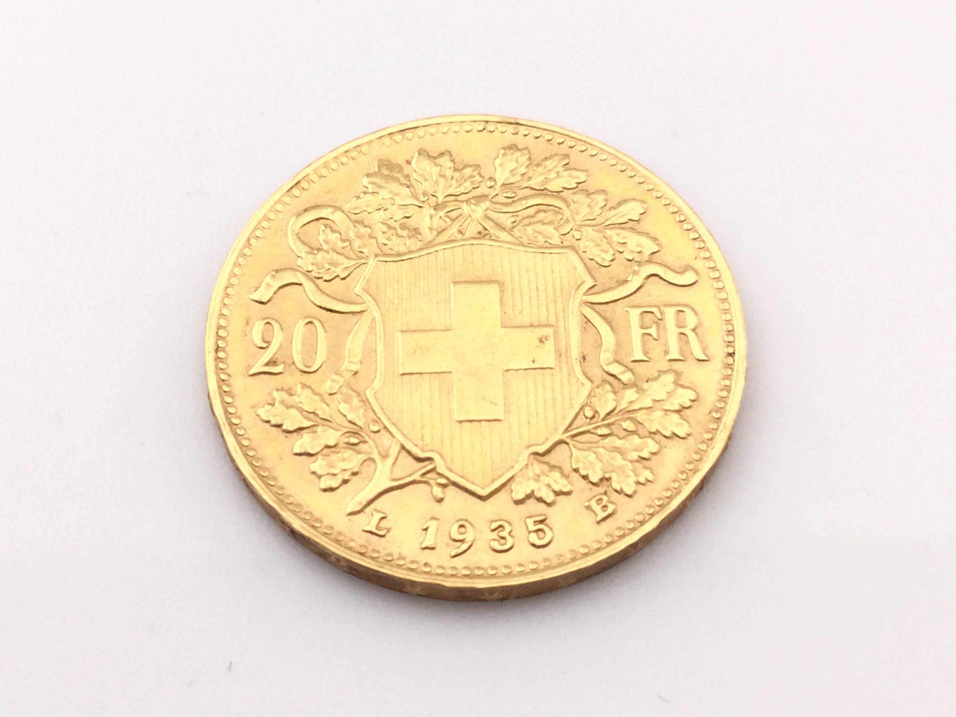 A 1935 20 Swiss franc coin. 6.46g Postage A