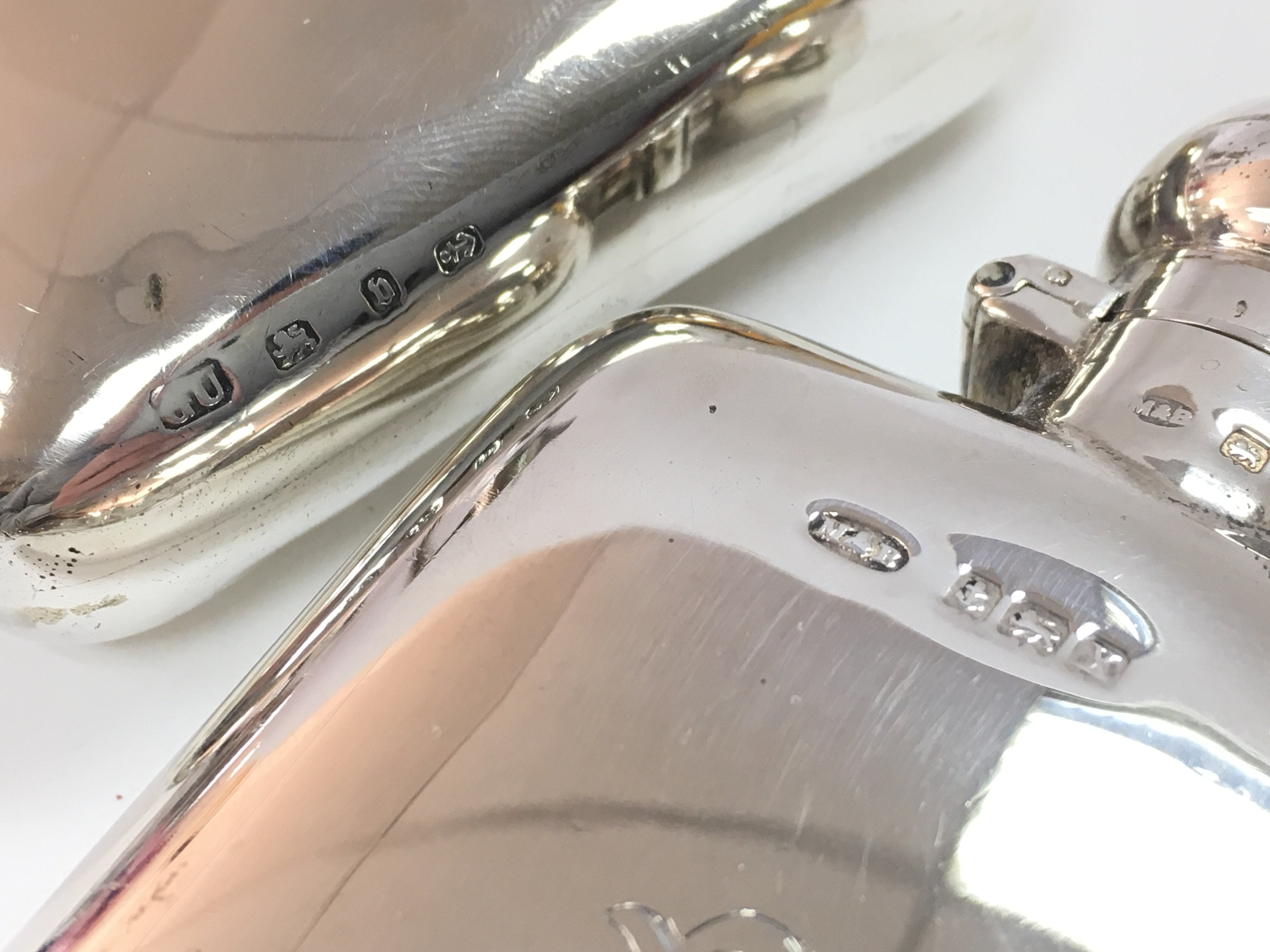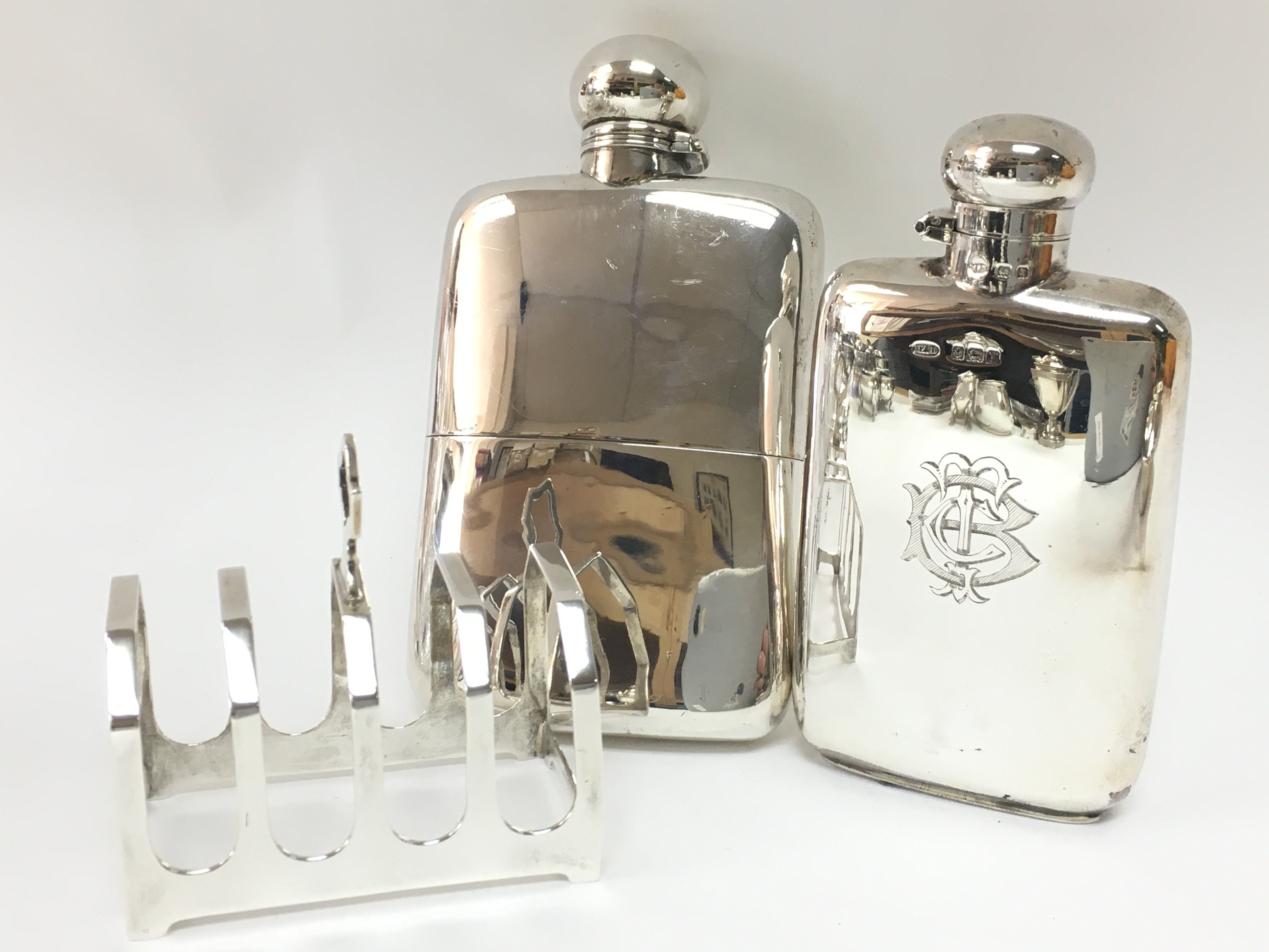 Hallmarked silver hip flasks and a silver toast rack, postage category B
