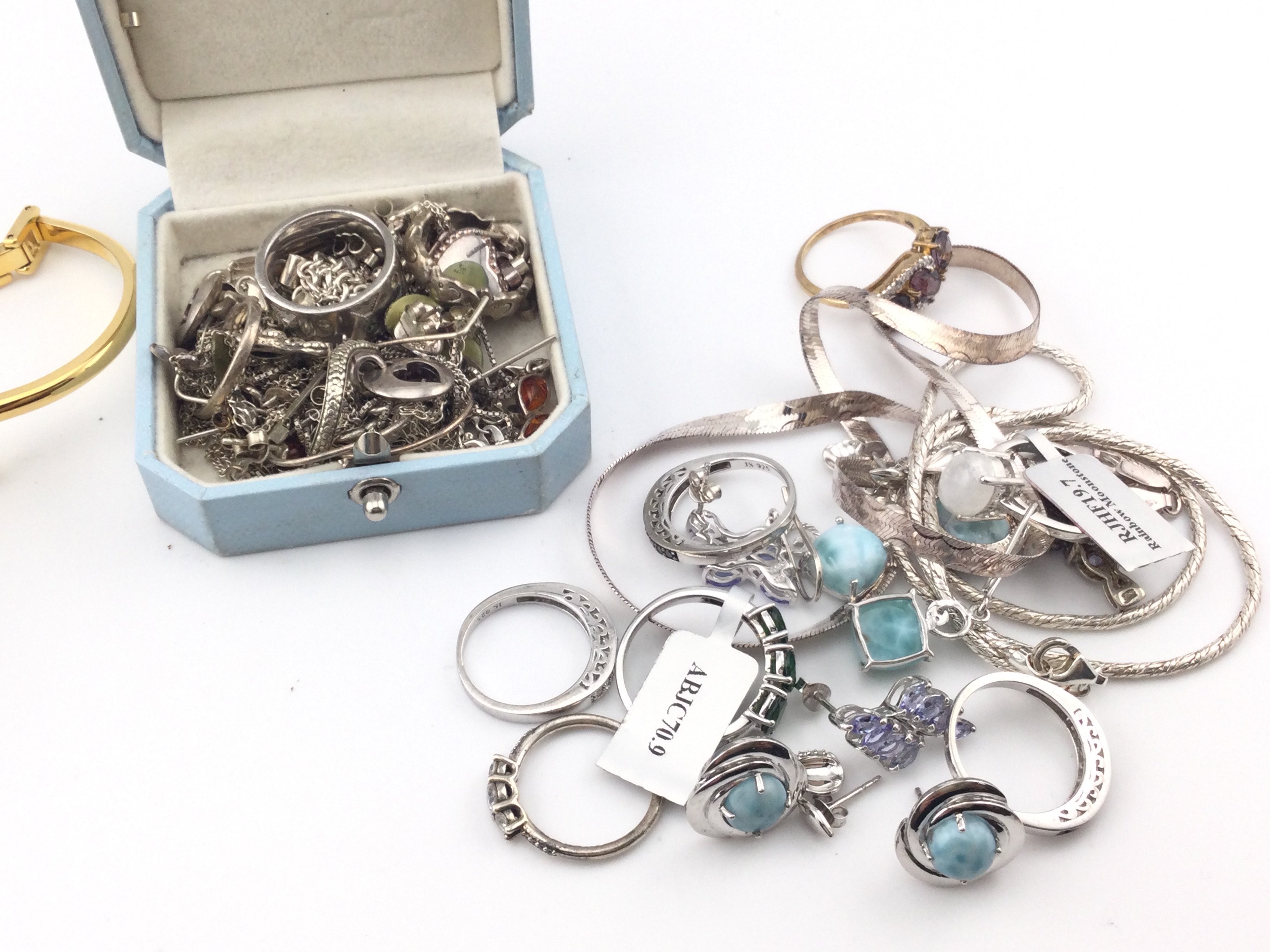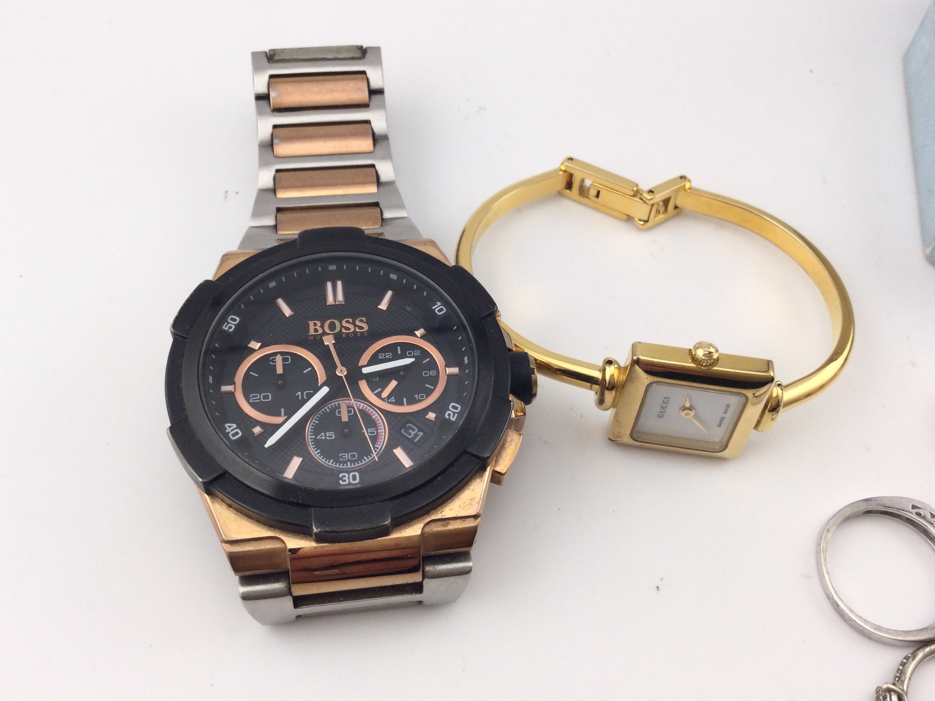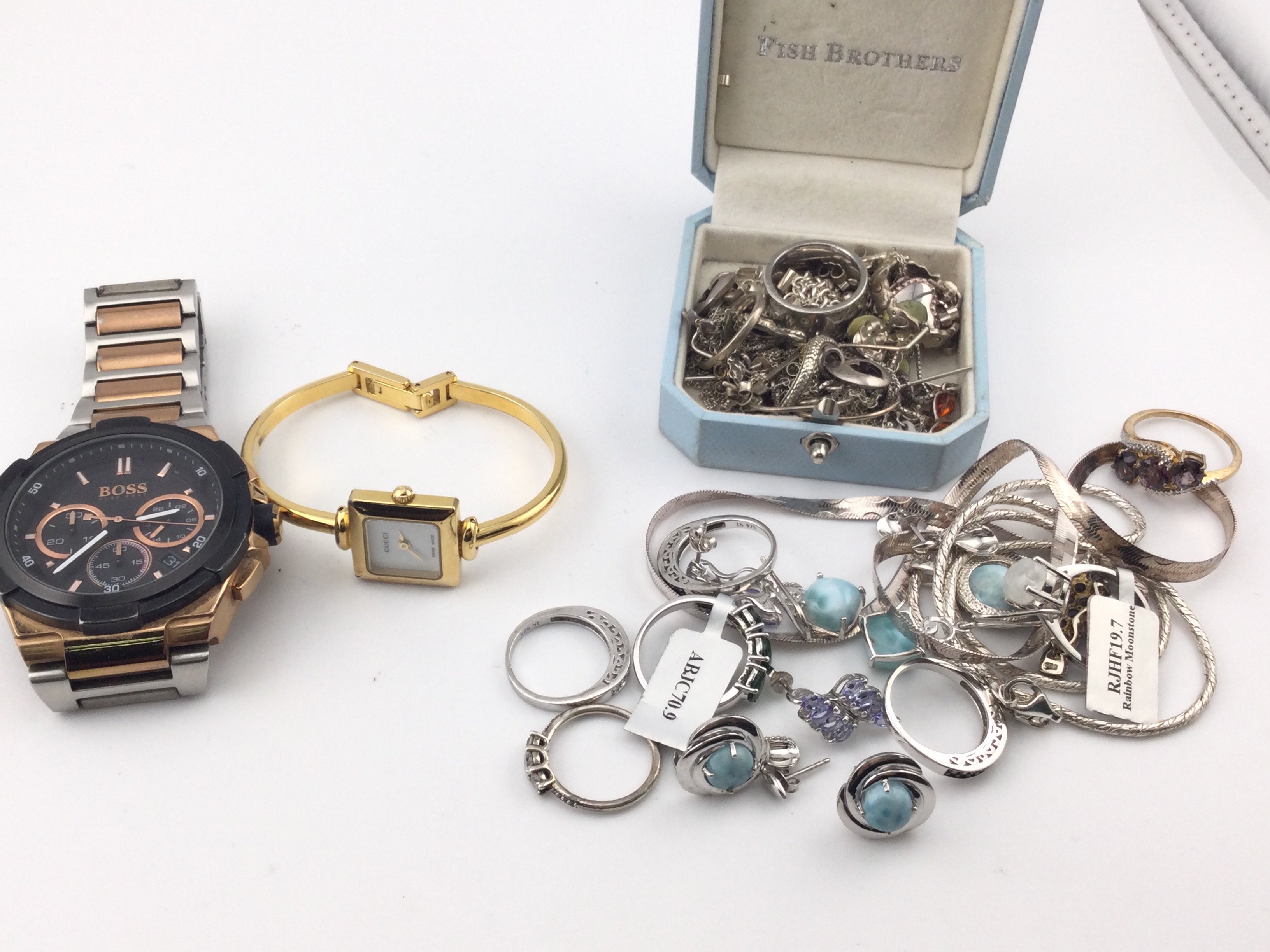 A collection of silver jewellery items and two watches a Gucci ladies and a gents Boss. Postage B