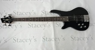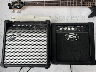 A Gear for Music Left Handed Bass Guitar in Black with chrome parts. Overall condition very good used. Comes with two practice amps. A boxed Gear for Music LBL10 and Peavey Max 126
