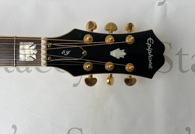 An Epiphone EJ 200 Electro-Acoustic Guitar with built in pickup and Epiphone Sonic 2 system. Come with gold plated parts and in very good + condition. Very light playwear and fret-wear. Comes with gig bag.