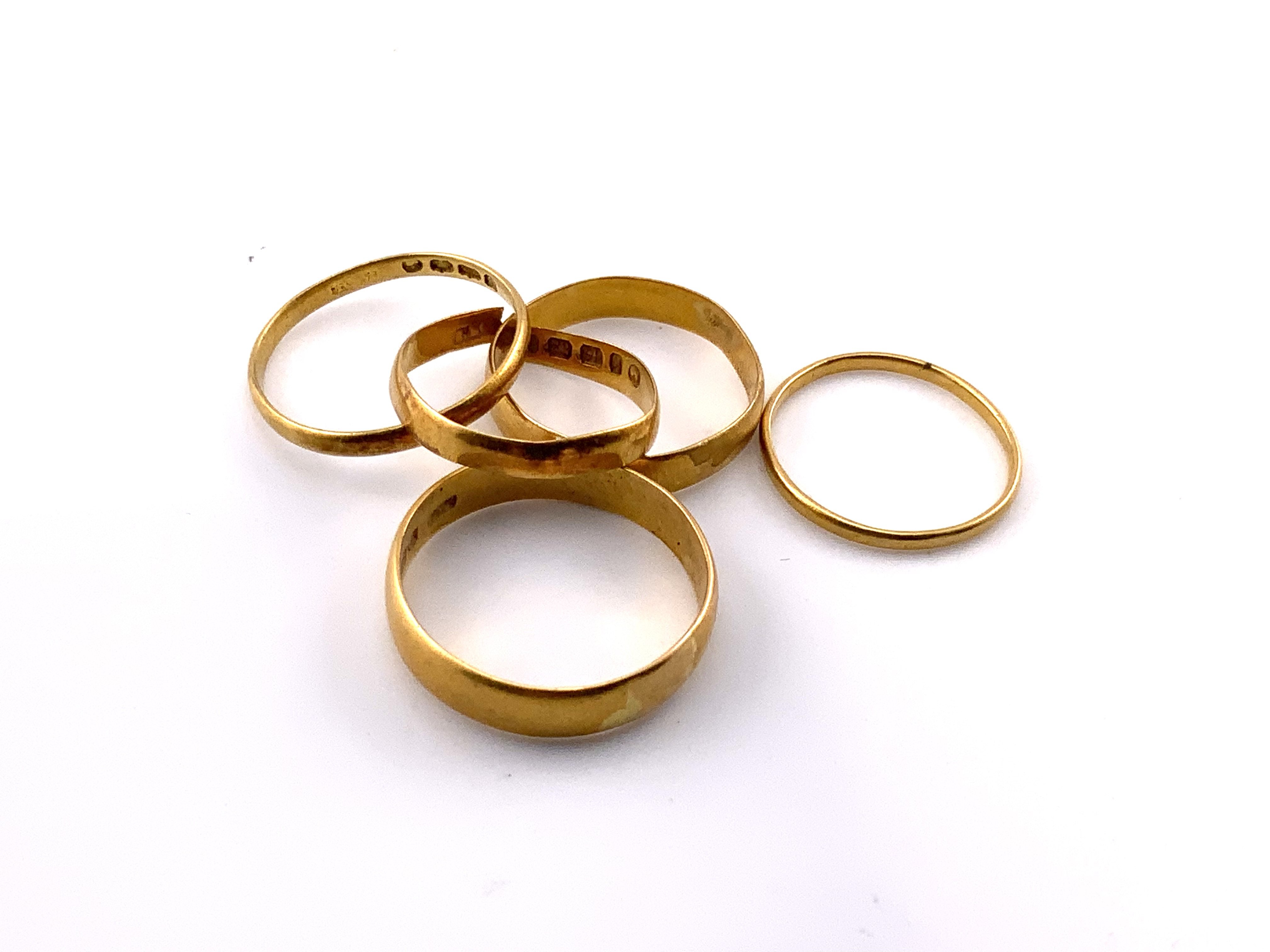 5 22 ct gold wedding bands, total weight 9.89g, (A)