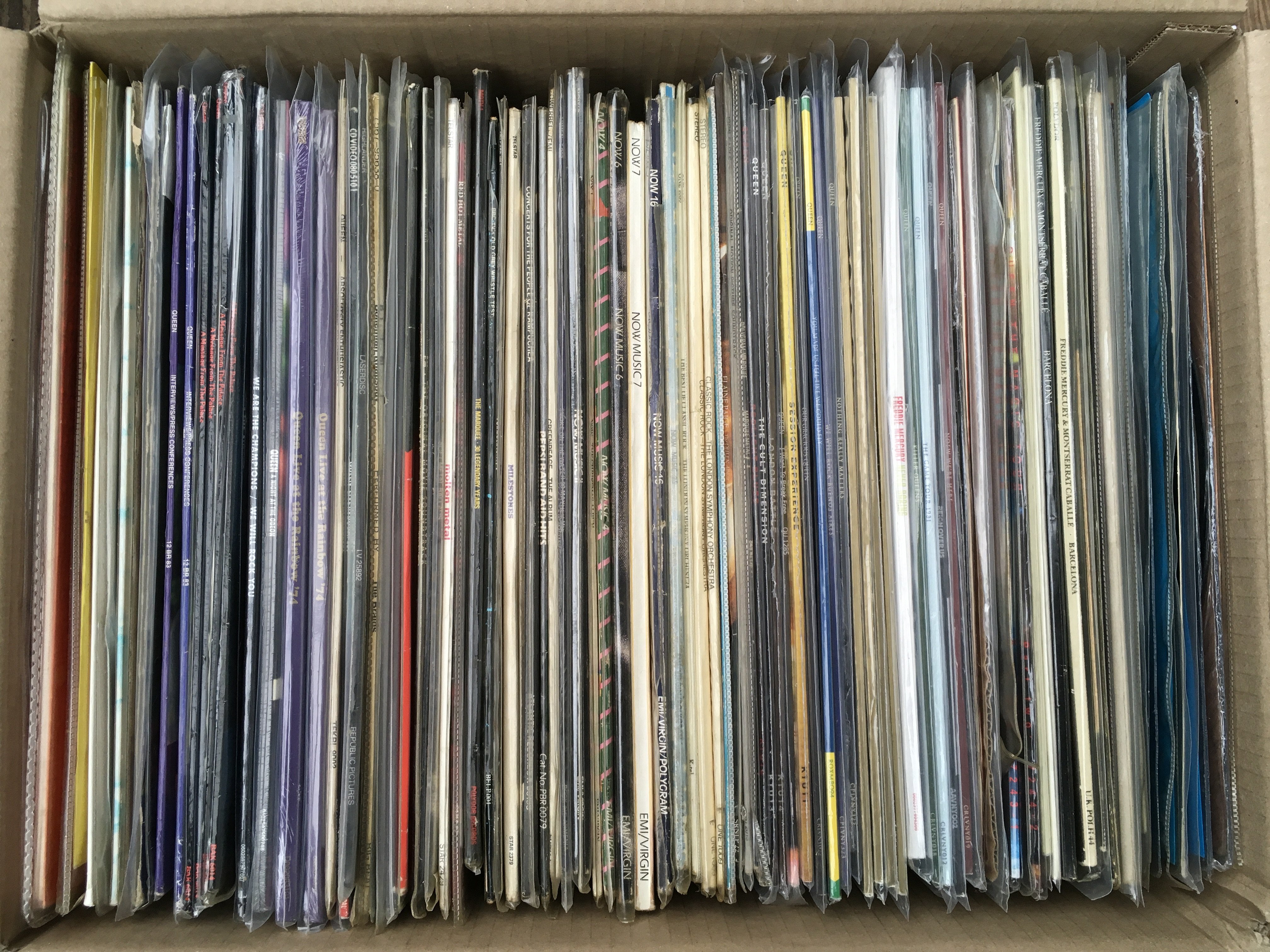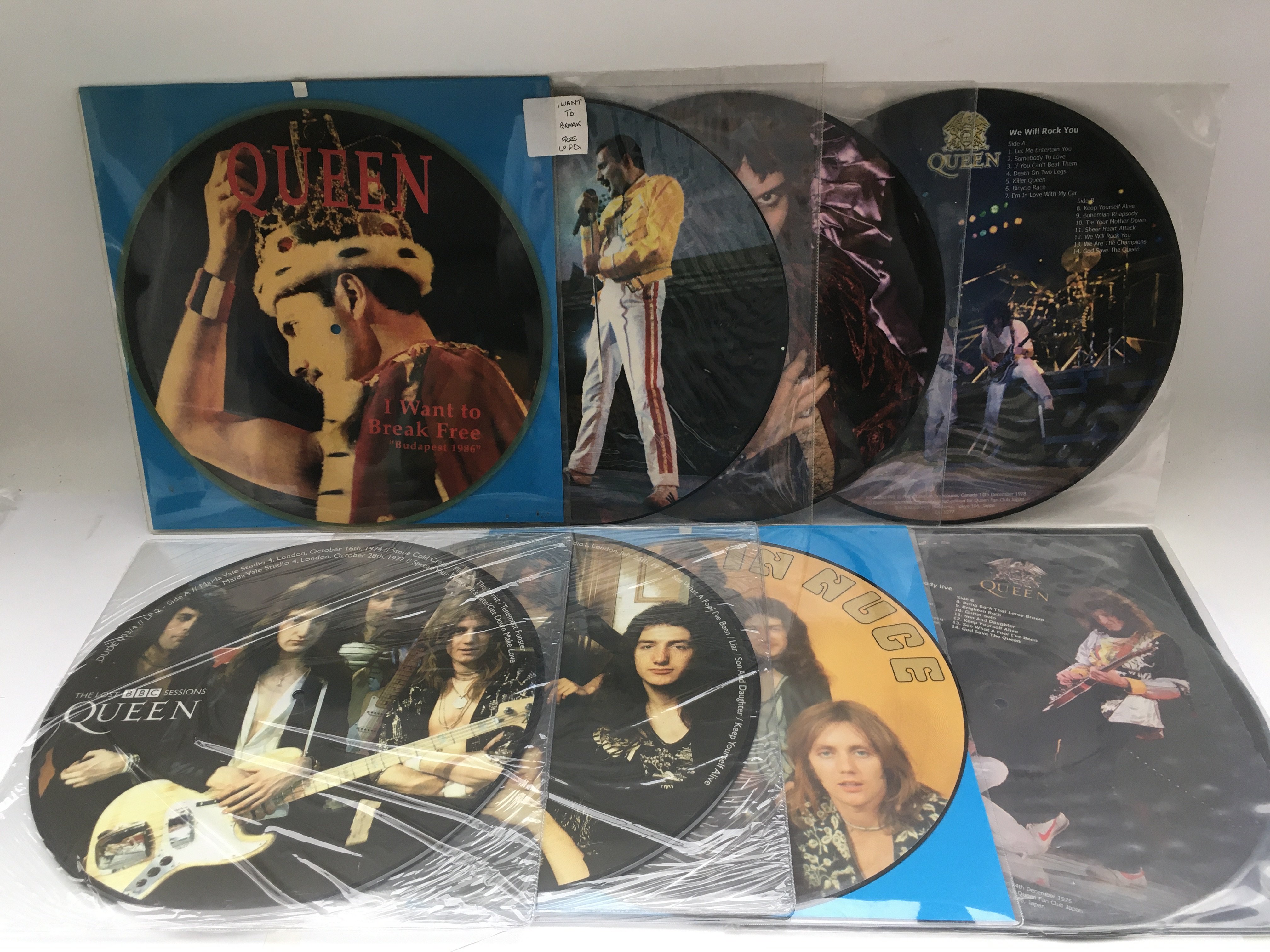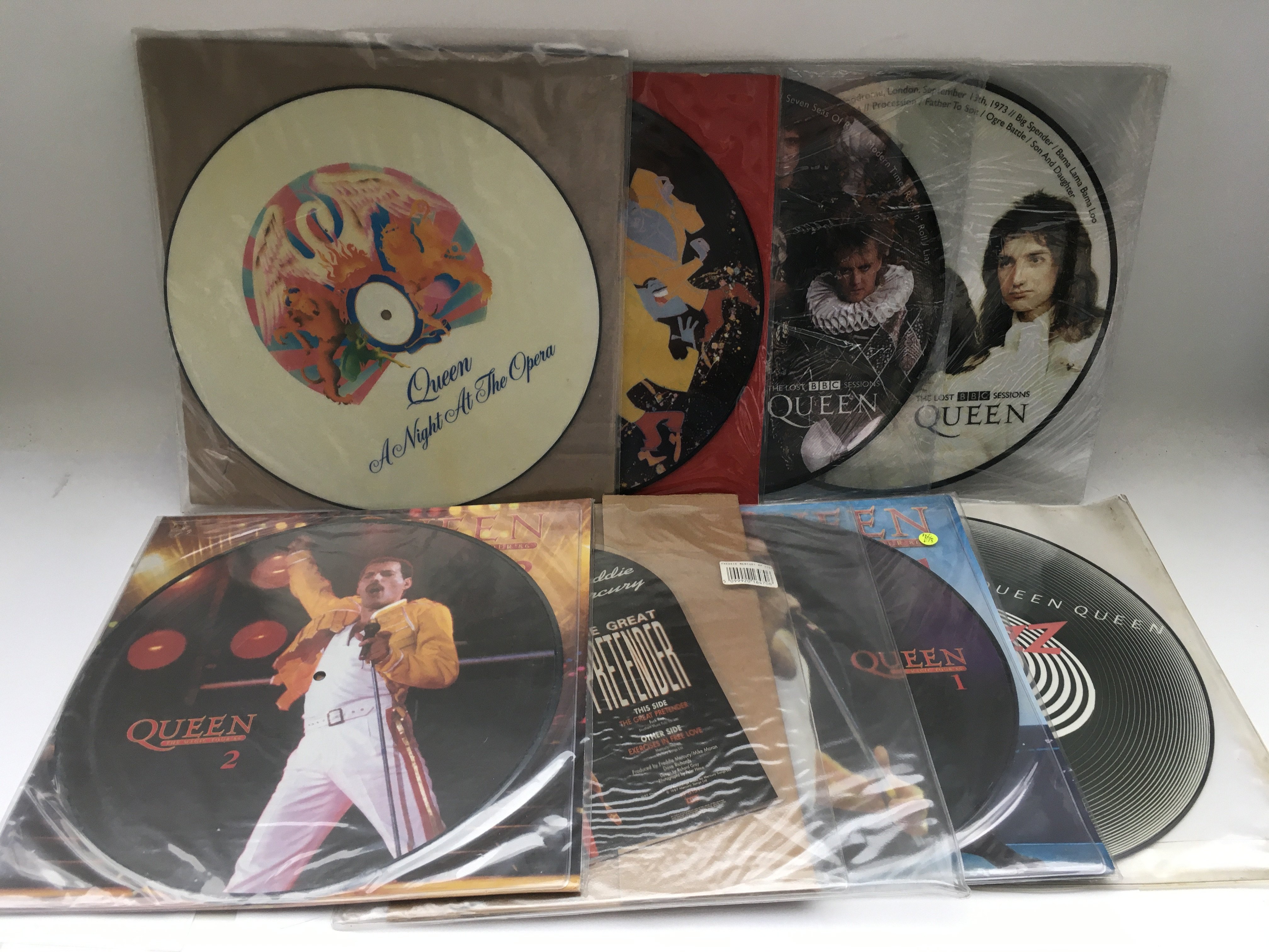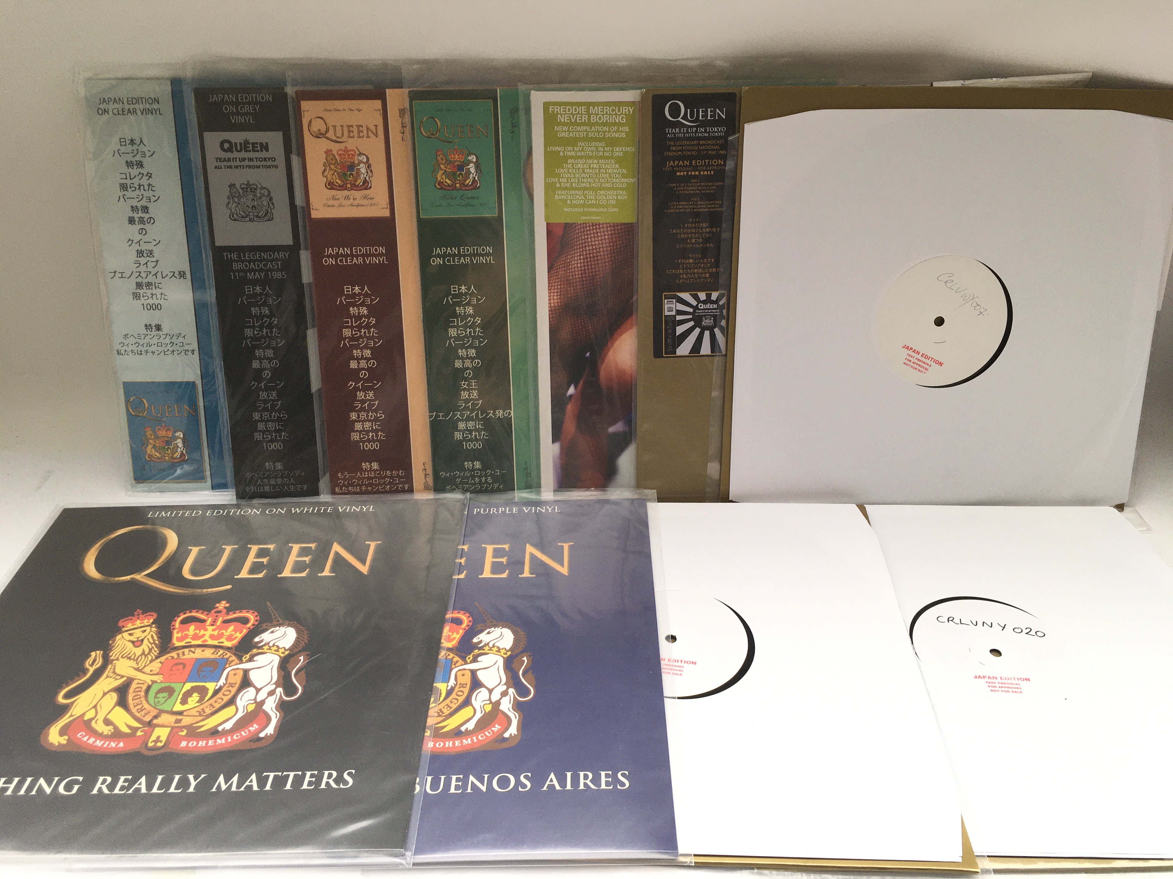 A box of Queen and related LPs and 12" singles including Japanese pressings, promos and coloured vinyl.