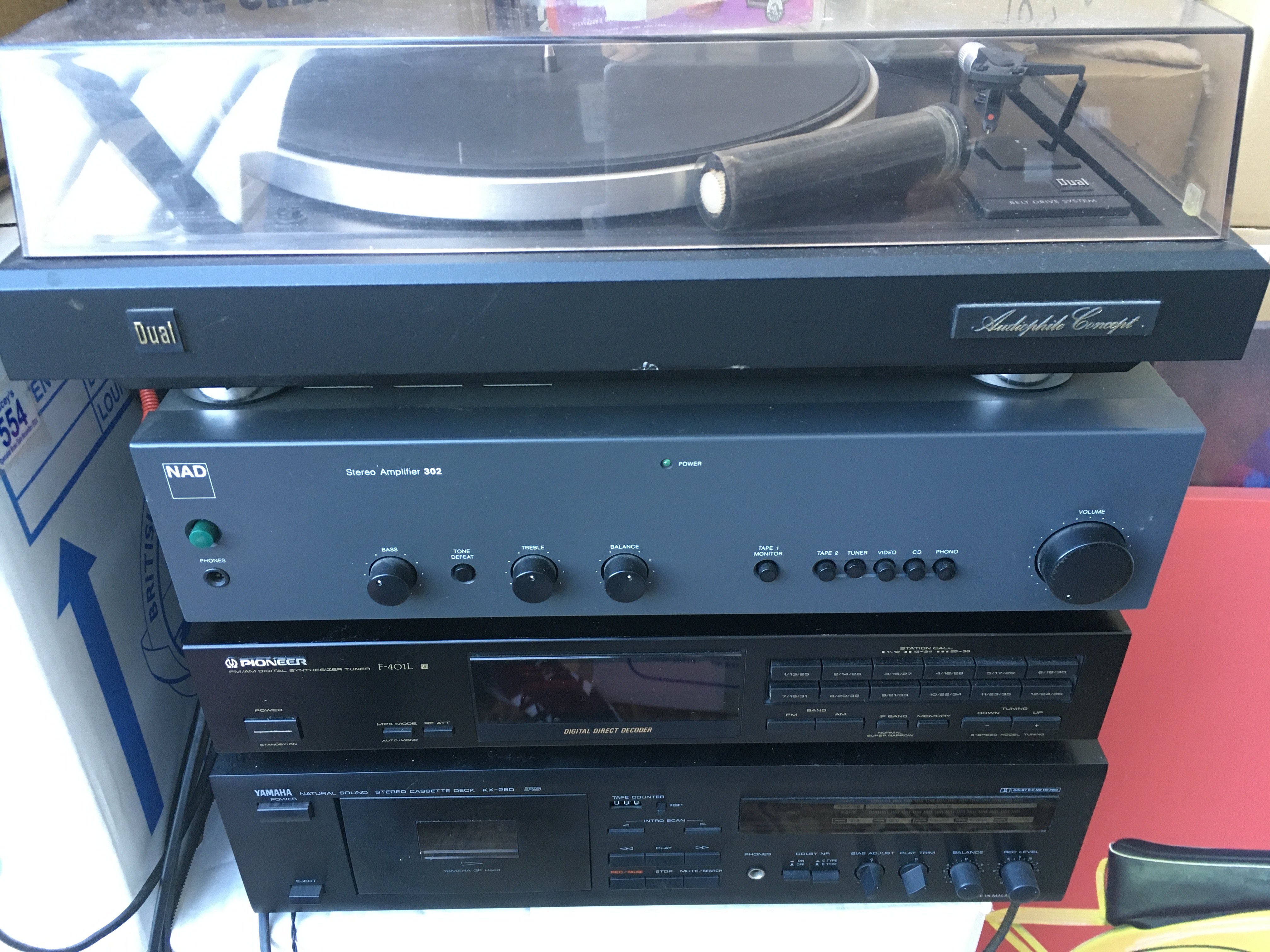 A Dual CS 505-4 turntable, NAD 302 amplifier, Pioneer F-401L digital tuner and a Yamaha KX-260 cassette deck (4).