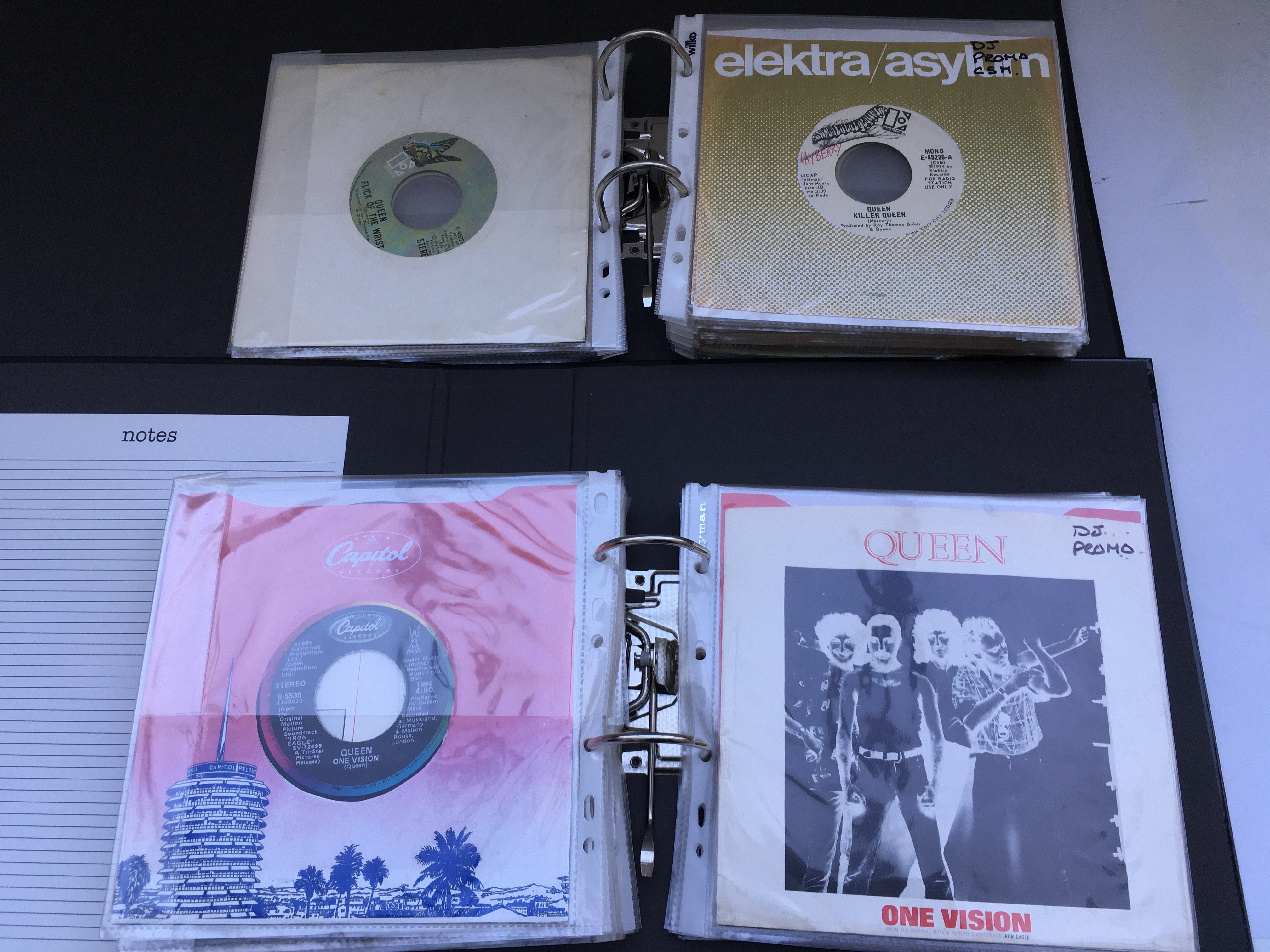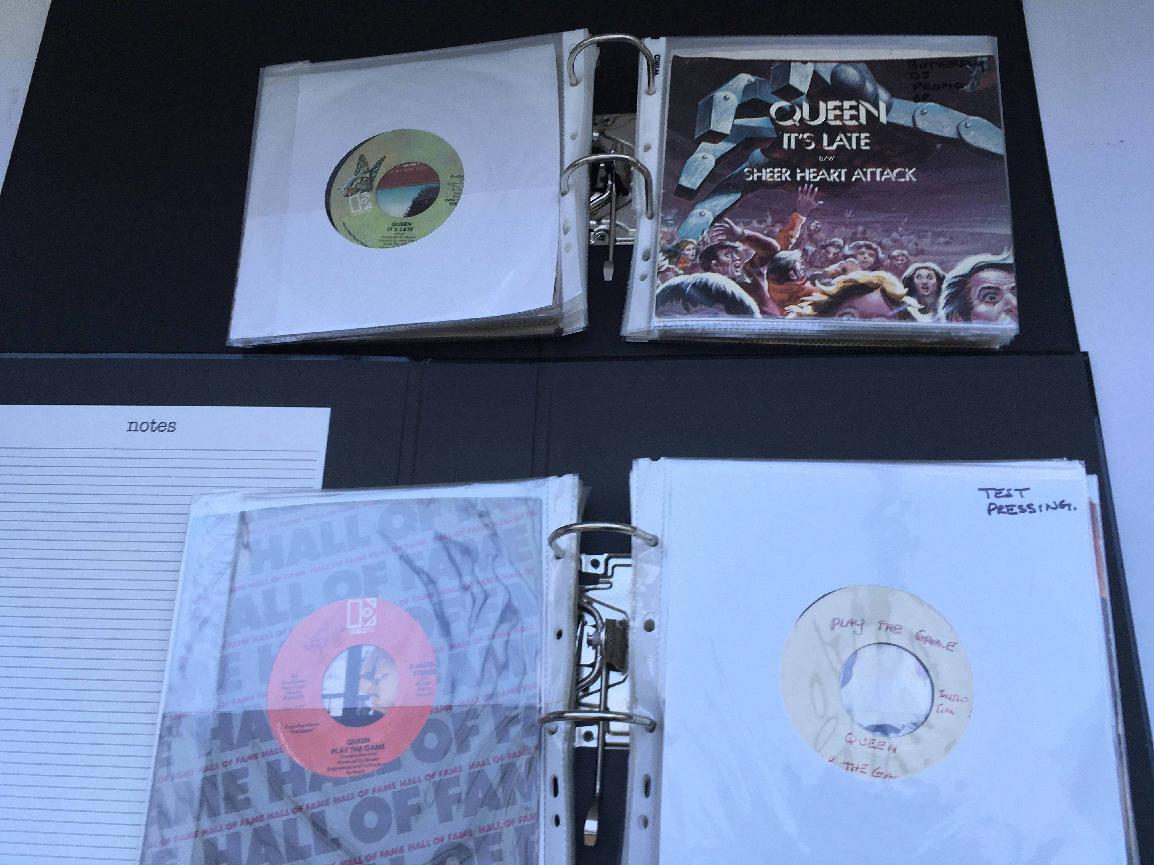 A box containing four binders of Queen 7" singles comprising US pressings and promos and a test pressing of 'Play The Game'