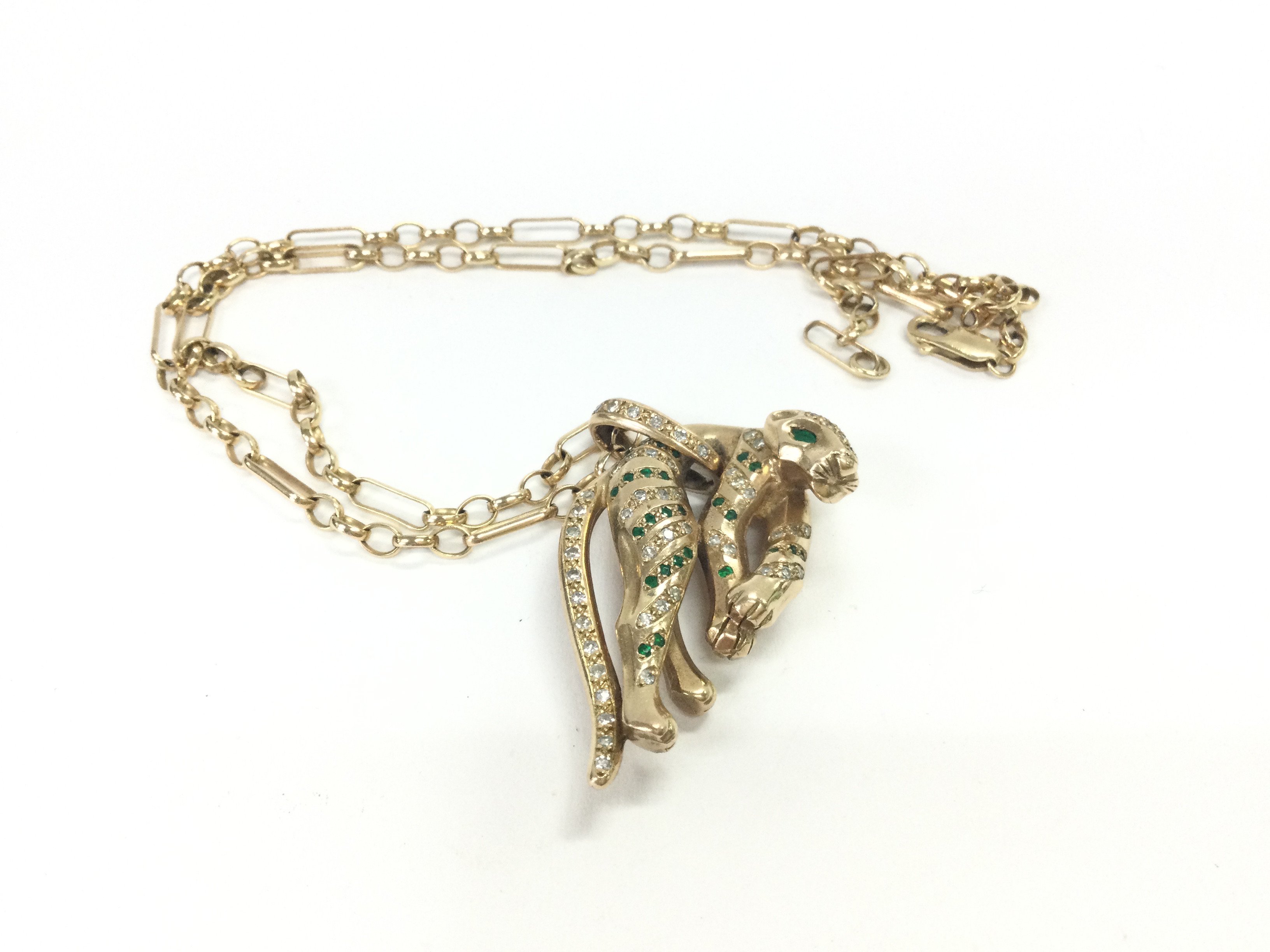 A Cartier (serial number 271139) jaguar stone set pendant (tested 14ct) on a 9ct gold belcher Figaro style necklace. Pendant weight approx 32.12 grams, necklace weight 9.52 grams.