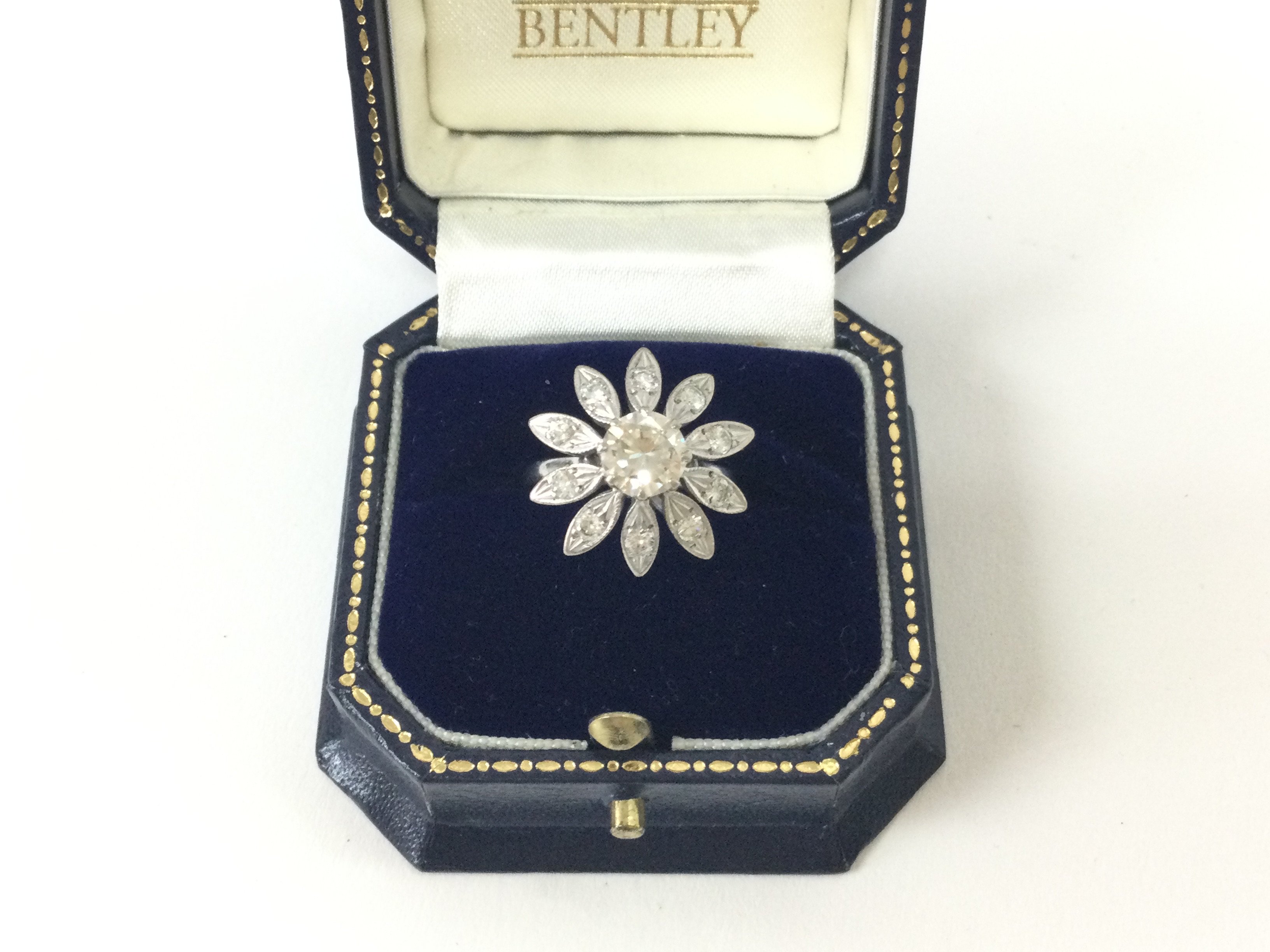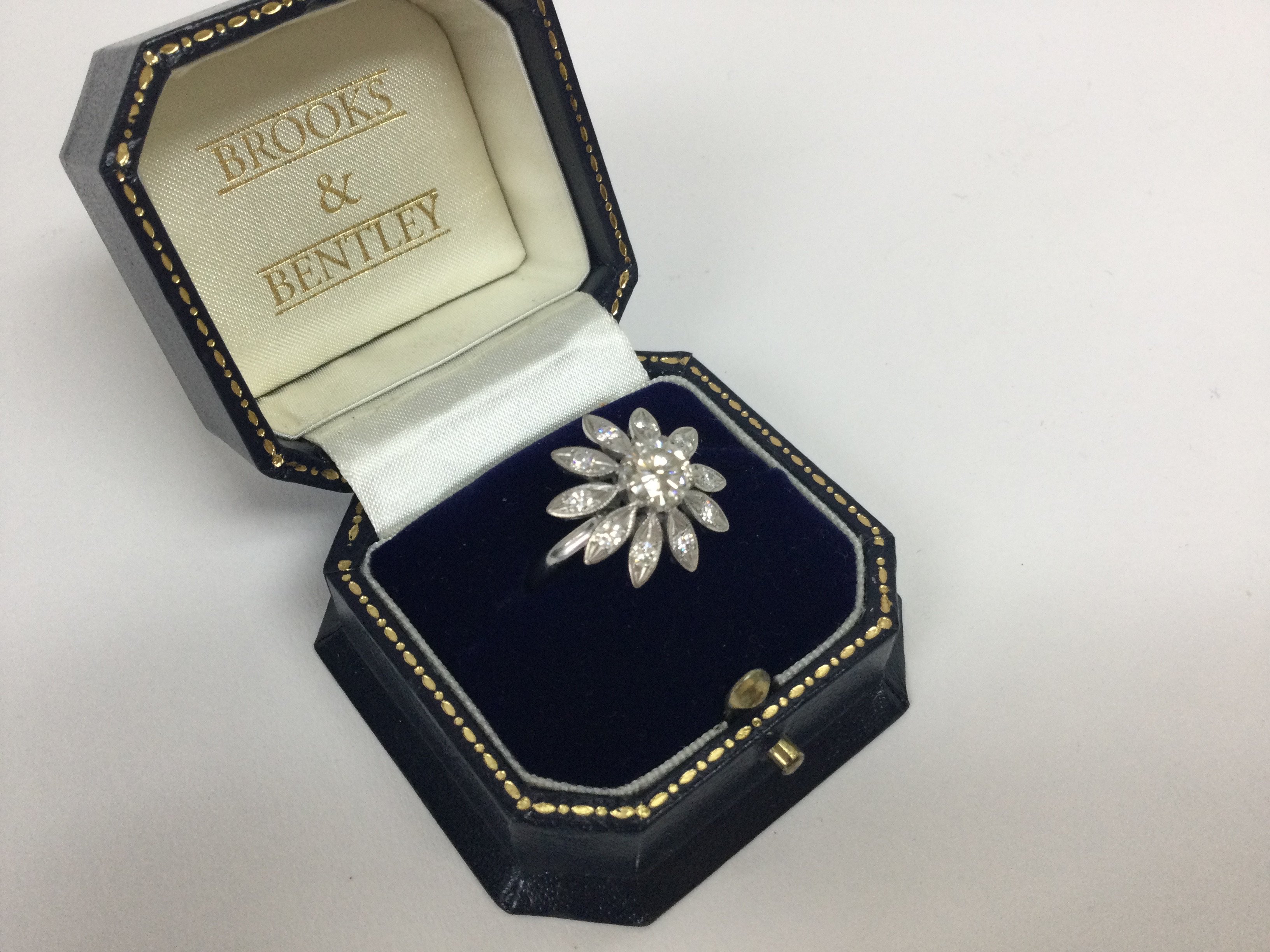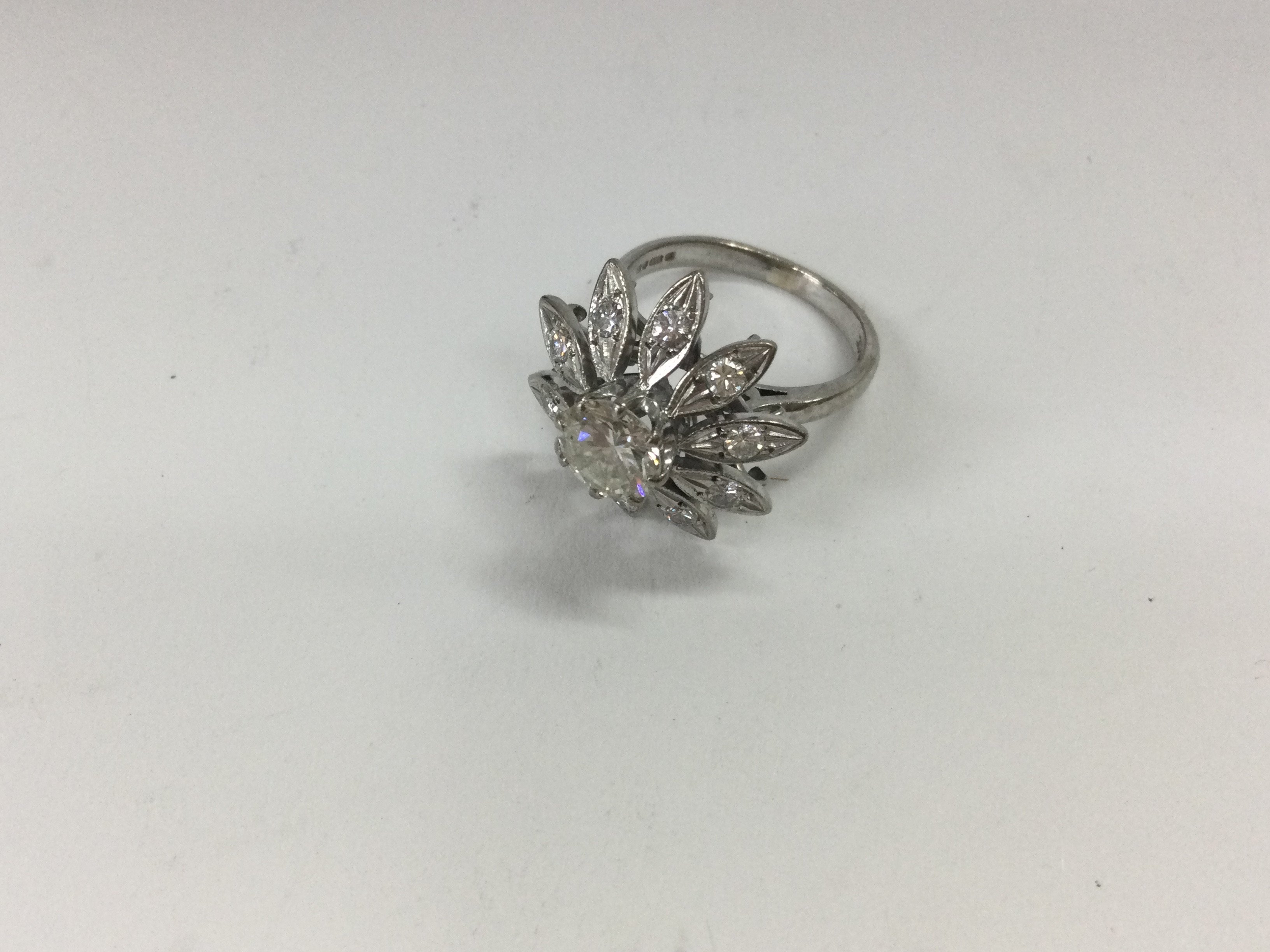 An 18ct white gold diamond set flower style ring, set with a large centre stone surrounded by petals set with singular stones. Approx weight 7.06 grams, size L.