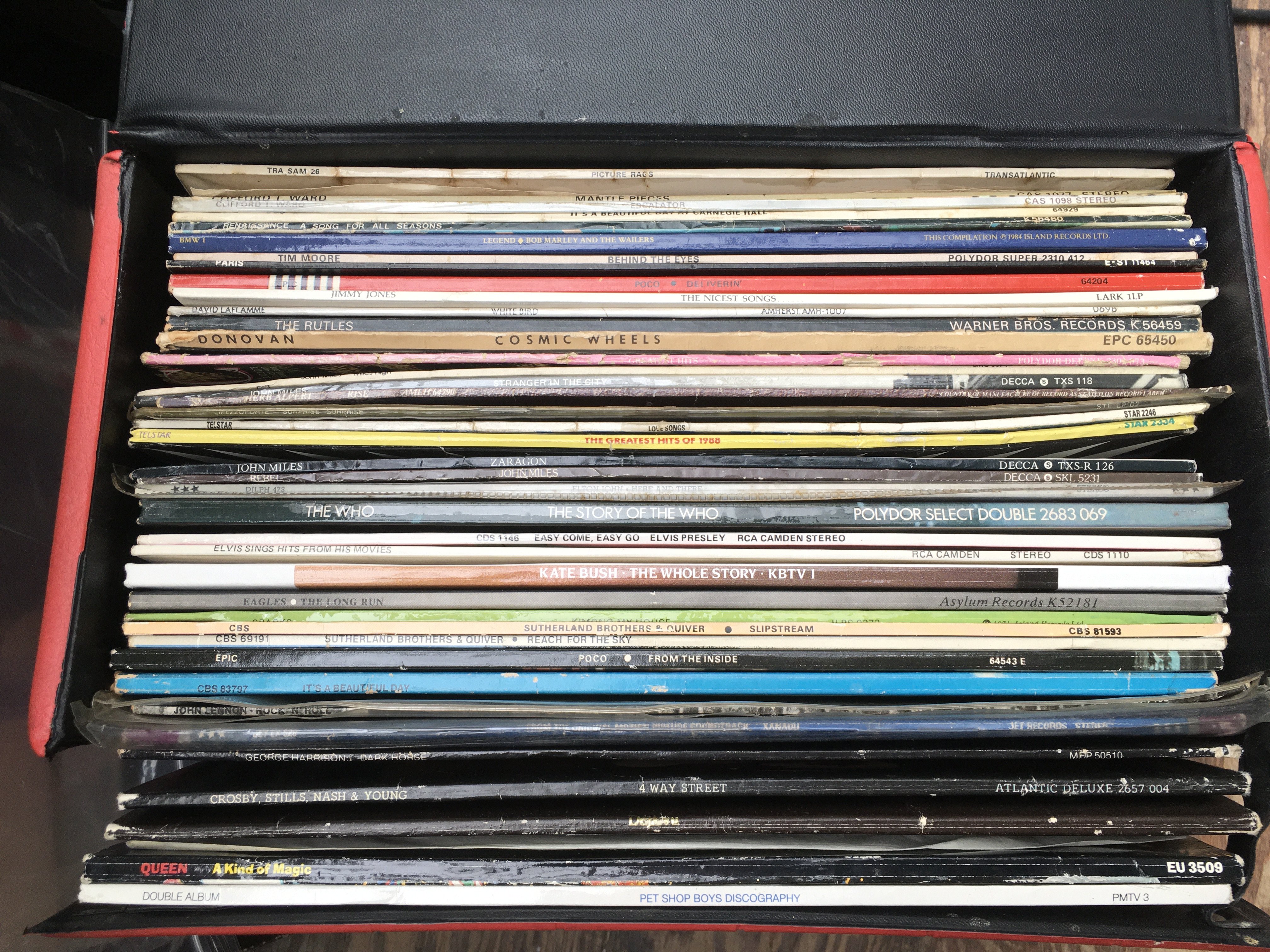 A record case of LPs by various artists including The Who, Kate Bush, George Harrison and others.