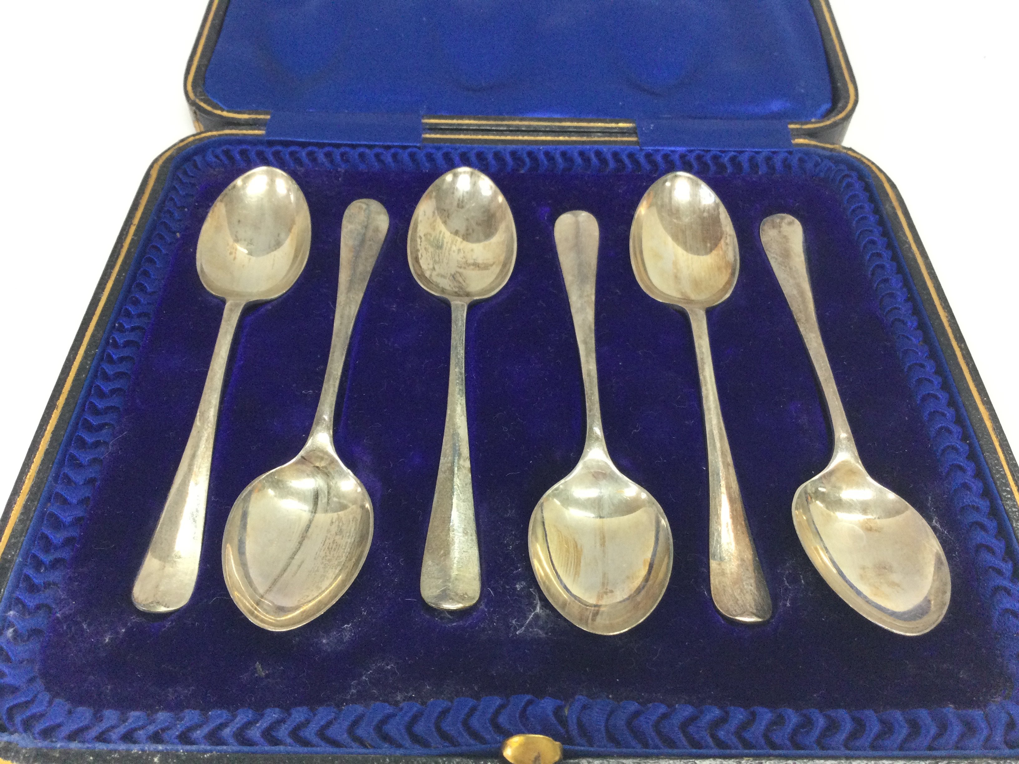 A boxed set of six silver hallmarked spoons approx 11 grams each.