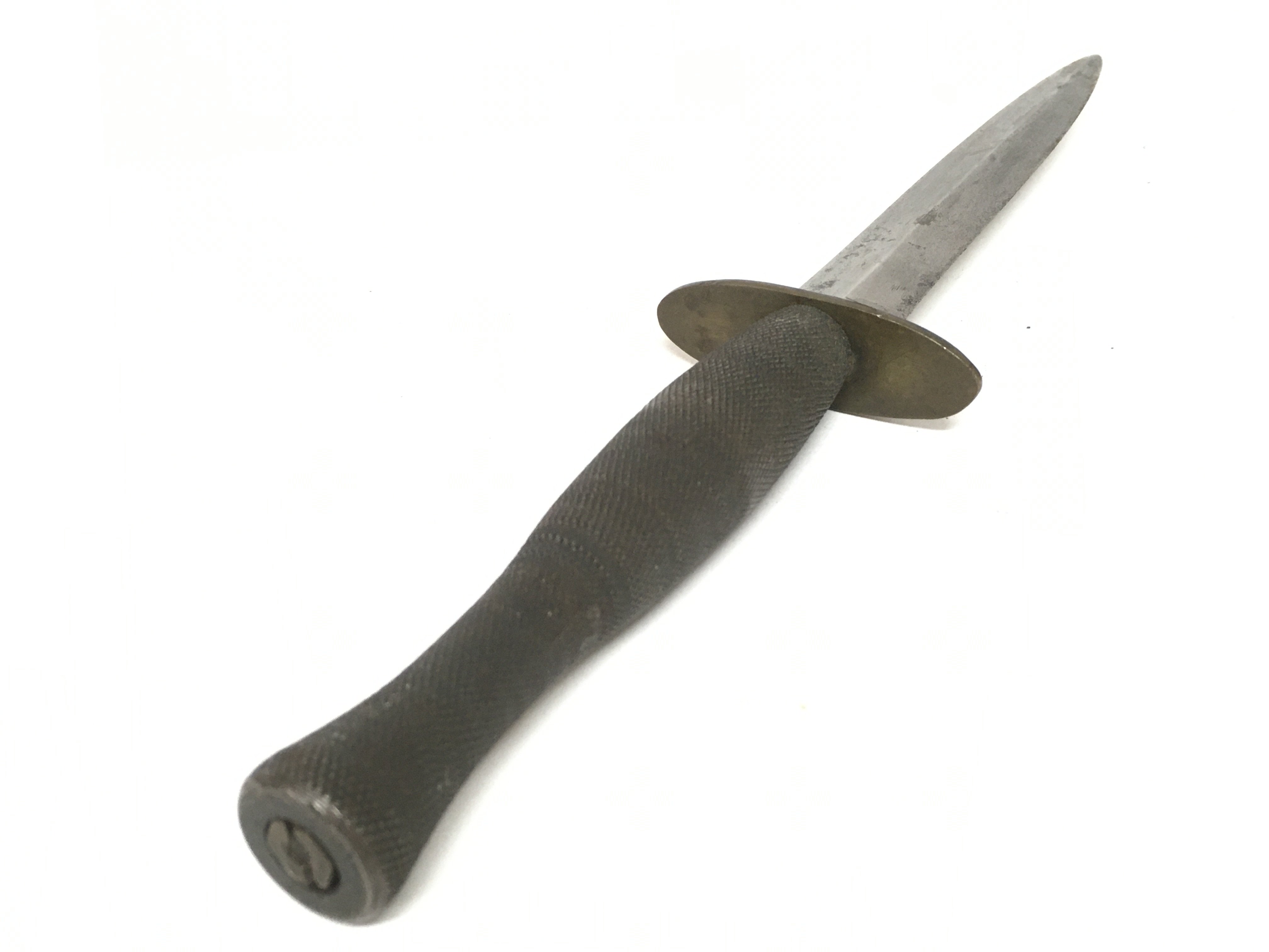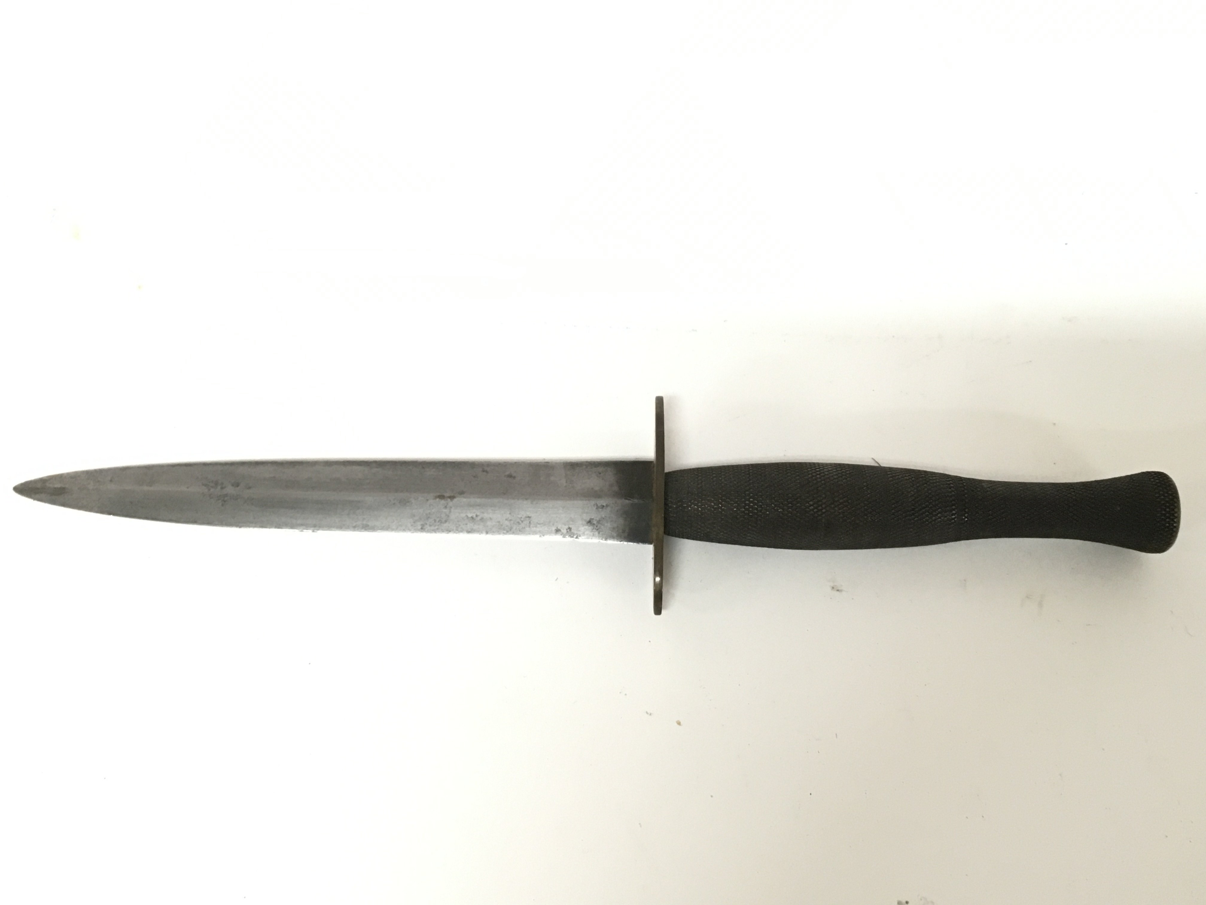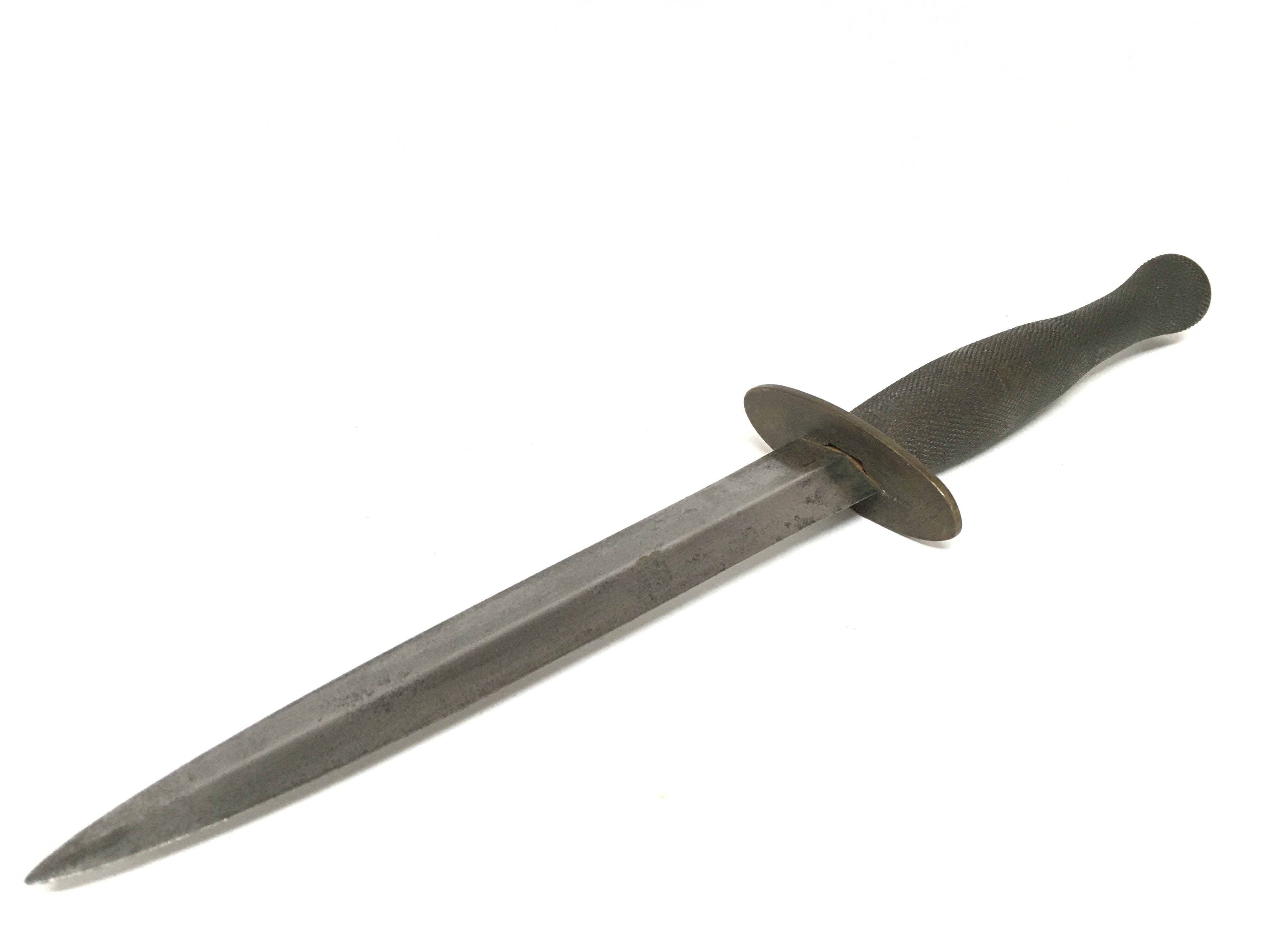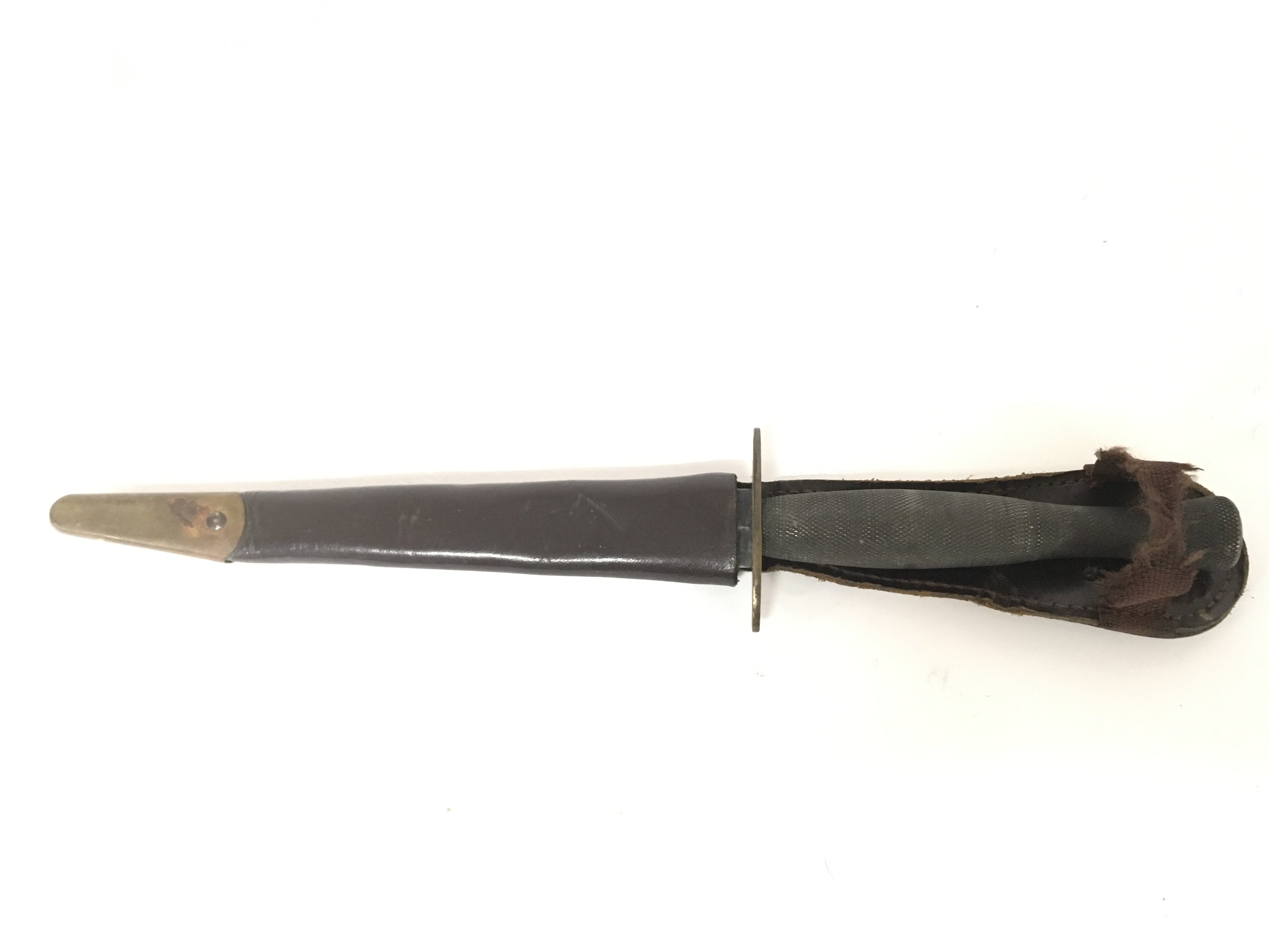 A Fairbairn Sykes Commando fighting knife with leather sheath. 16cm long blade. 28.5cm total length .This lot cannot be posted