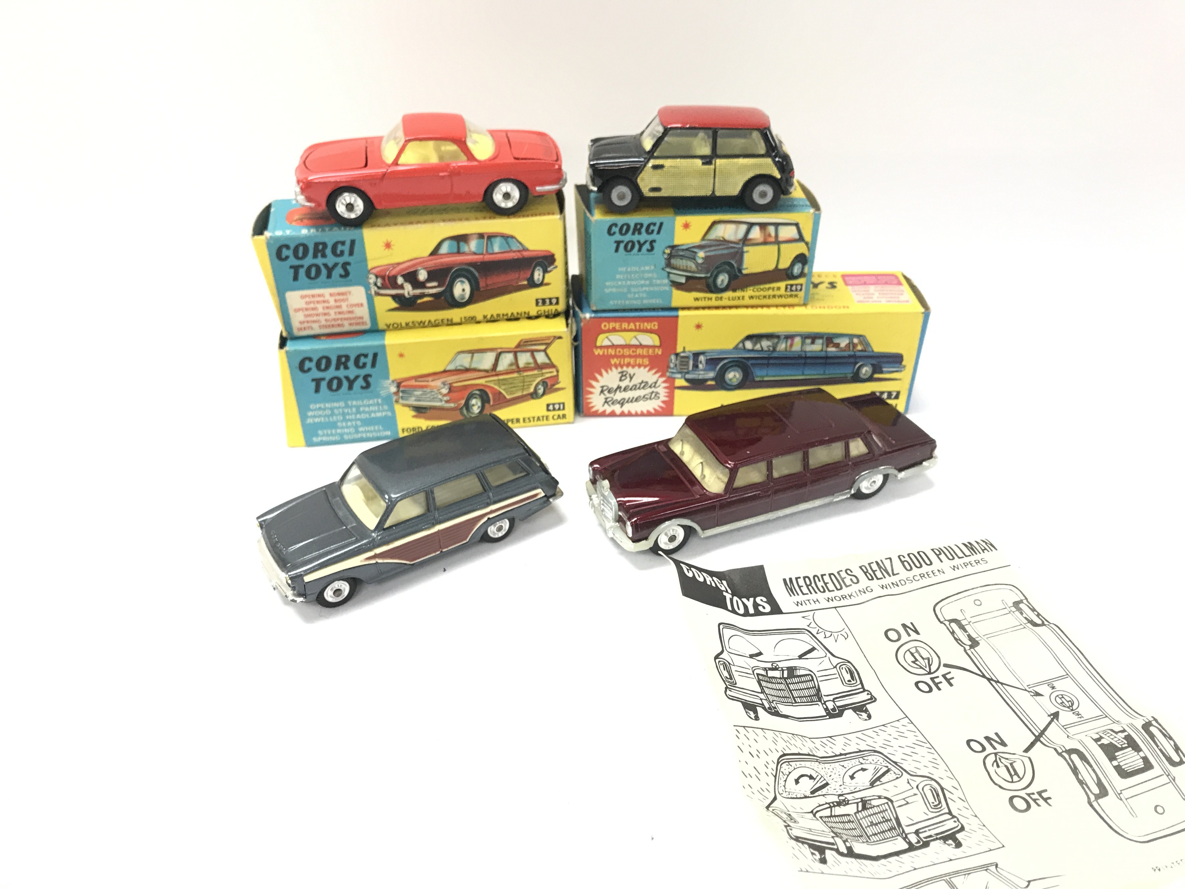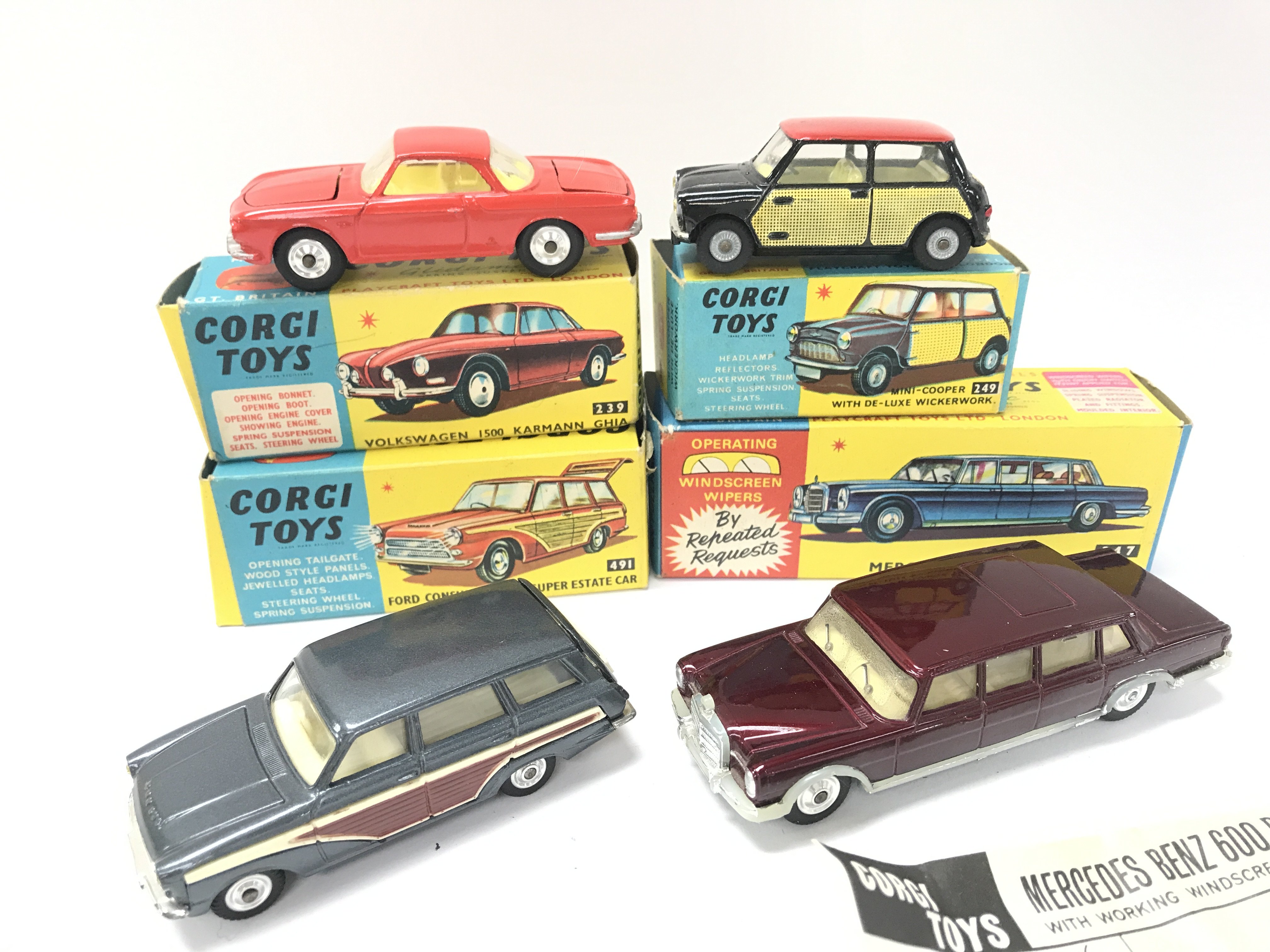4 Boxed Corgi Vehicles. A Volkswagen 1500 Karmann Ghia #239. A Mini-Cooper #249. A Ford Consul Cortina Super Estate Car #491 and a Mercedes Benz 600 Pullman #247.