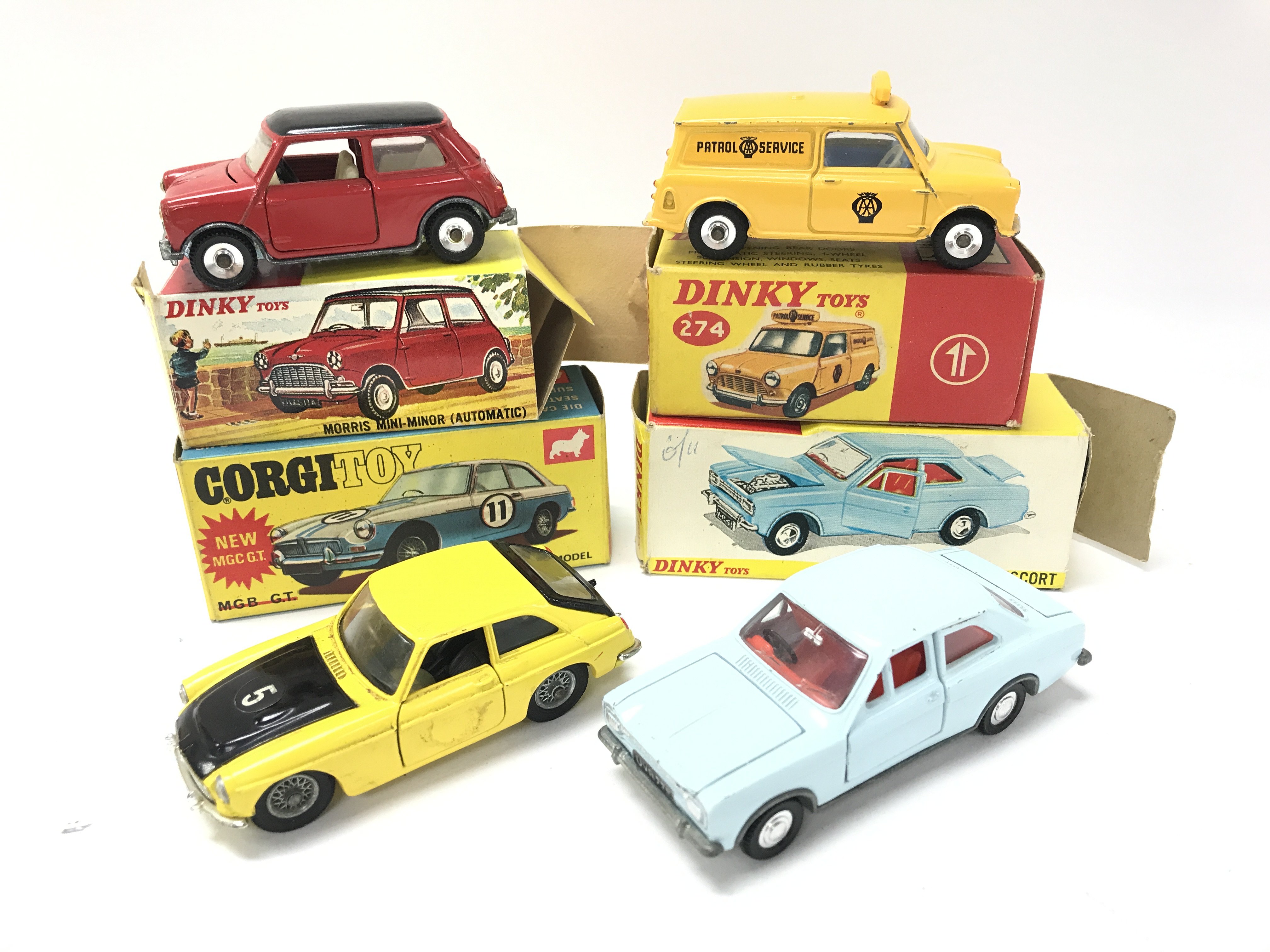 A Boxed Dinky Morris Mini-Minor #183. An A.A. Mini Van #274. A Ford Escort #168 and a MGC GT (No Case) #345.