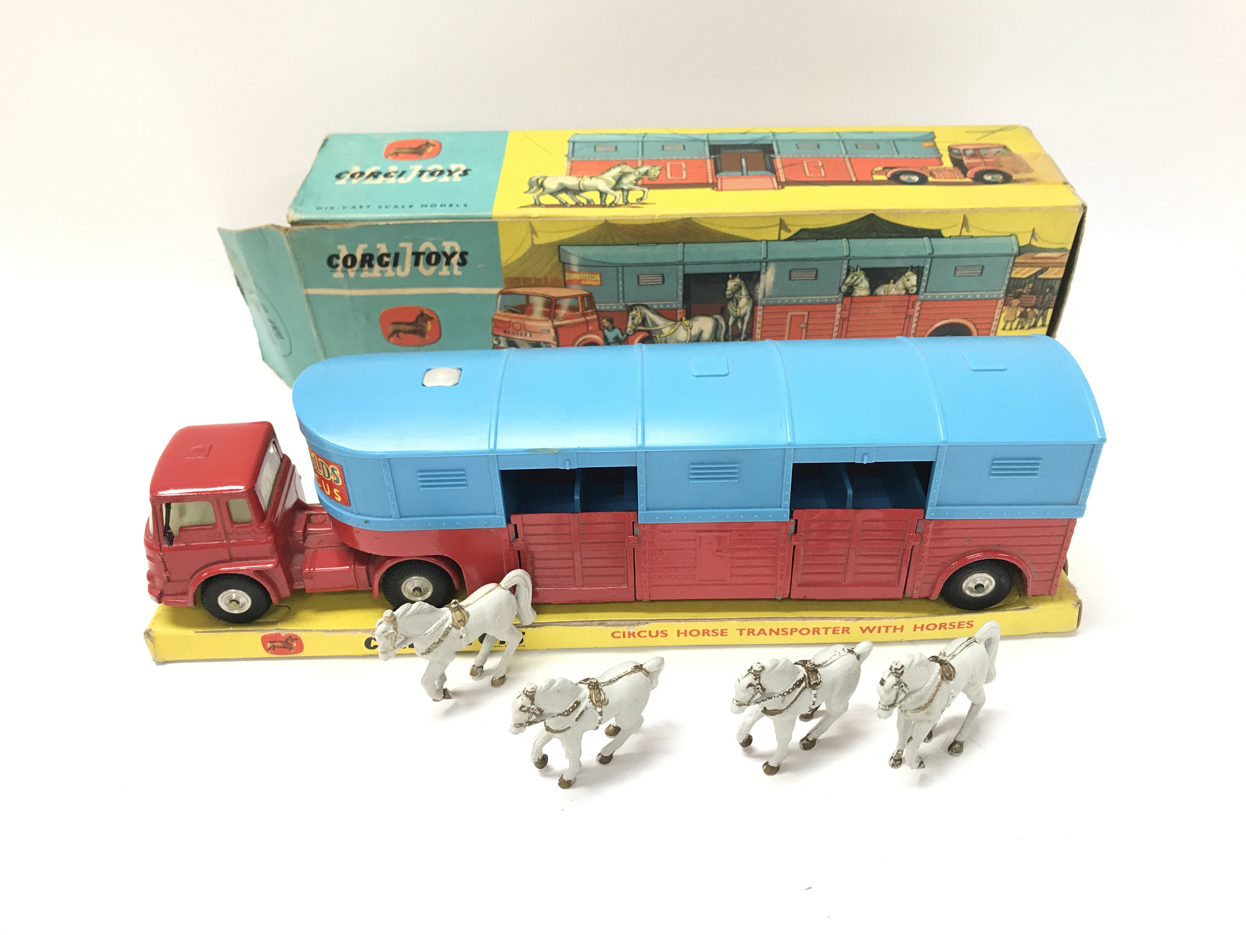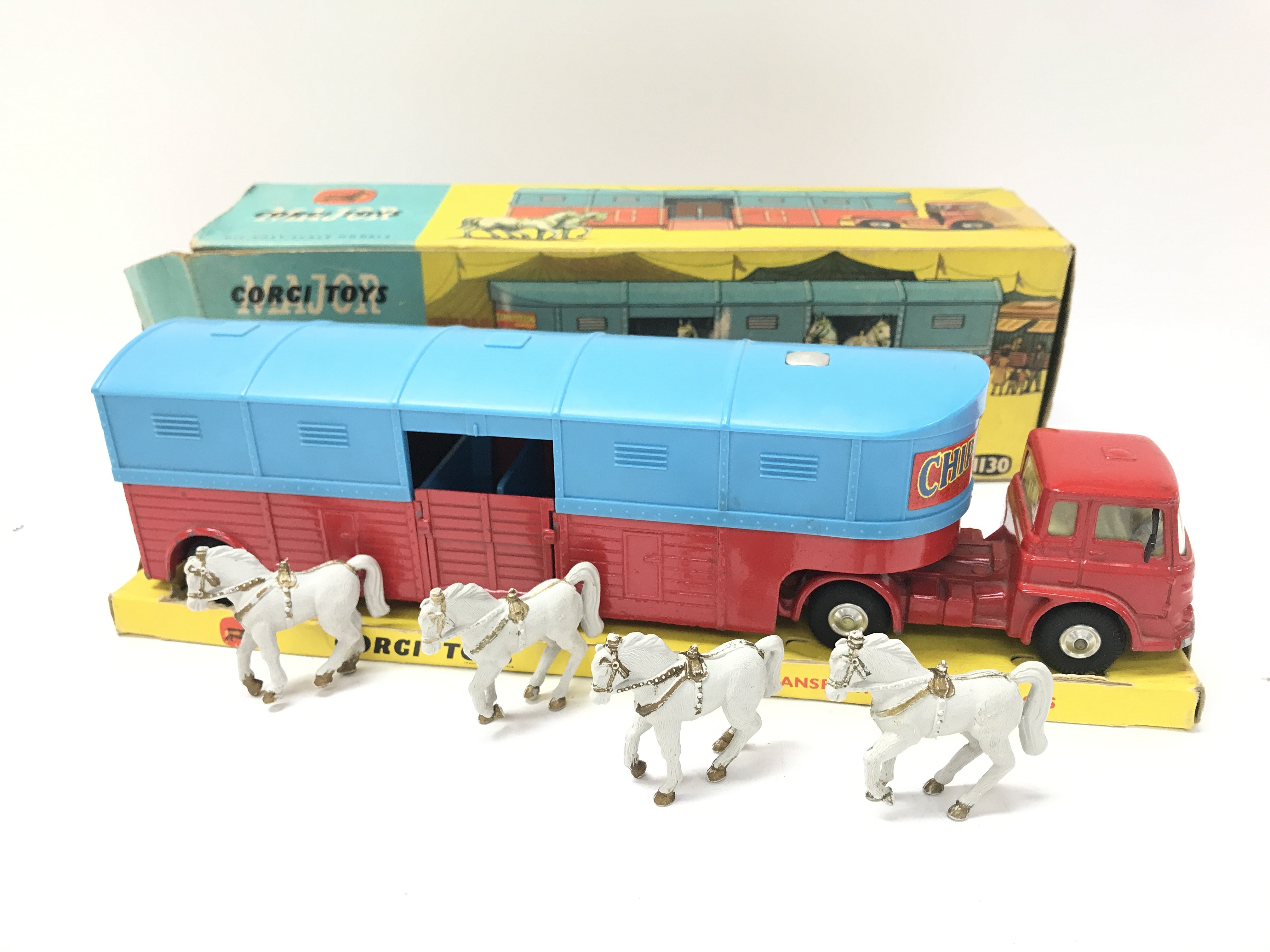 A Boxed Corgi Circus Horse Transporter With Horses #1130. Box Is Worn.