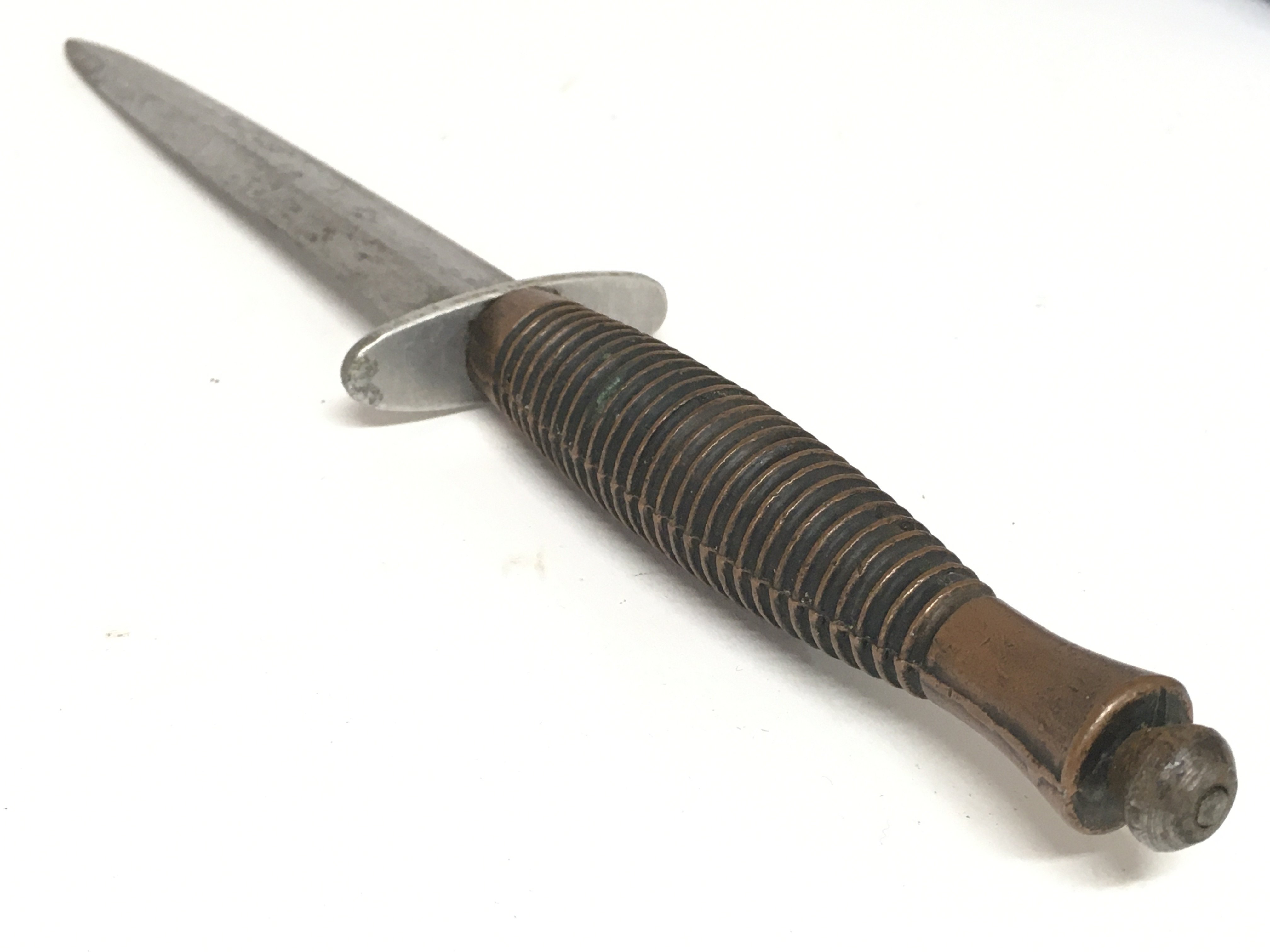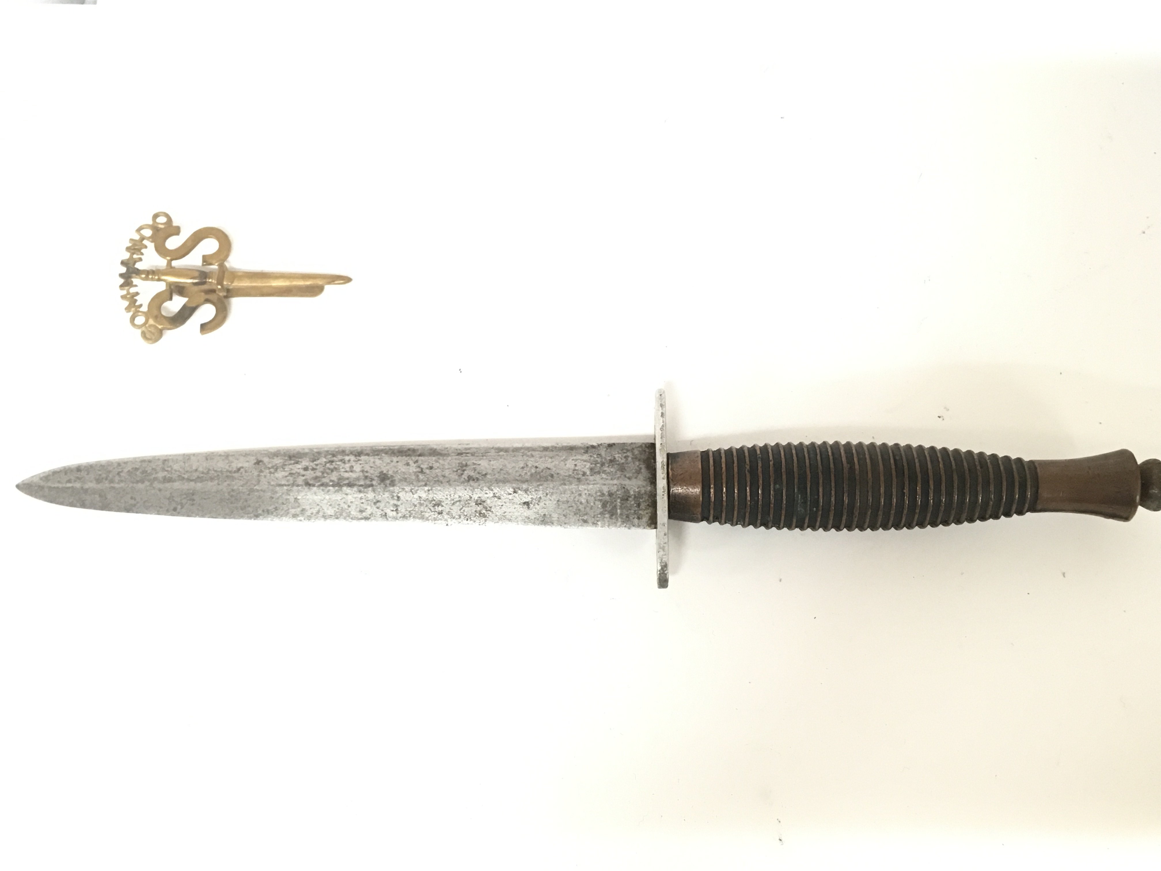 A Fairbairn Sykes design commando knife and a vintage cap badge. This lot cannot be posted