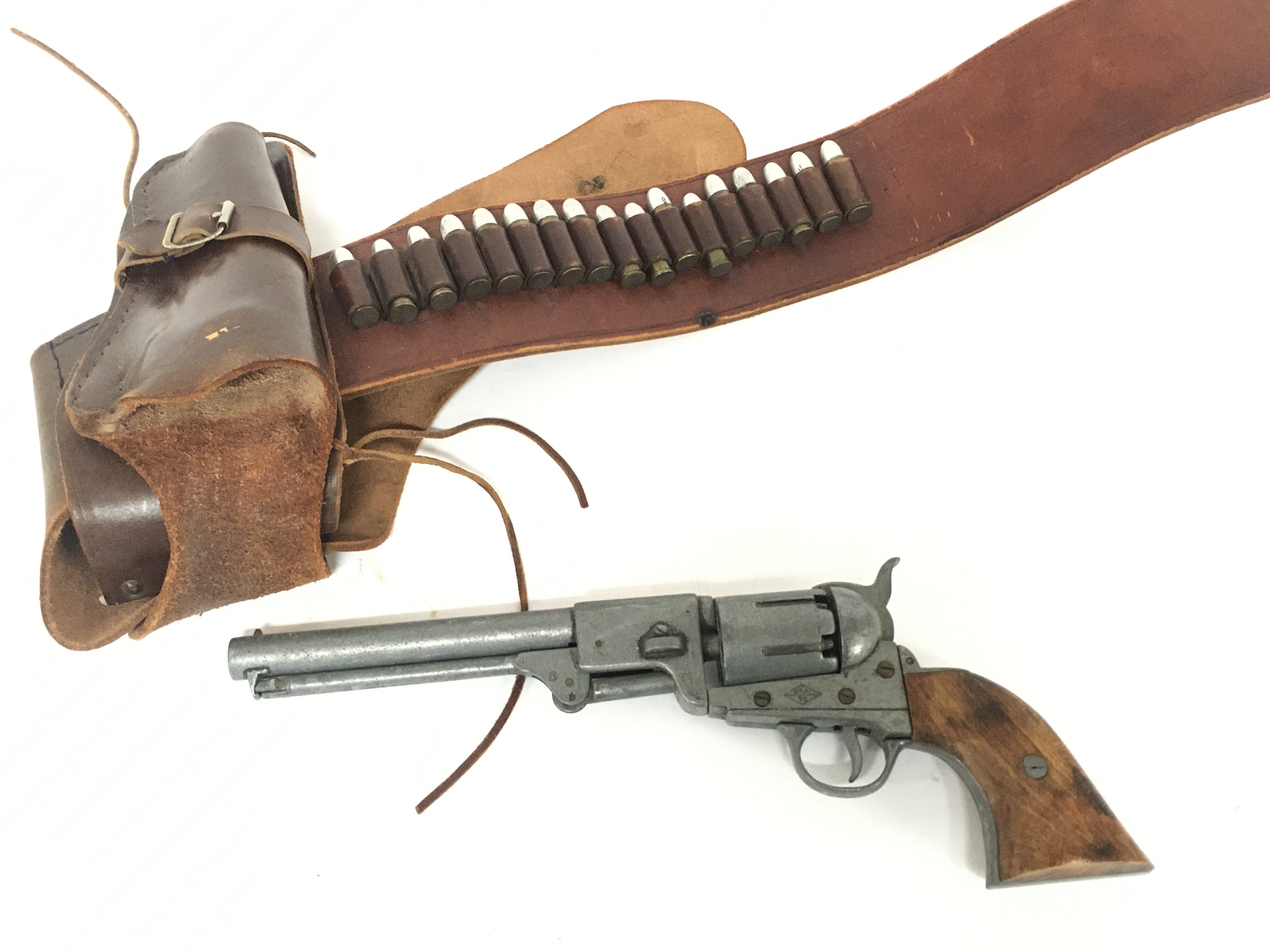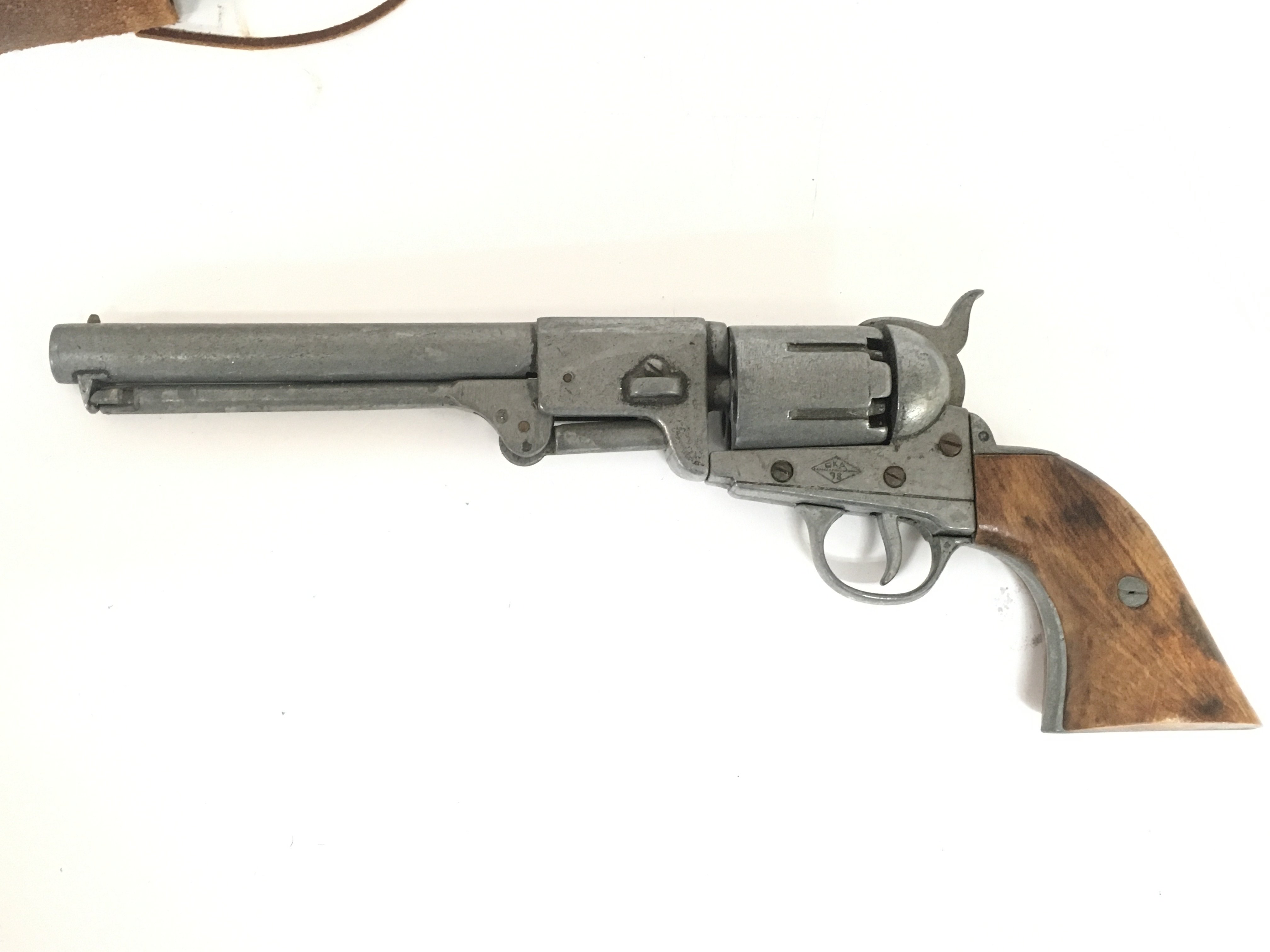 An inert wooden and metal replica of a Colt Army Revolver with a working mechanism, leather holster and dummy bullets