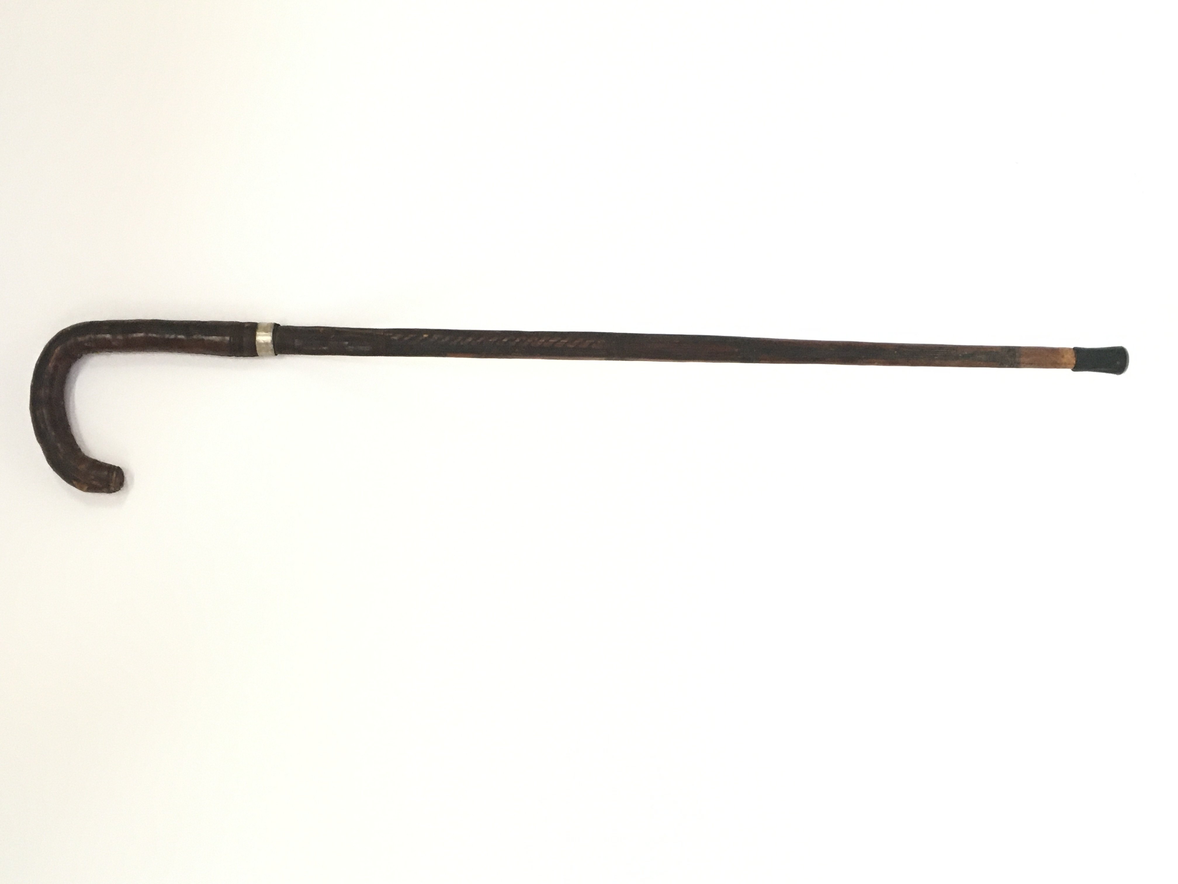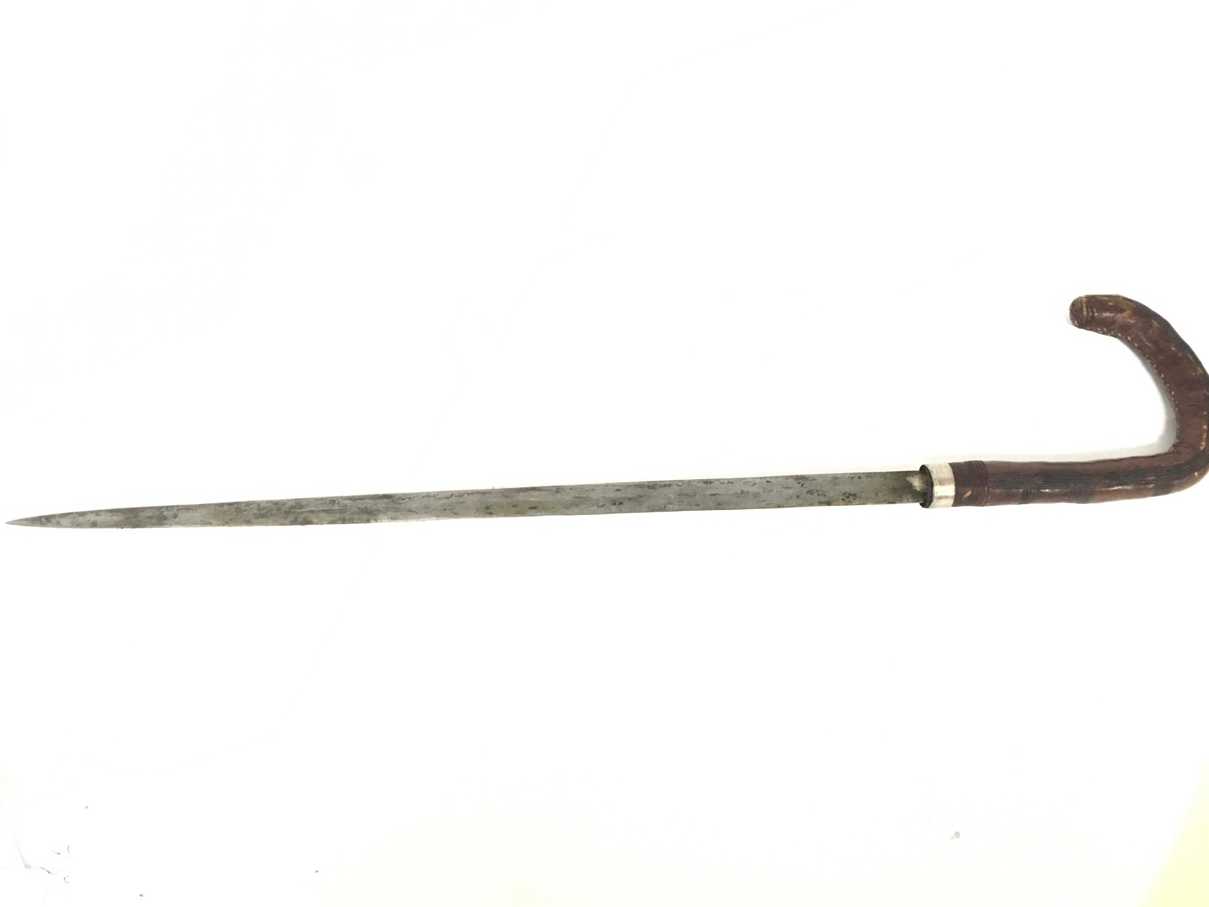 An antique full blade leather covered sword stick , with a sterling silver collar . Stick 85cm in length