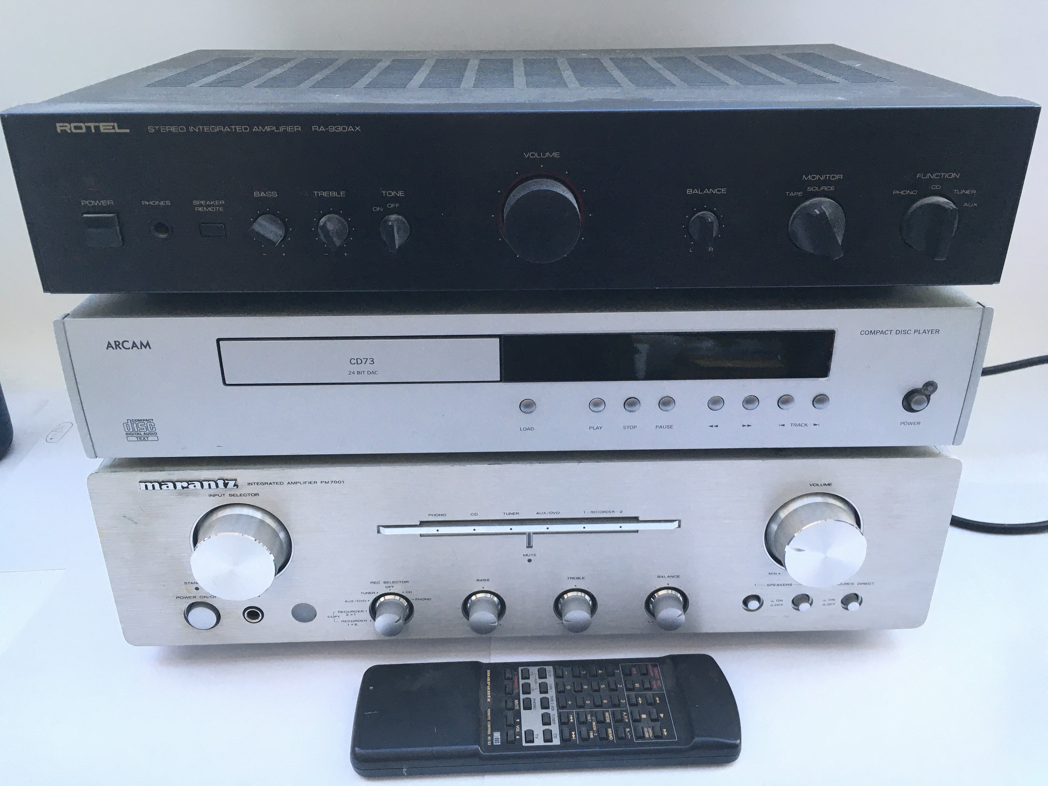 A Marantz PM7001 amplifier, a Pioneer PL-514 turntable, an Arcam CD73 CD player and a Rotel RA-930AX amplifier. Includes a Marantz remote control.