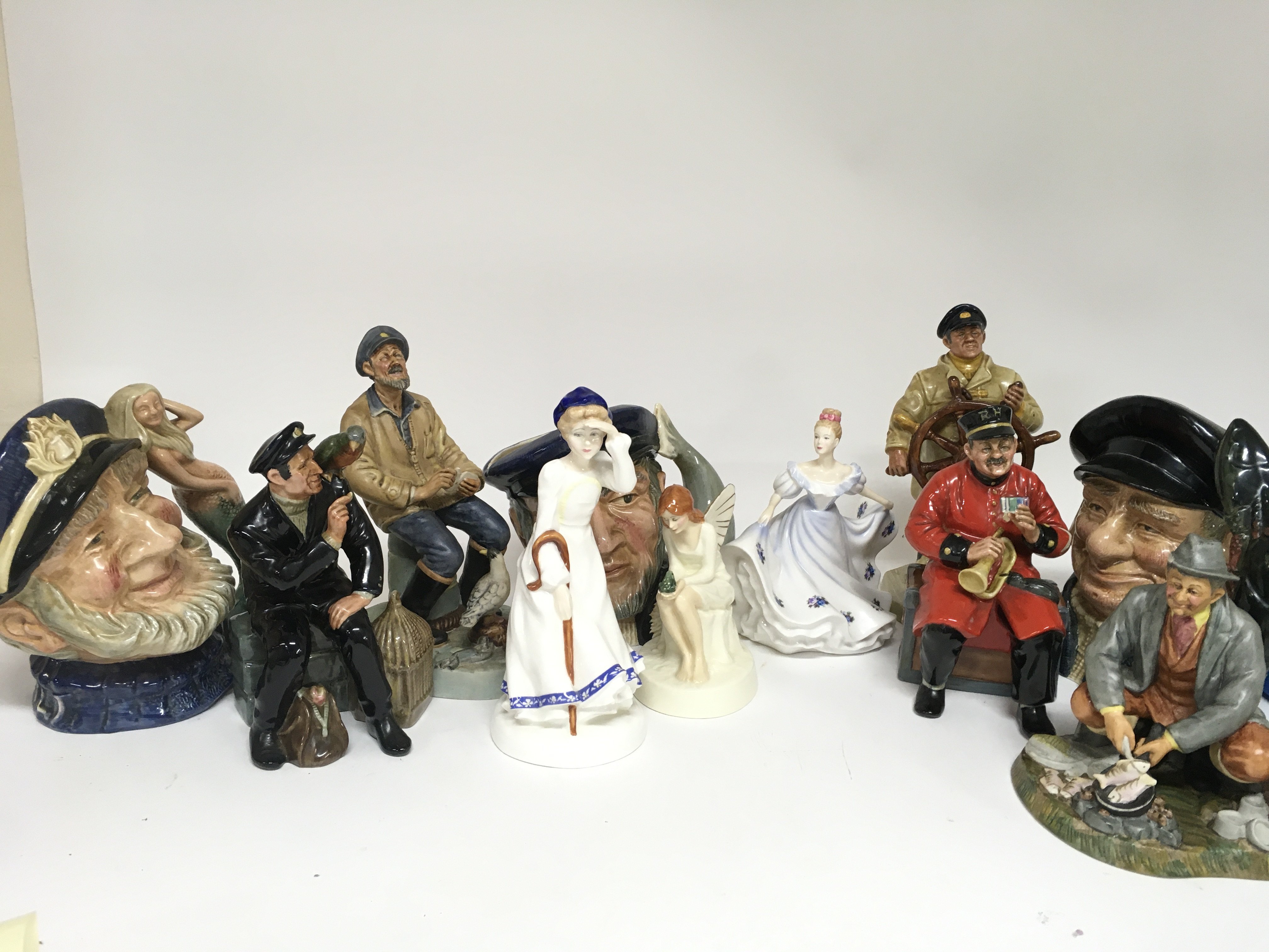 A Collection of Royal Doulton porcelain figures including Past Glory, Shore Leave and character jugs including Lobster Man, Old Salt etc. this lot cannot be posted