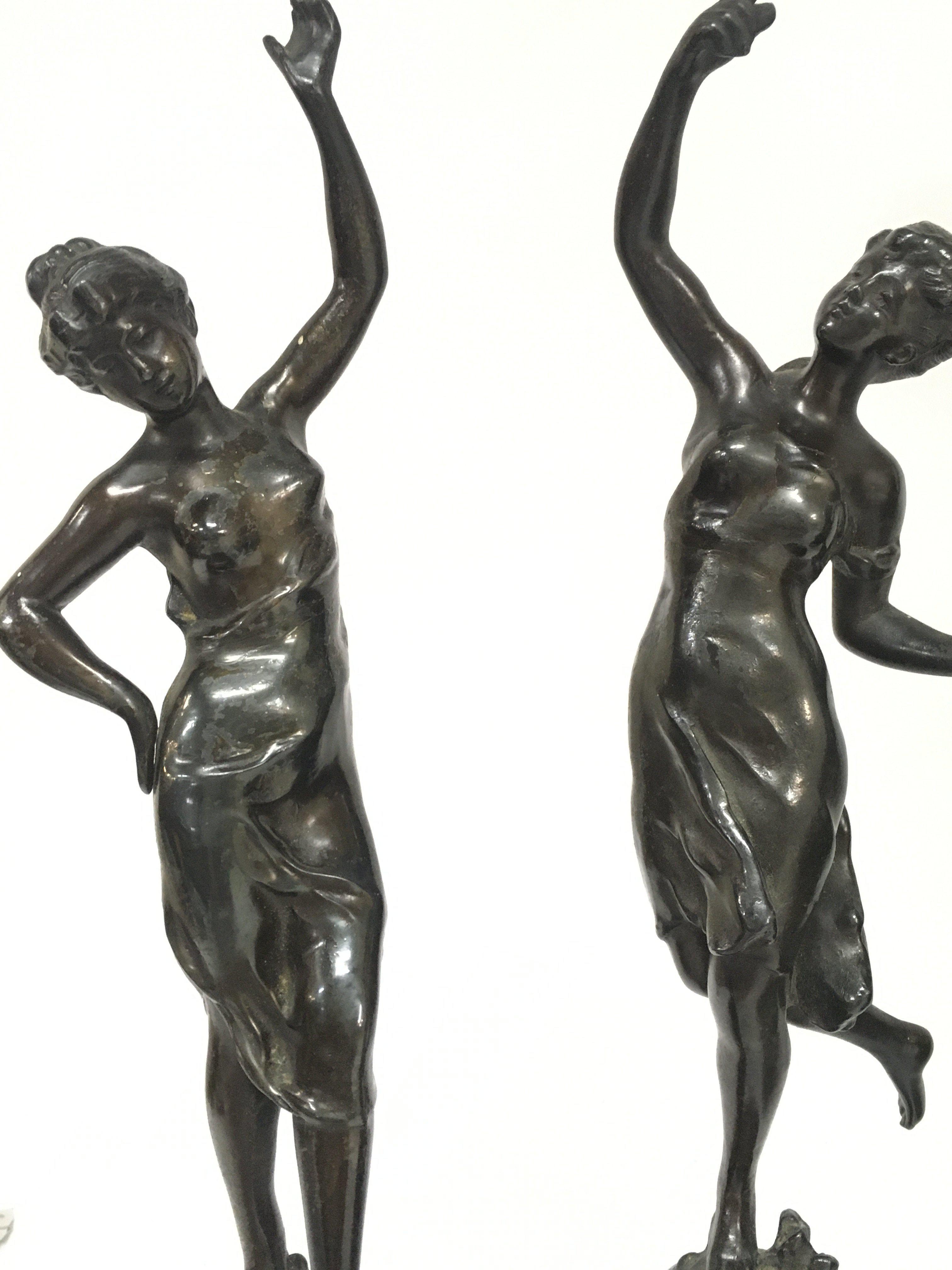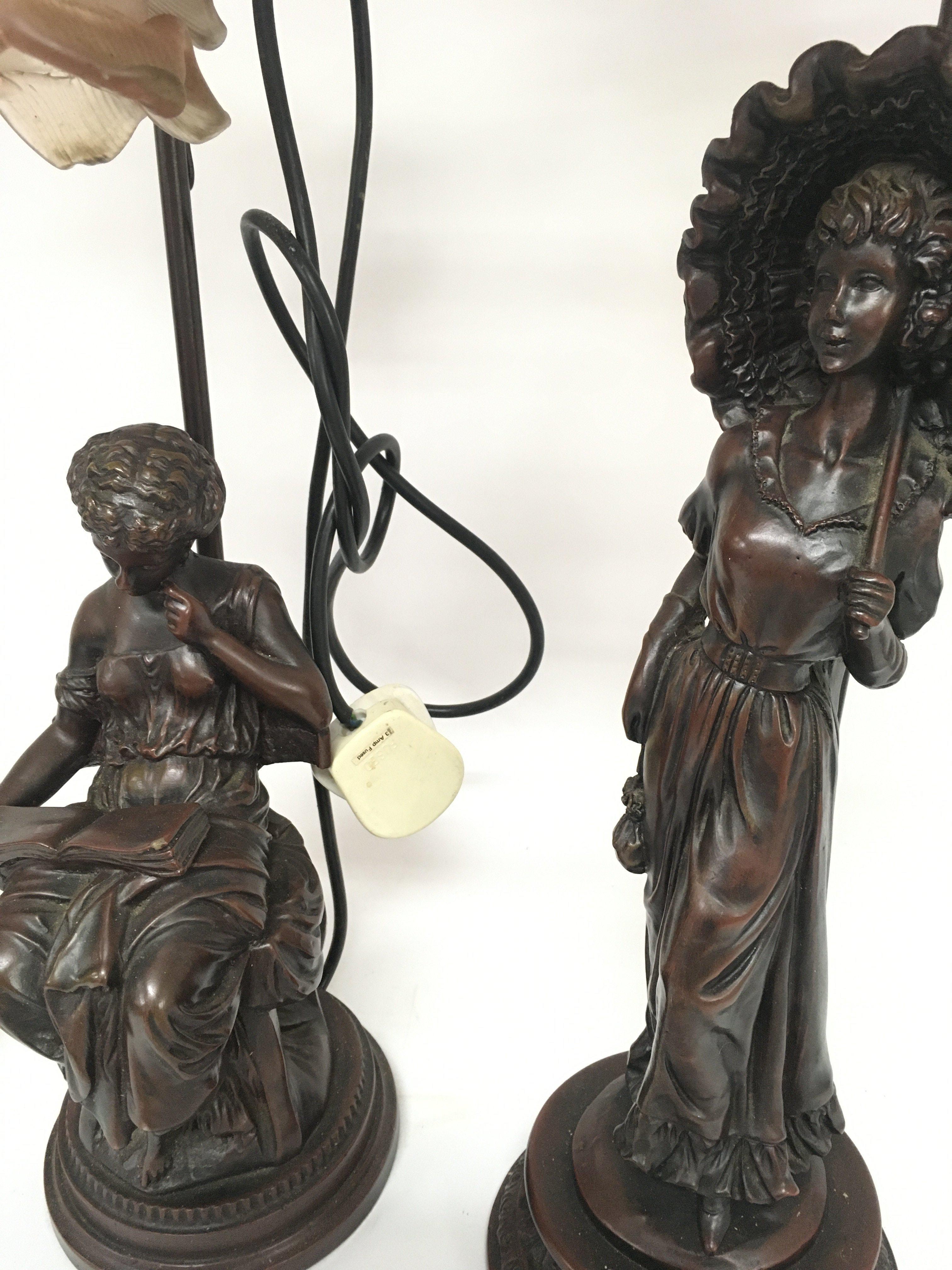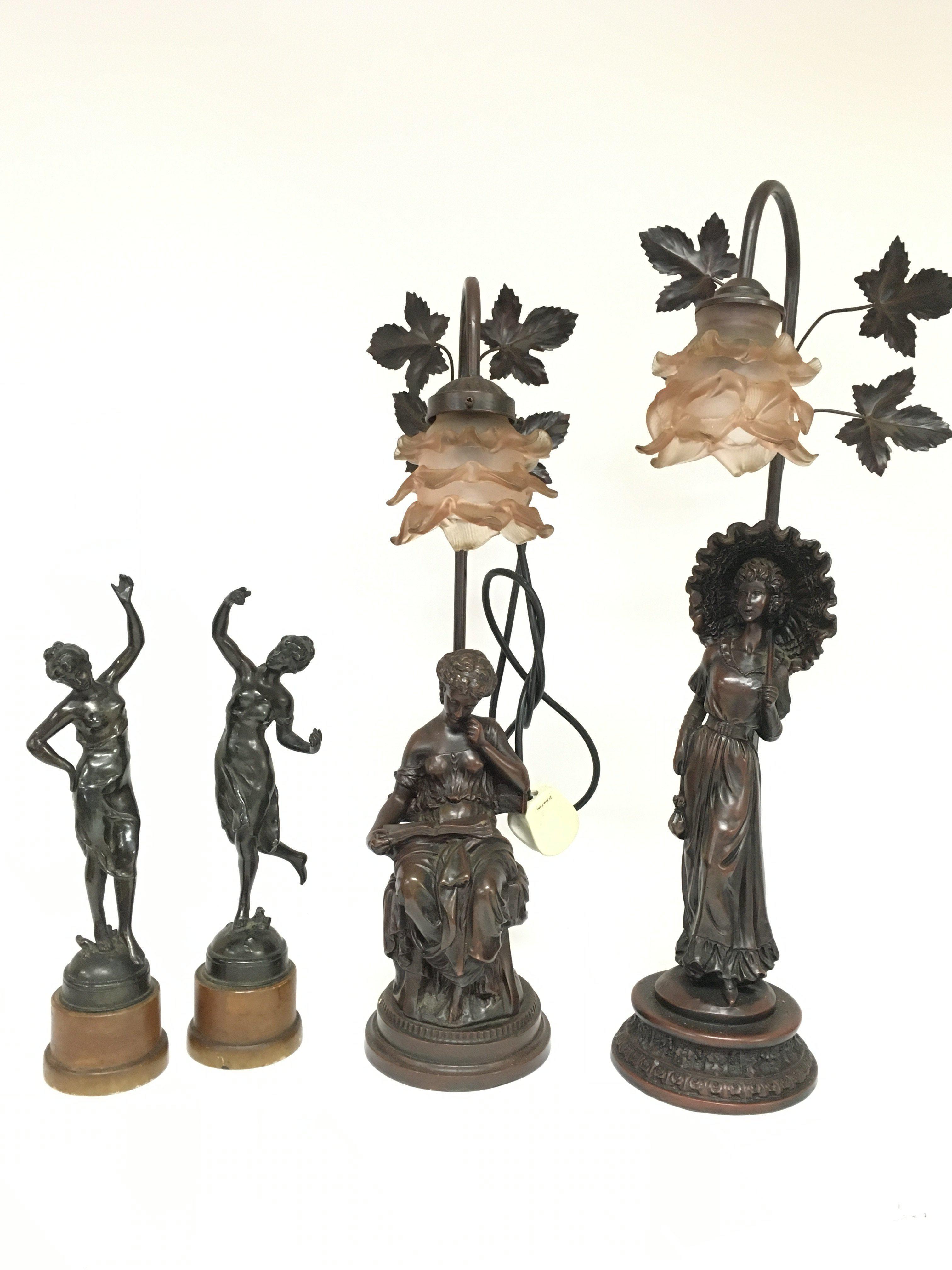 Art Nouveau style bronzed spelter lady figures including lamps. 35 and 62cm tall. This lot cannot be posted