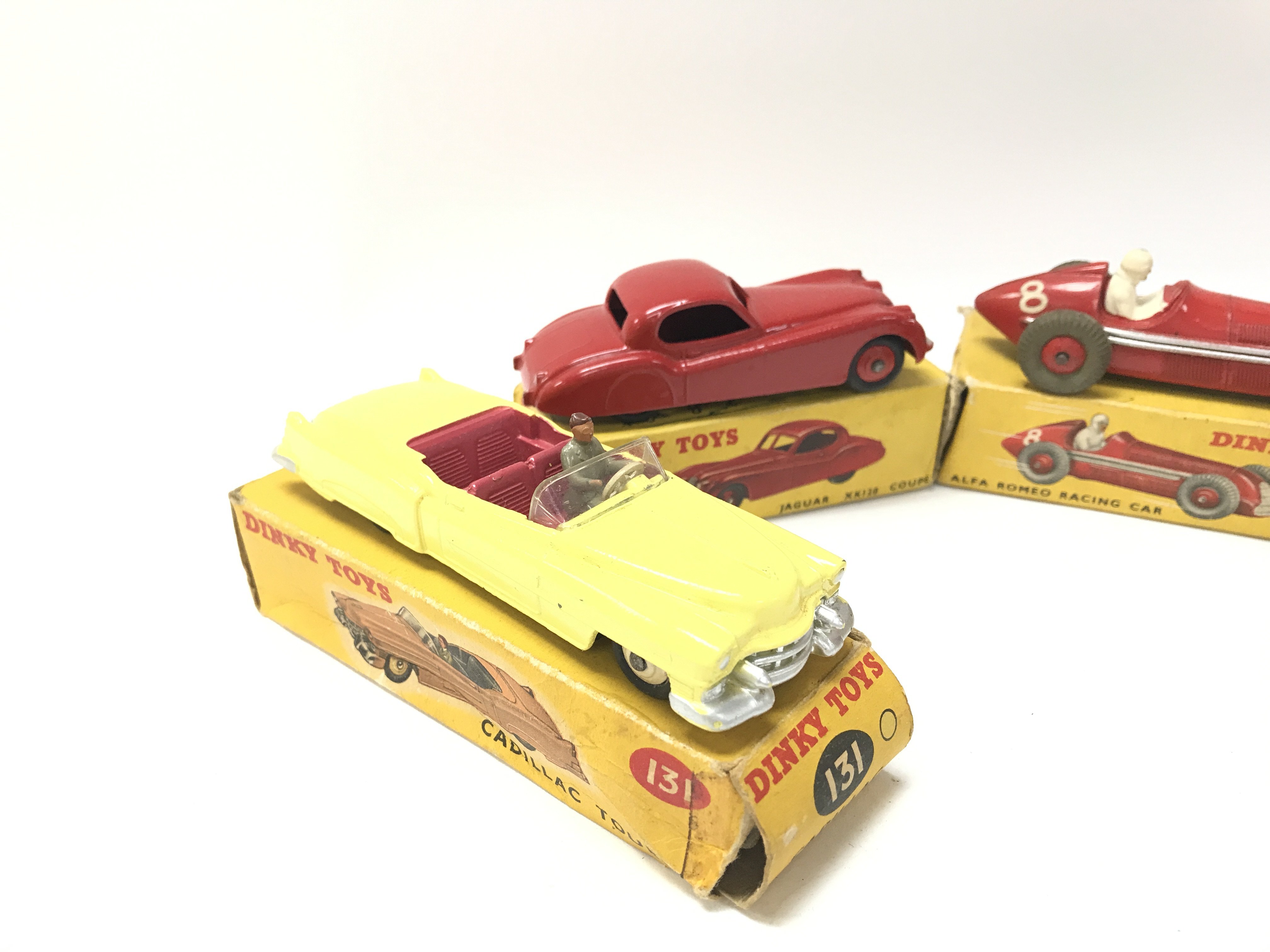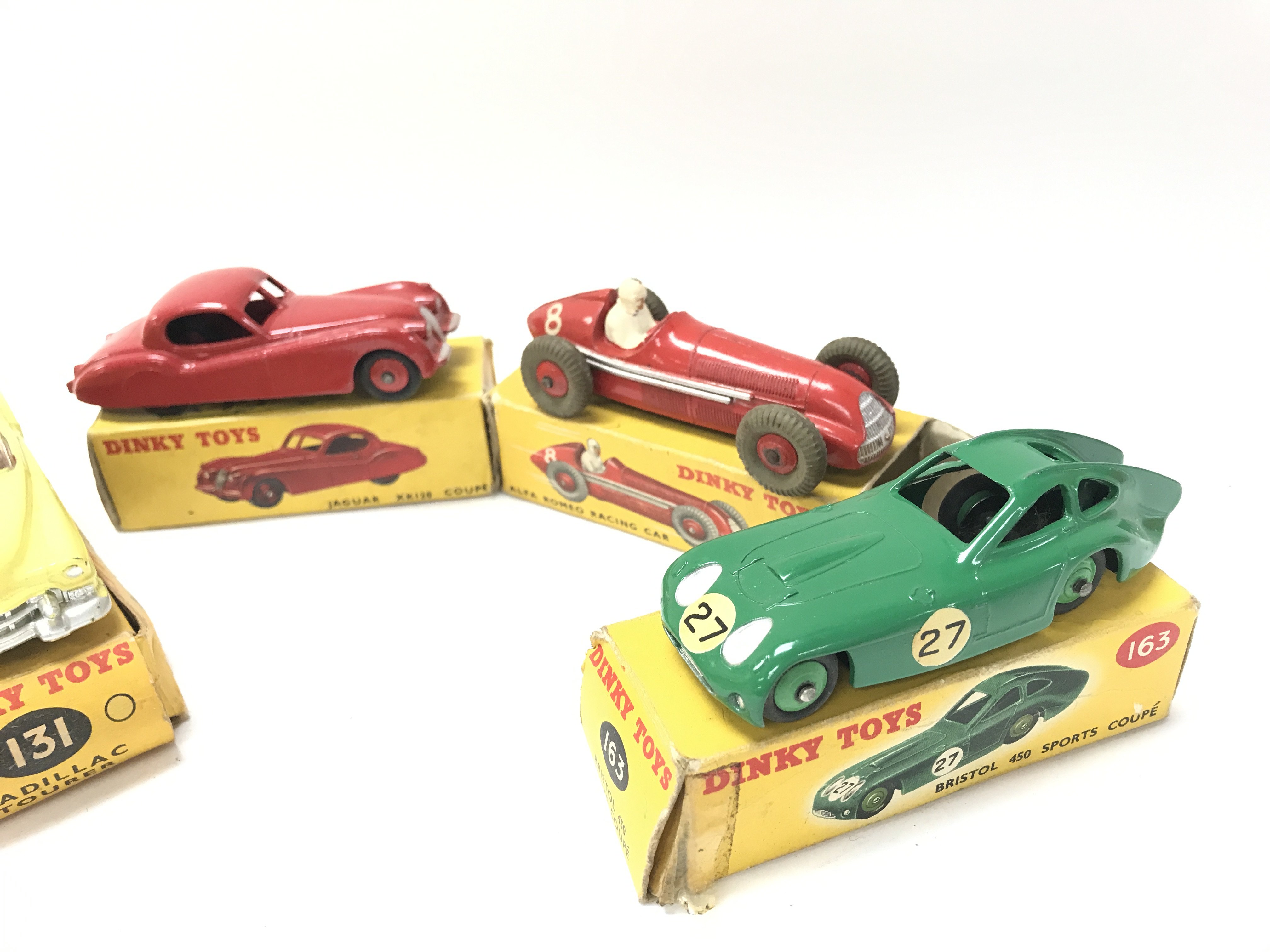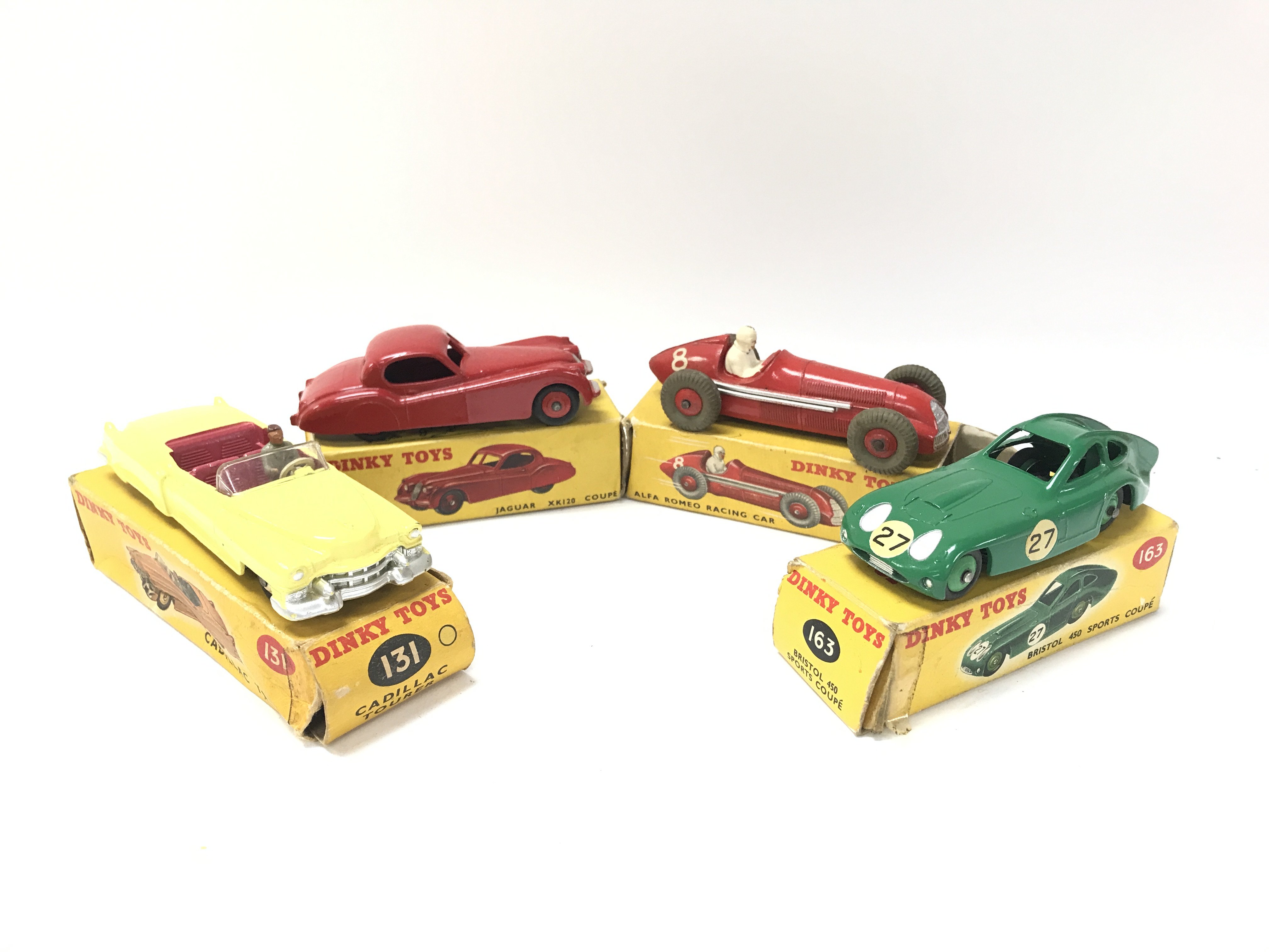 4 Boxed Dinky Vehicles. A Cadillac Tourer #131 a Jaguar XR120 #157. A Alfa Romeo Racing Car #232 and a Bristol450 Sports Coupe #163. Box's In Various States.