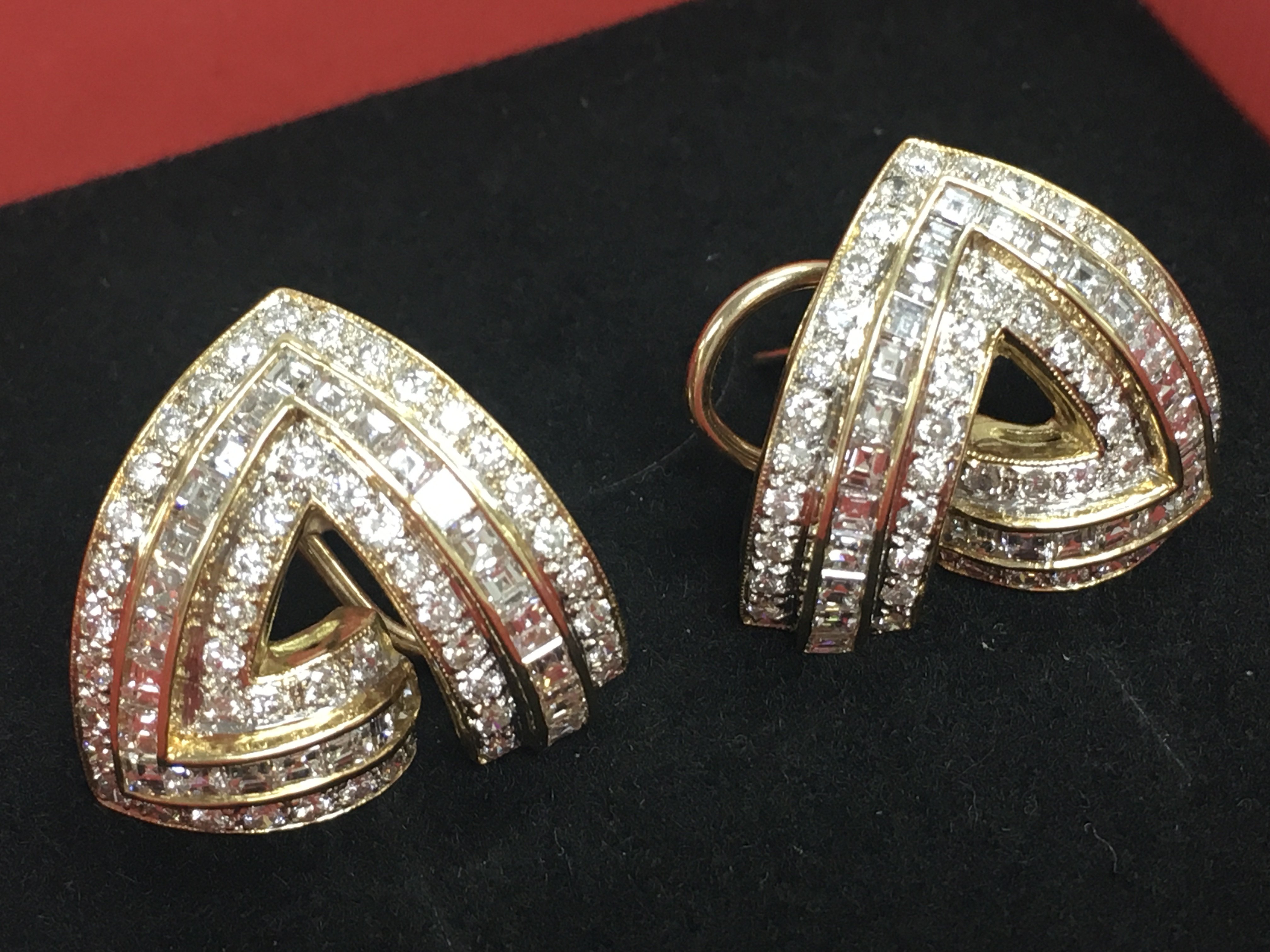 A pair of 14ct gold and diamond set earrings, postage cat A