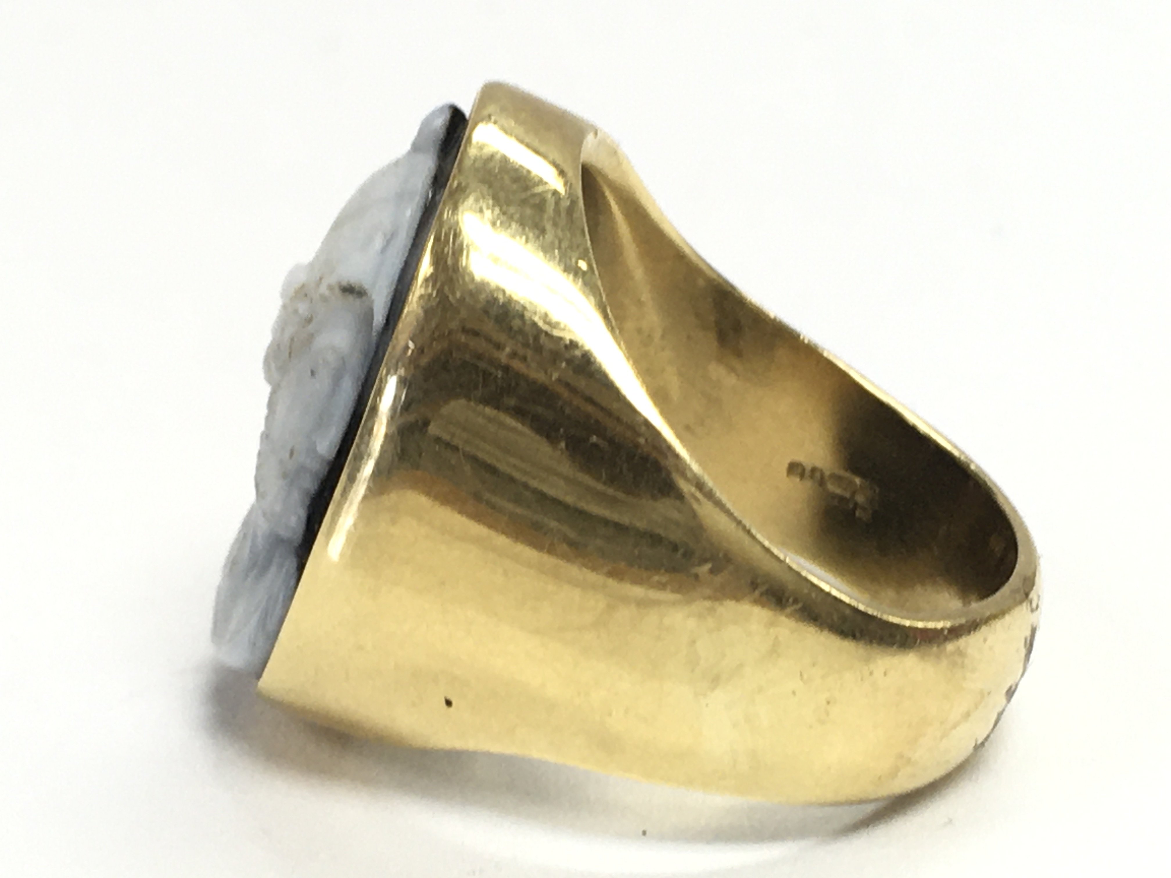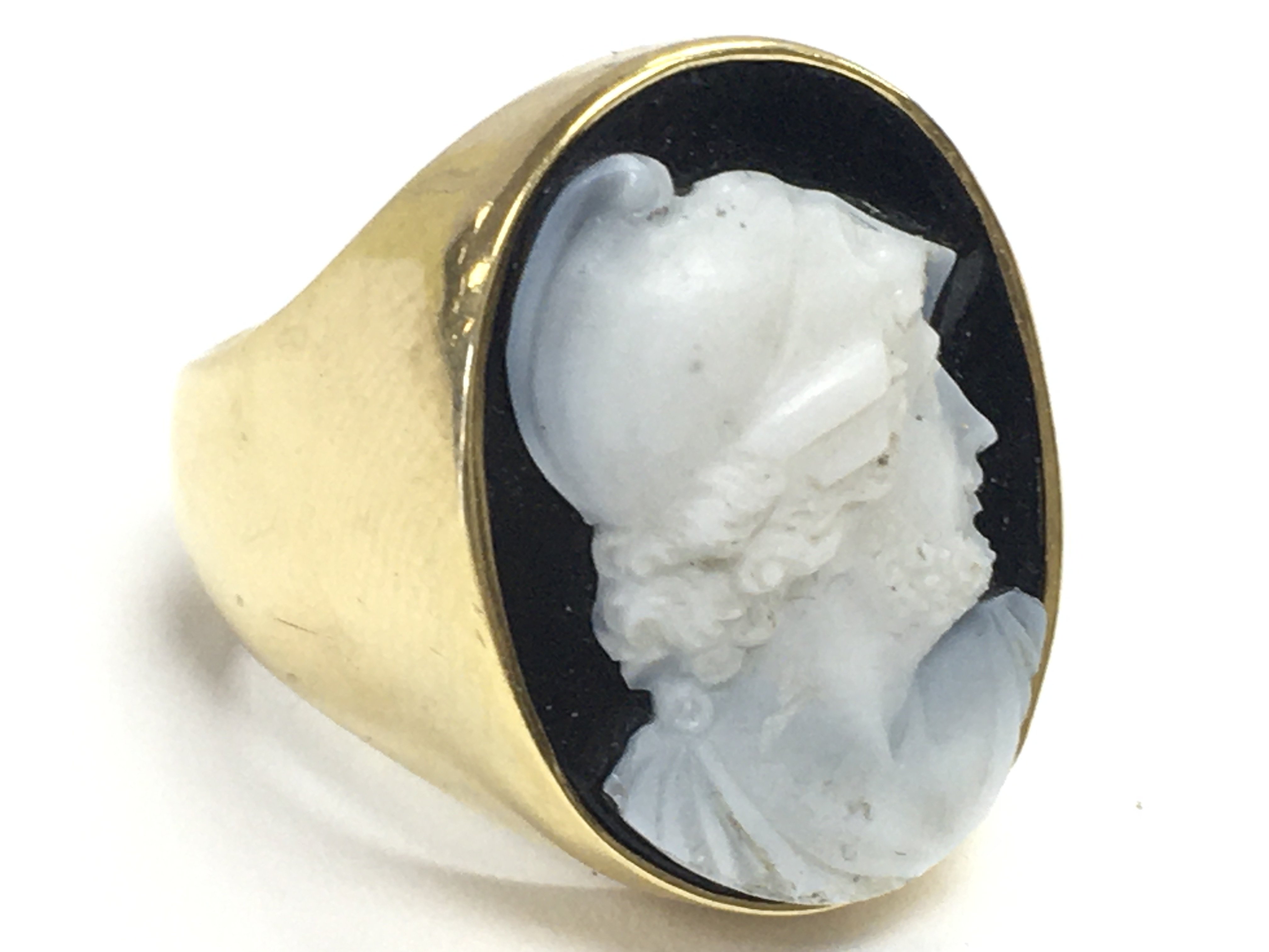 An 18 carat gold and sardonyx cameo ring. Size O. 15.7g Postage category A